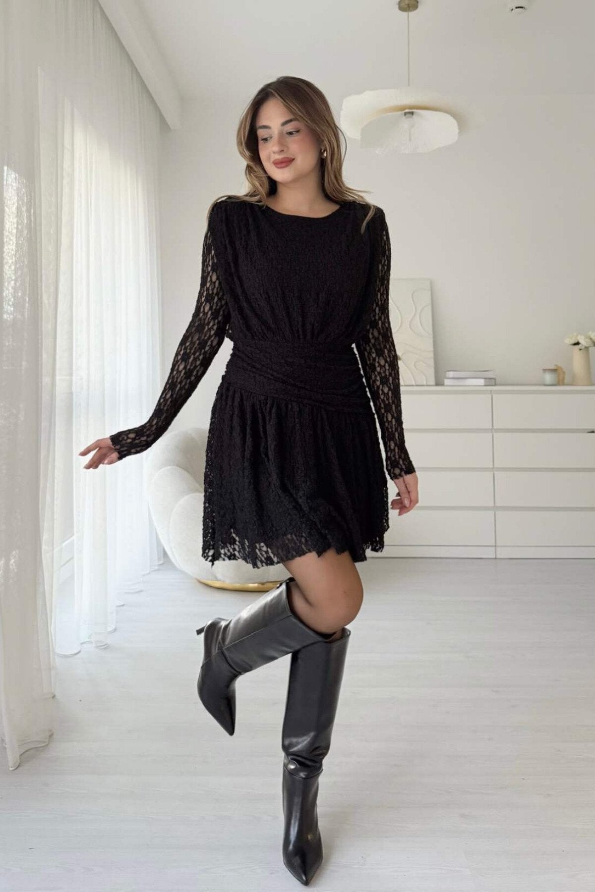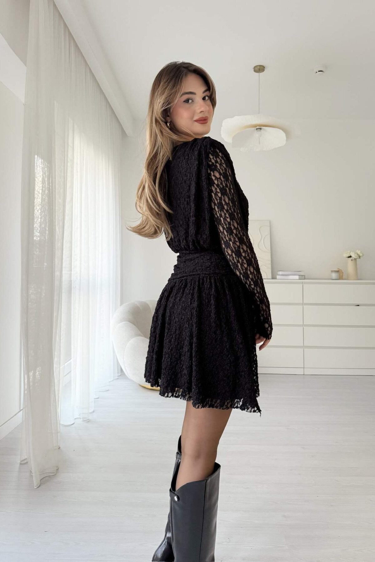 - The delicate guipure lace construction provides a rich, tactile feel that elevates the standard little black dress into a high-fashion wardrobe staple.