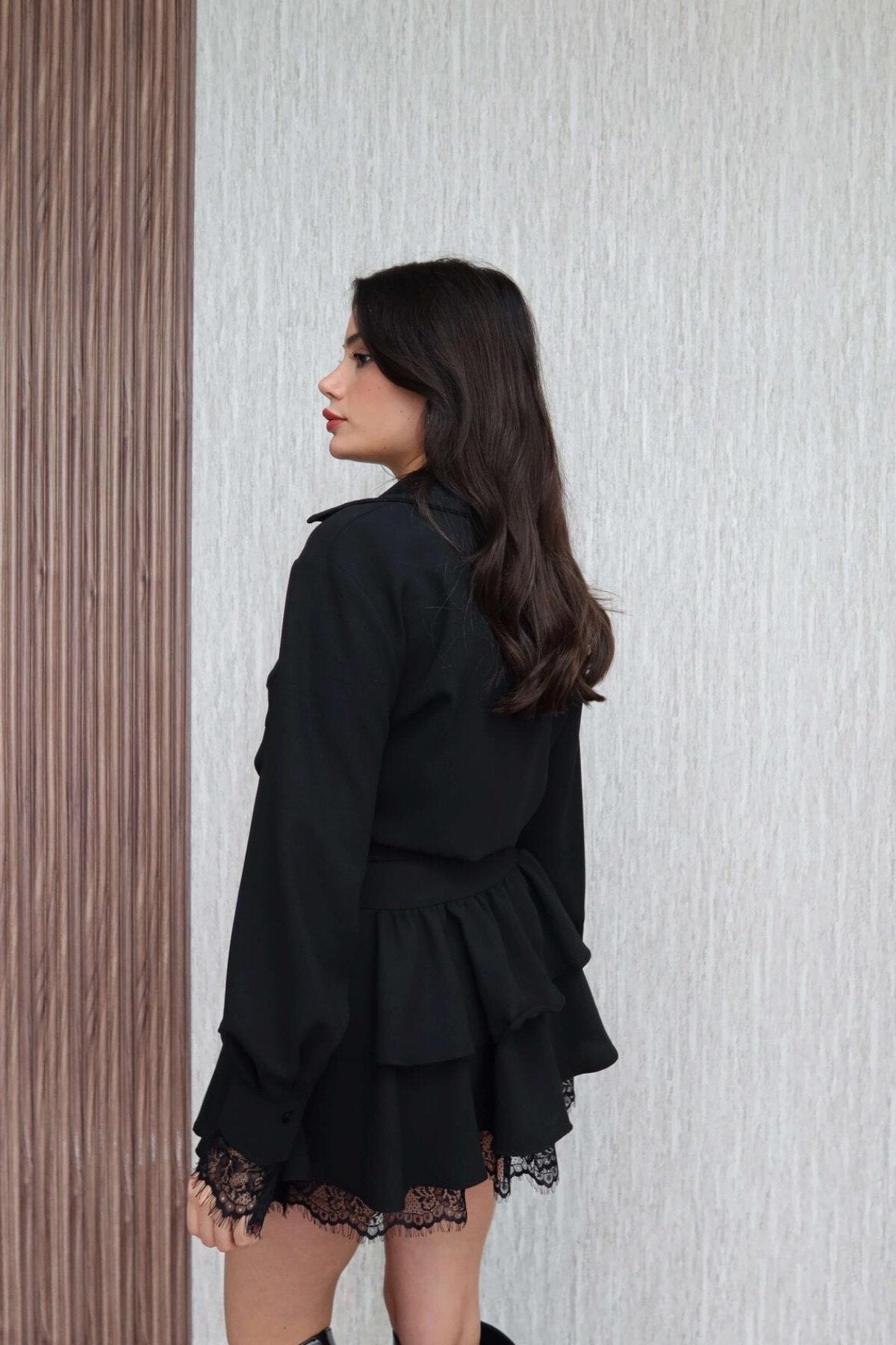 Mini Lace Shirt-Collar Detail Dress - Black