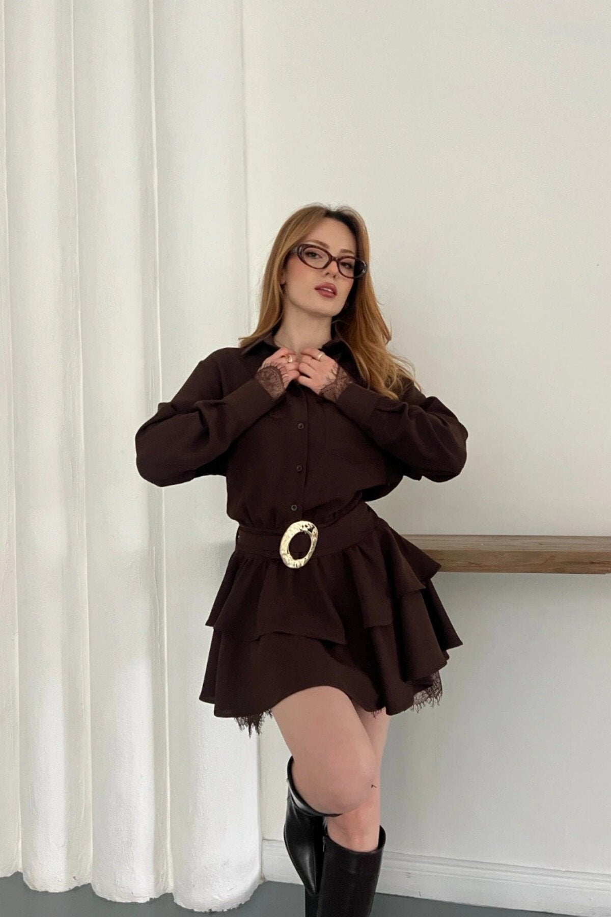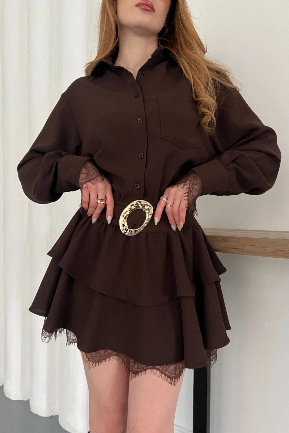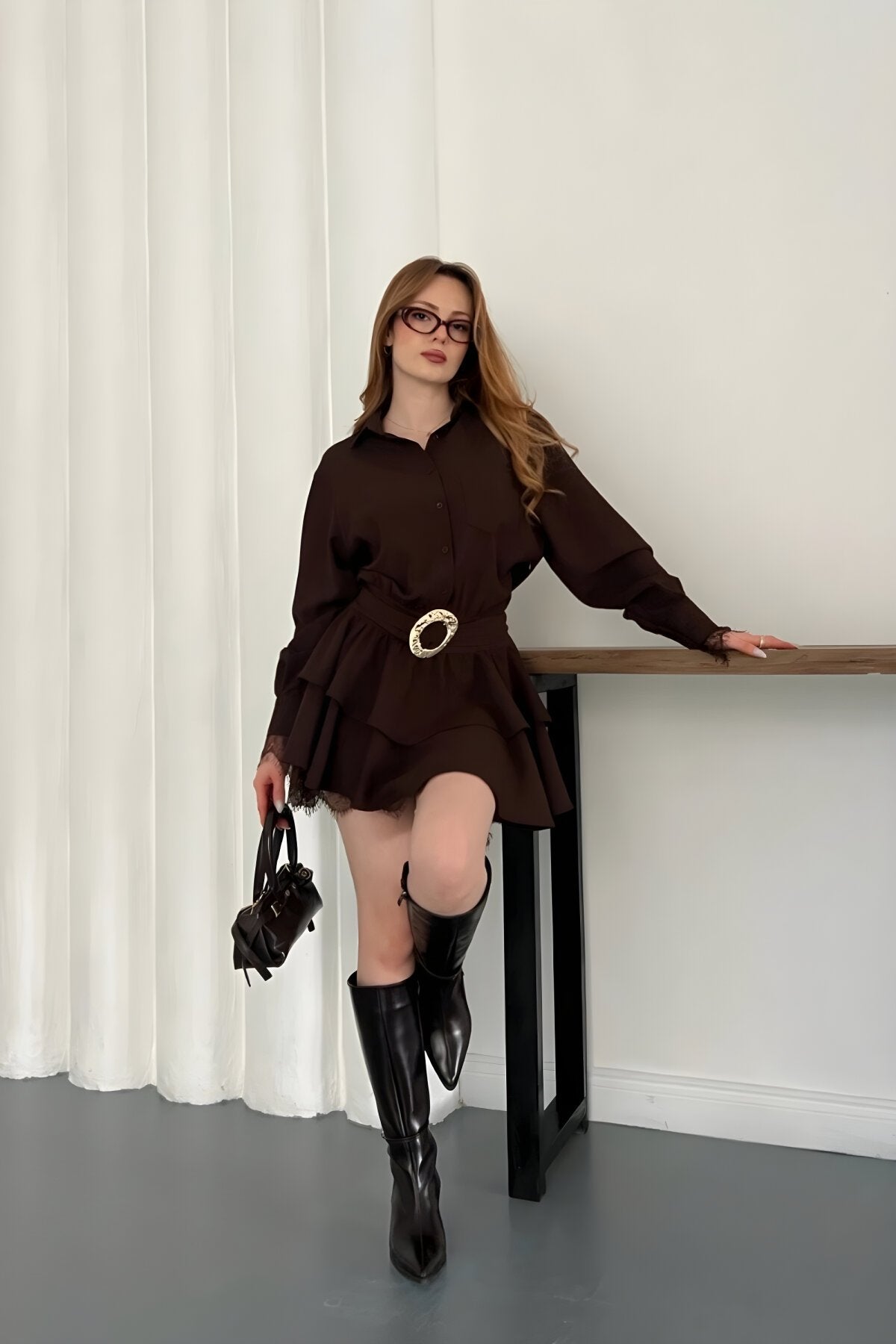 Mini Lace Shirt Dress with Belt Accessory - Brown