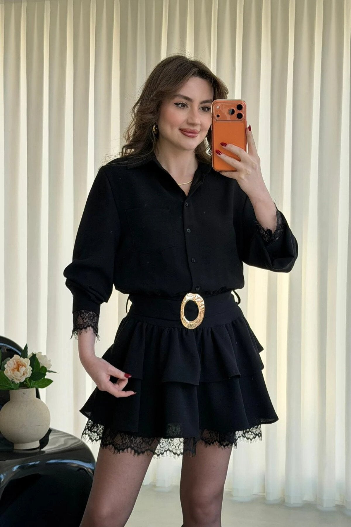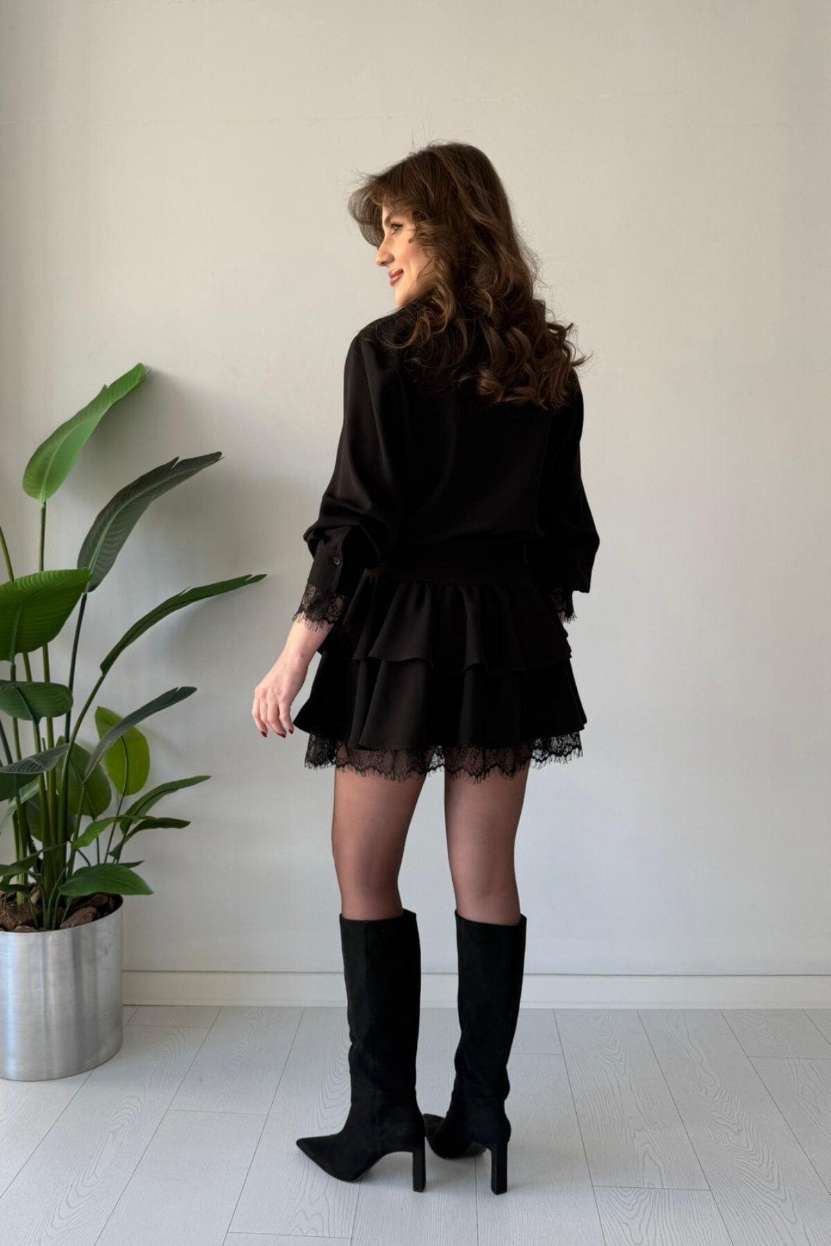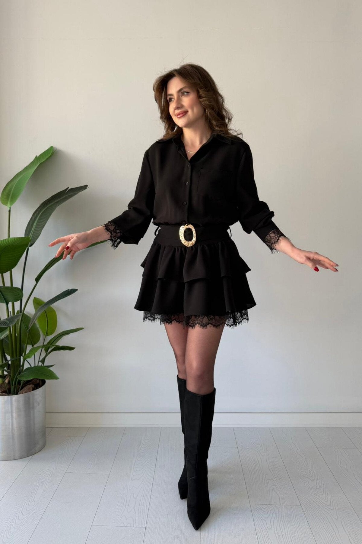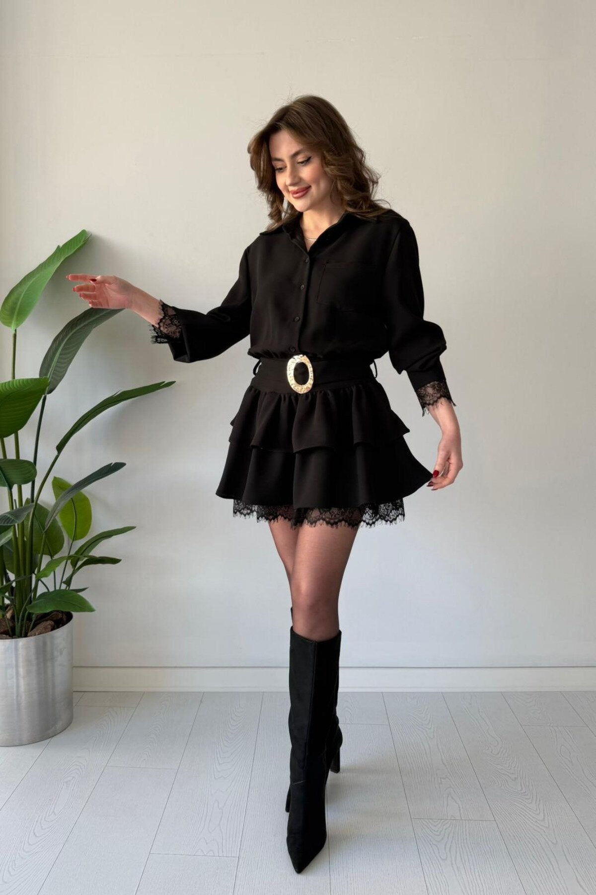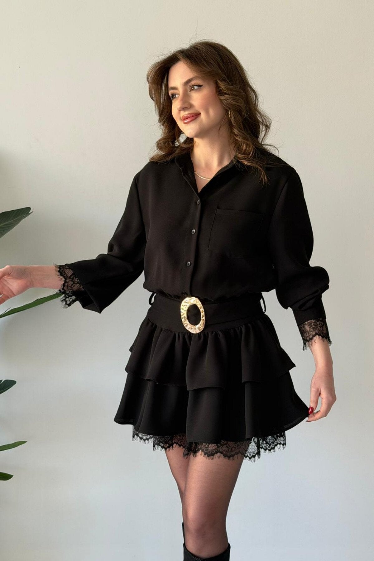 Mini Layered Shirt Belted Lace Trim Dress - Black