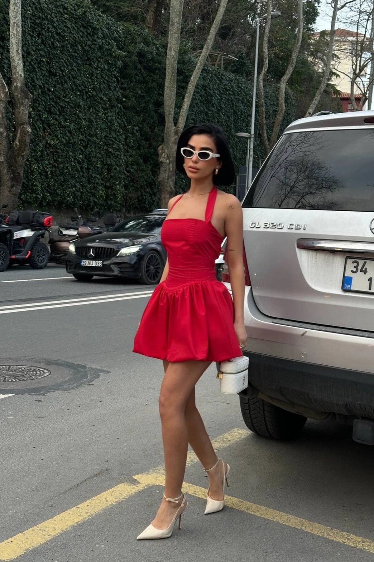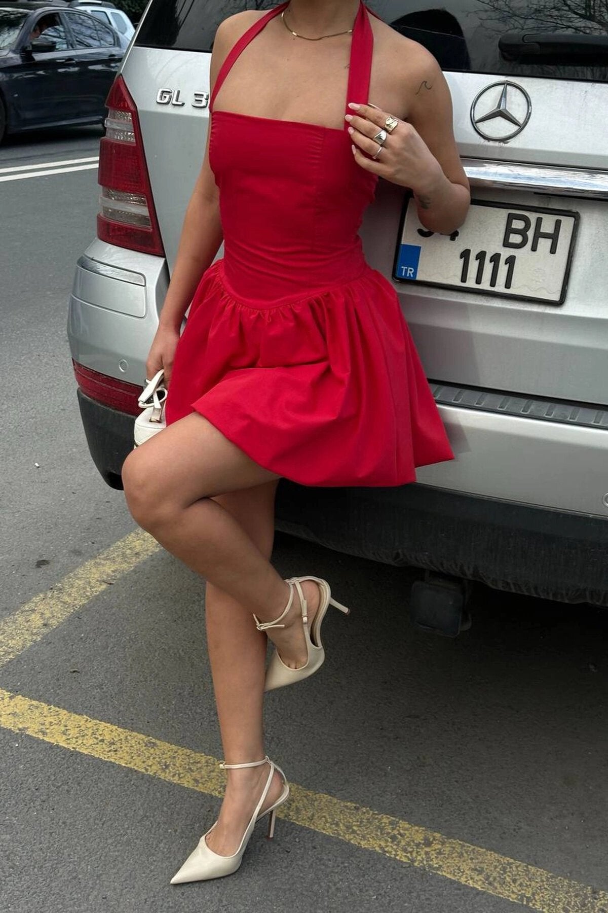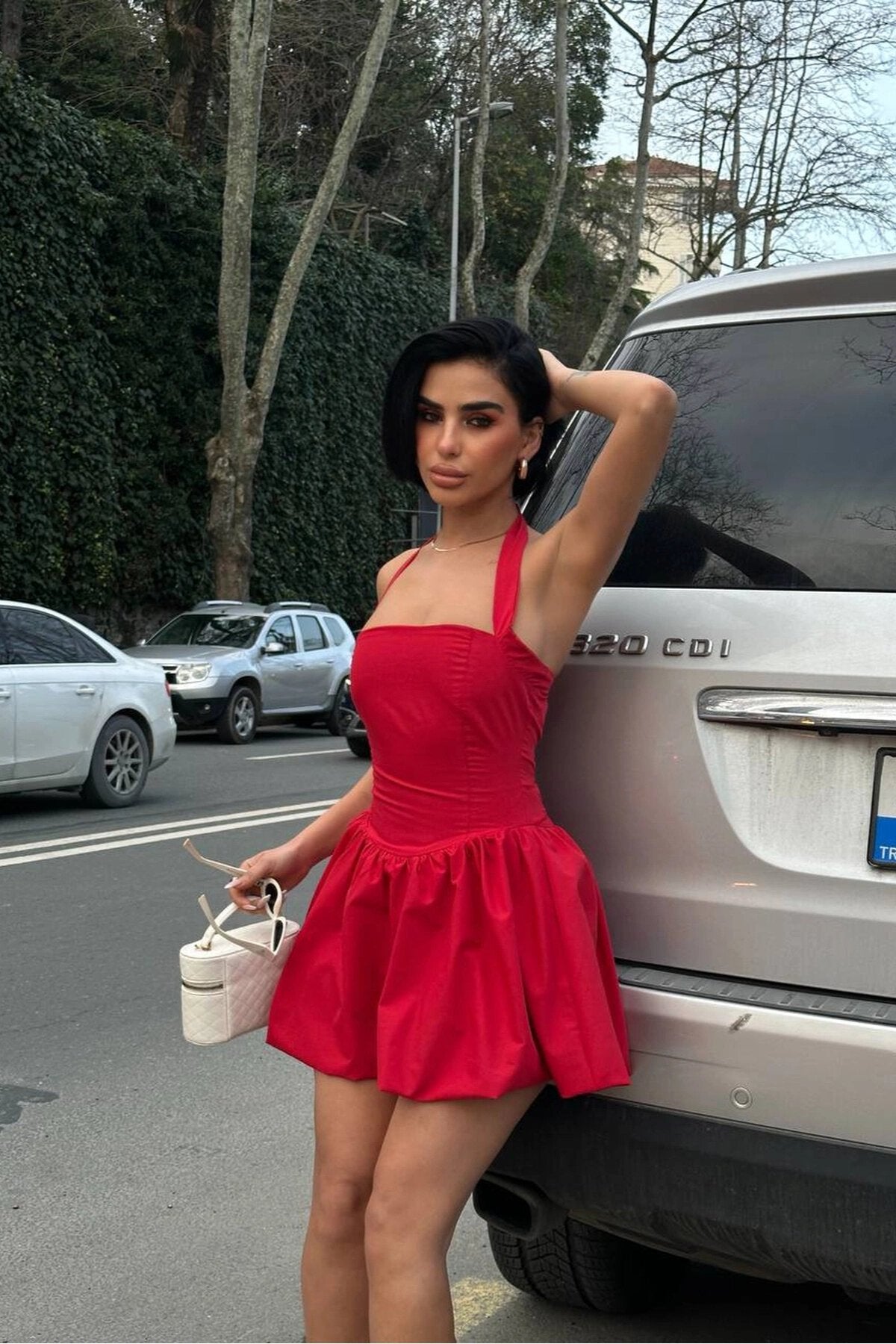 Make a striking statement in our Mini Lined Halter Square Neck Balloon Dress in vibrant red. This eye-catching piece masterfully blends a sophisticated, form-fitting bodice with a whimsical balloon skirt, creating a silhouette that is both modernly chic and timelessly feminine.