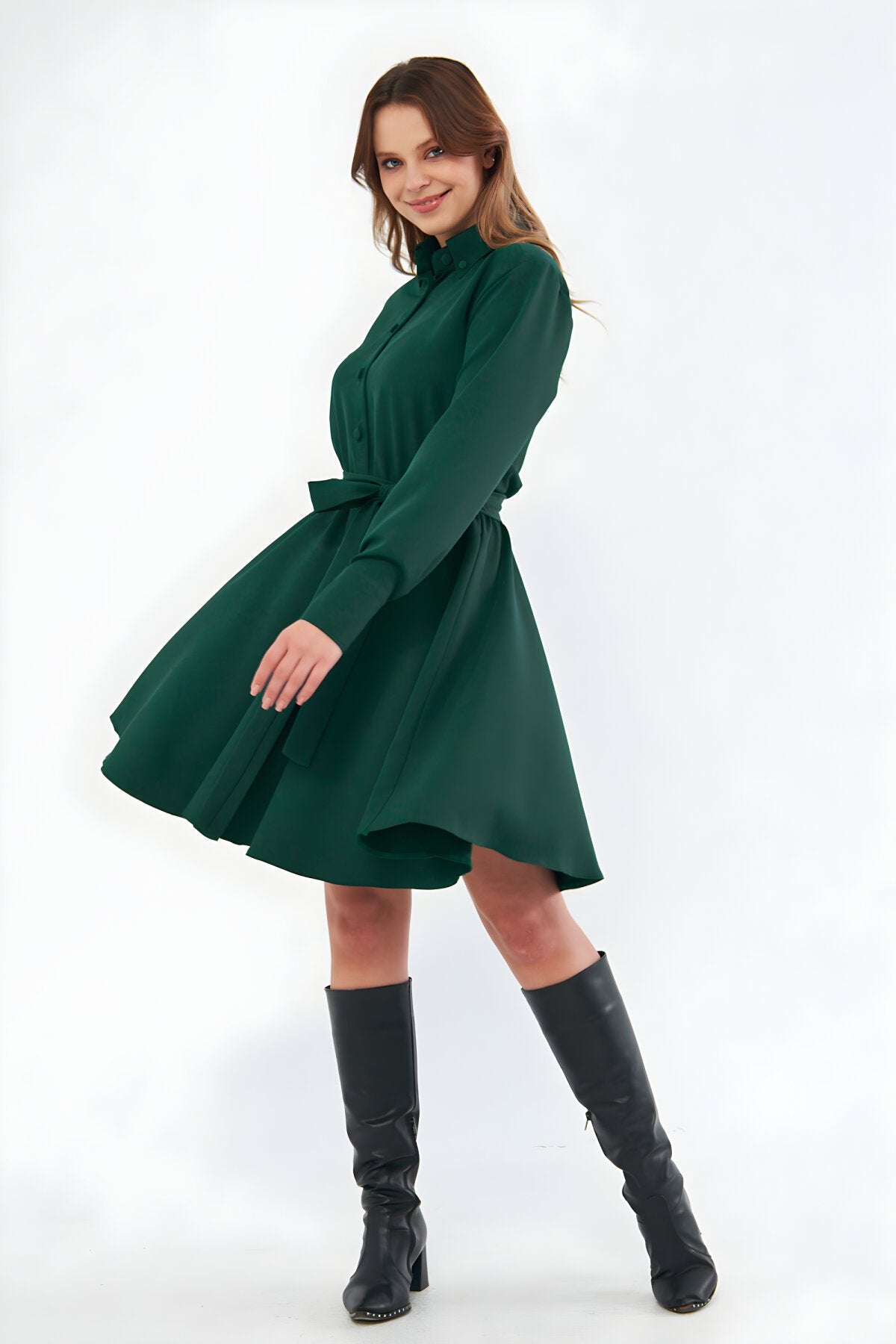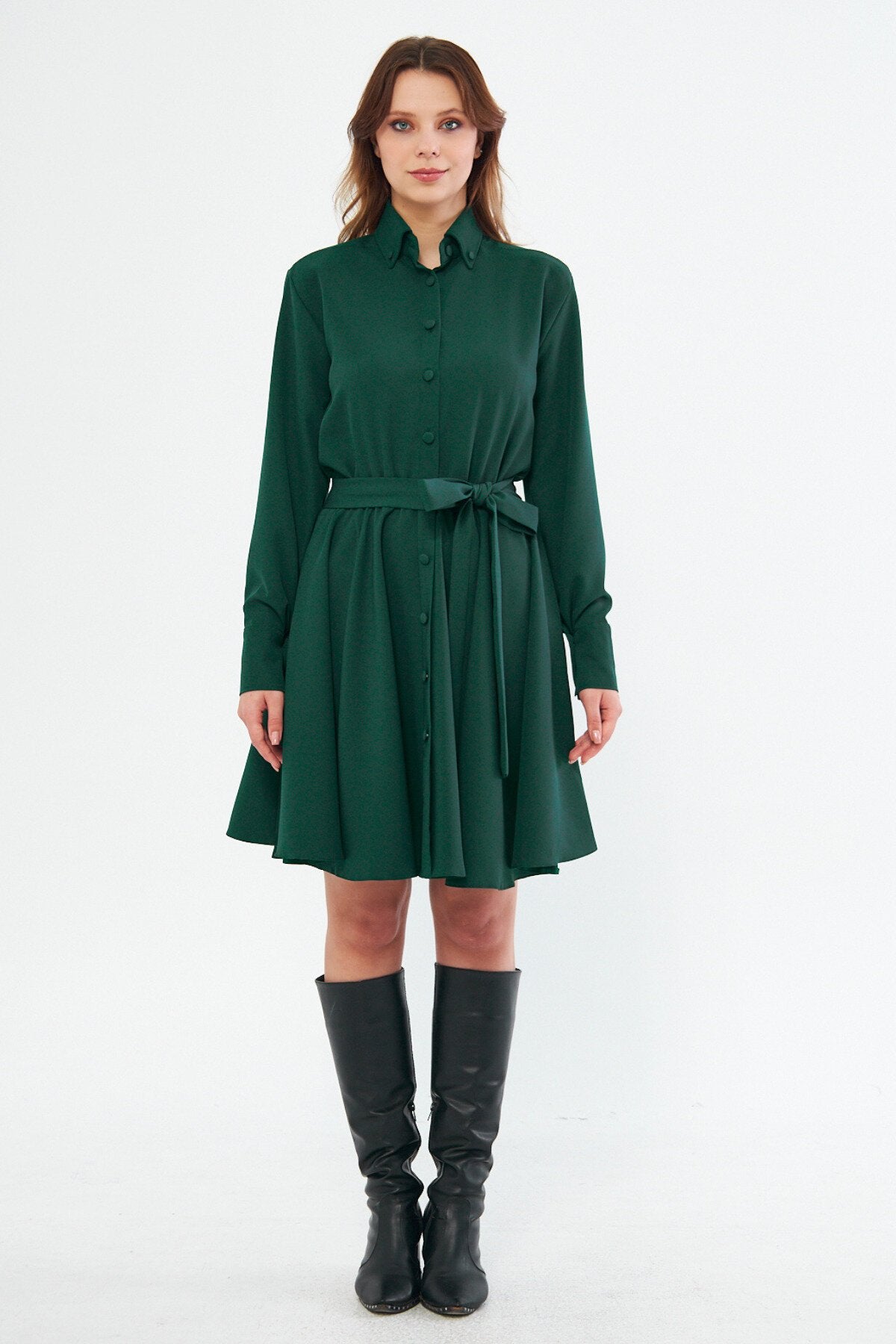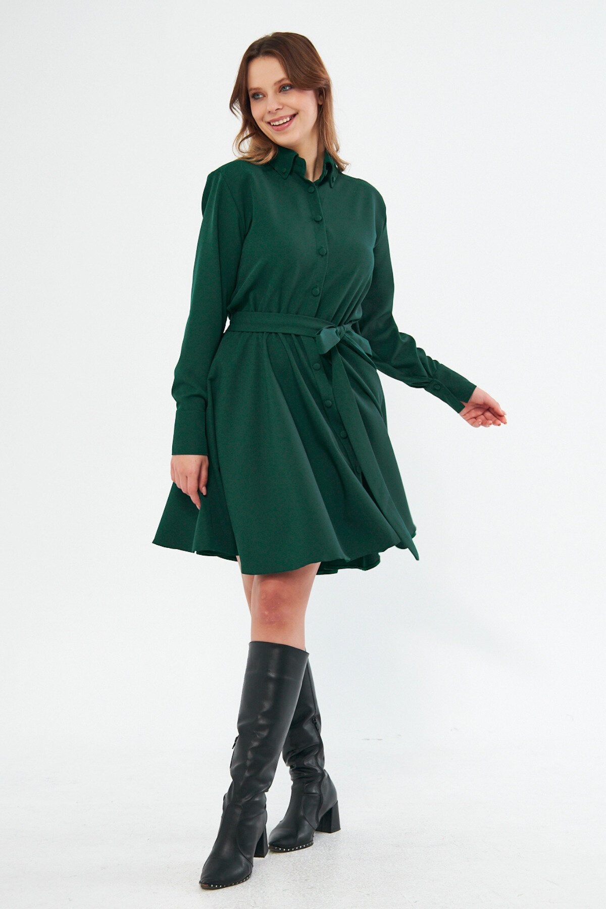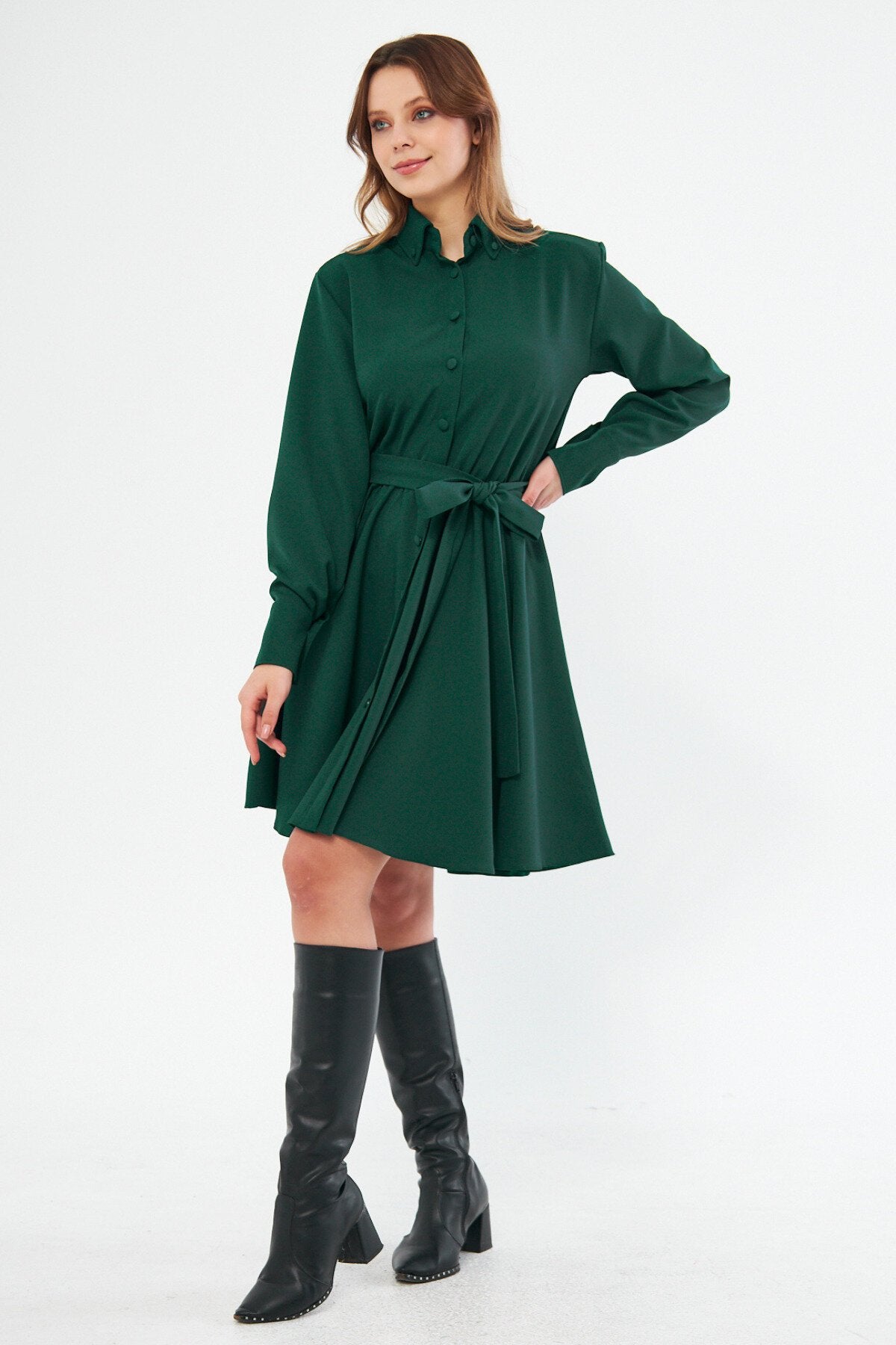 Mini Long Sleeve Woven Elastic Waist Belted Shirt Dress - Emerald