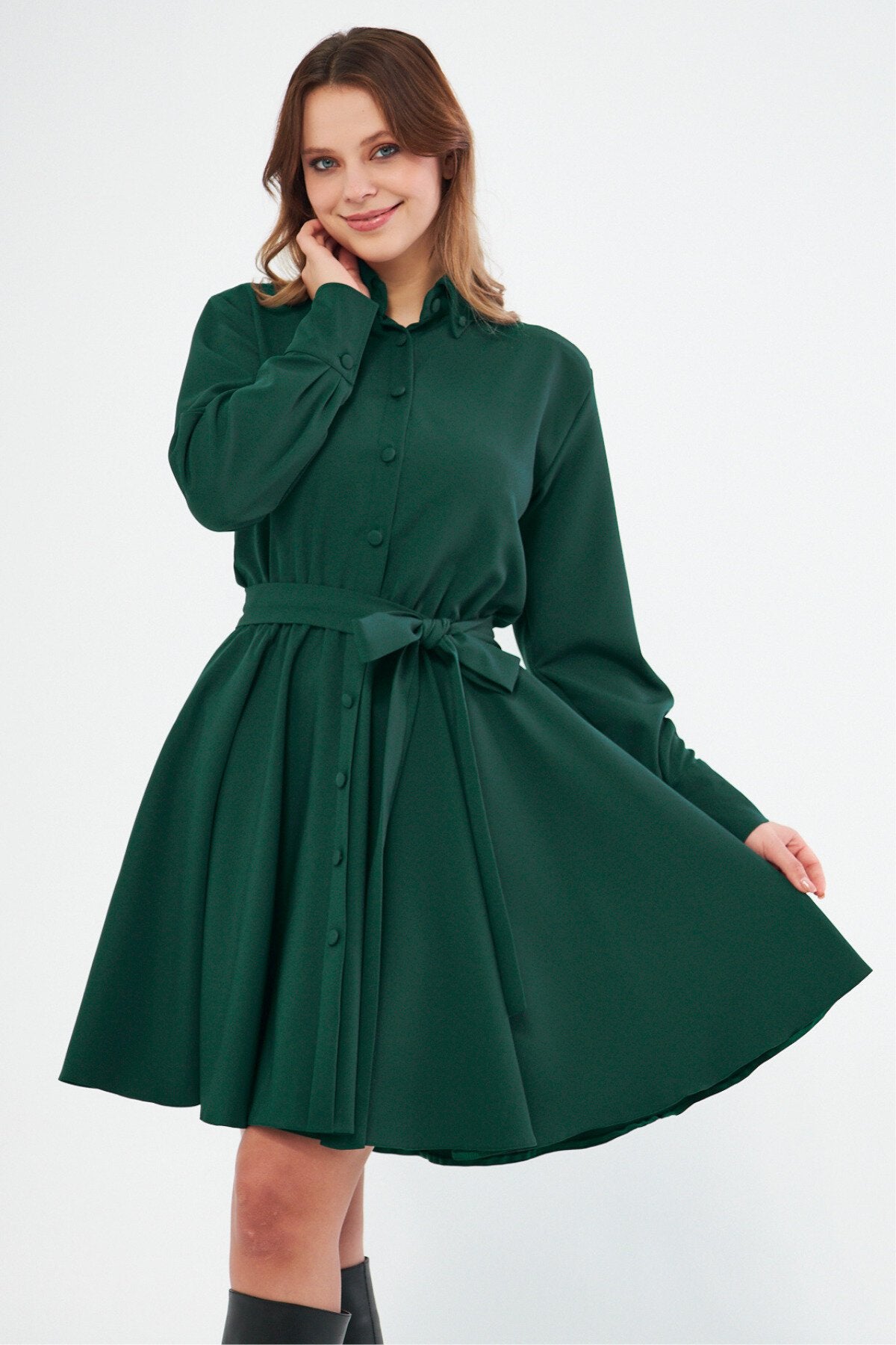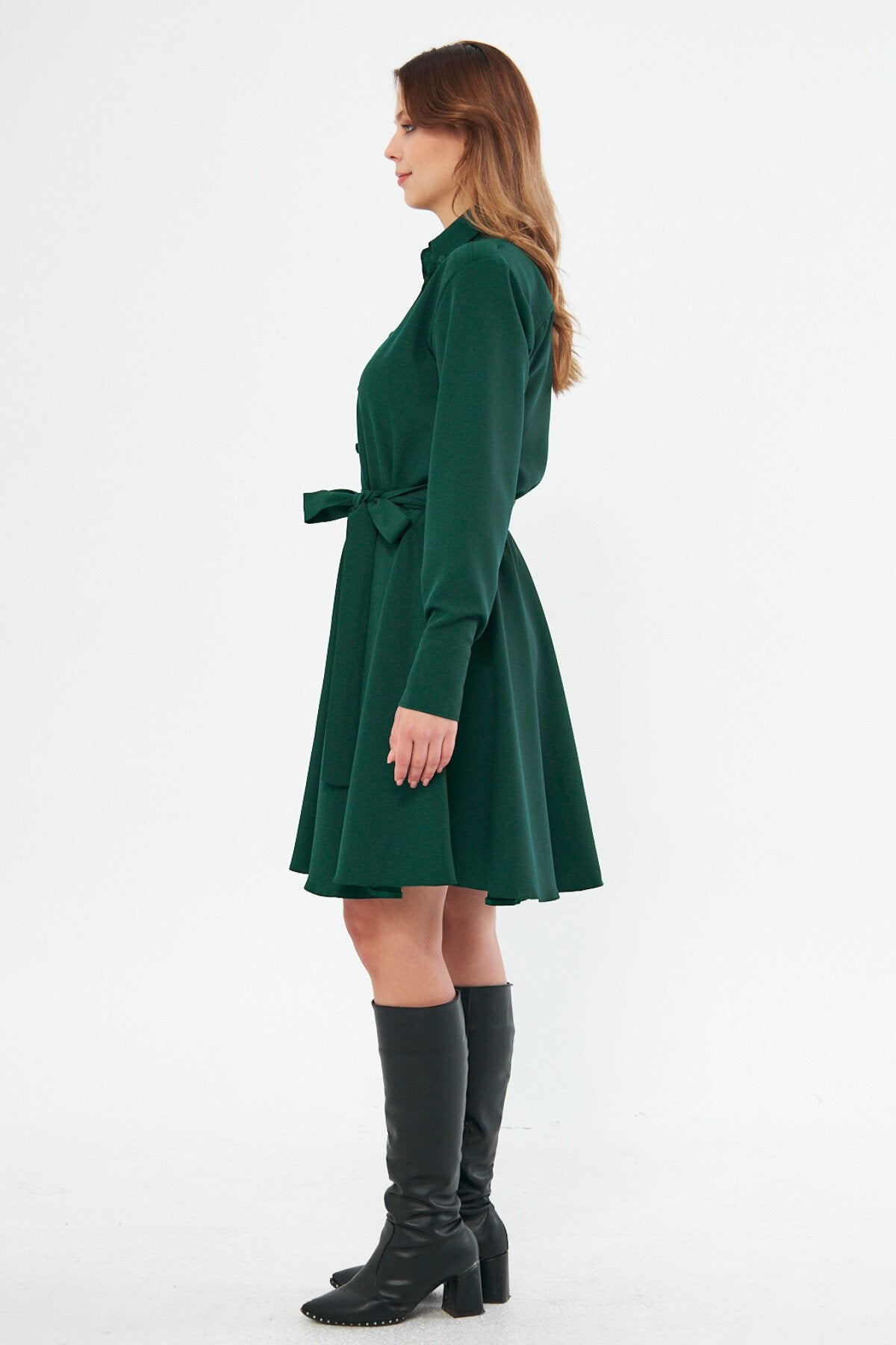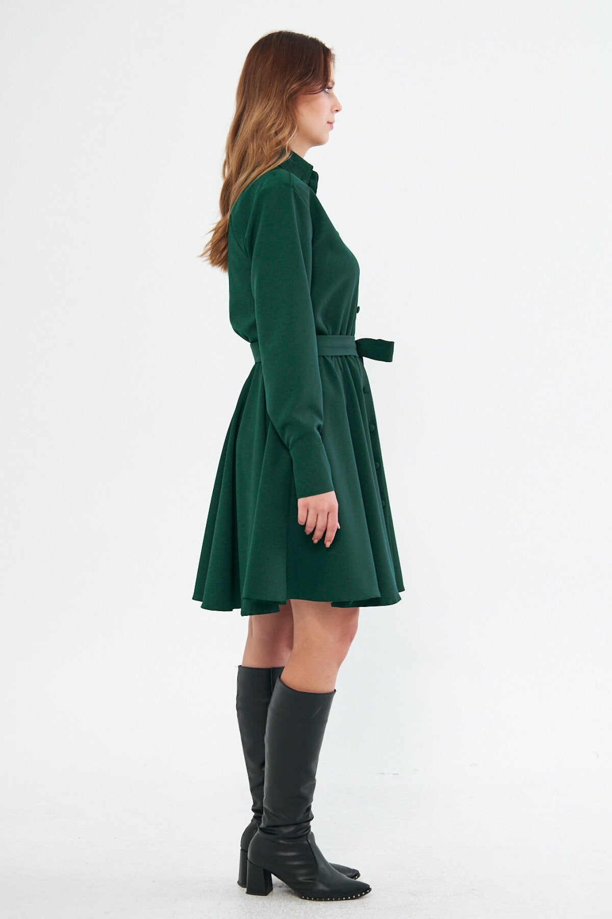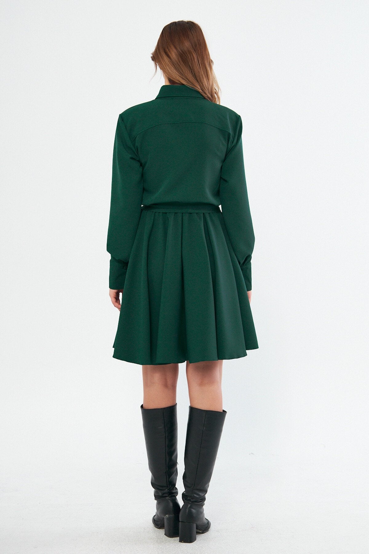 Mini Long Sleeve Woven Elastic Waist Belted Shirt Dress - Emerald