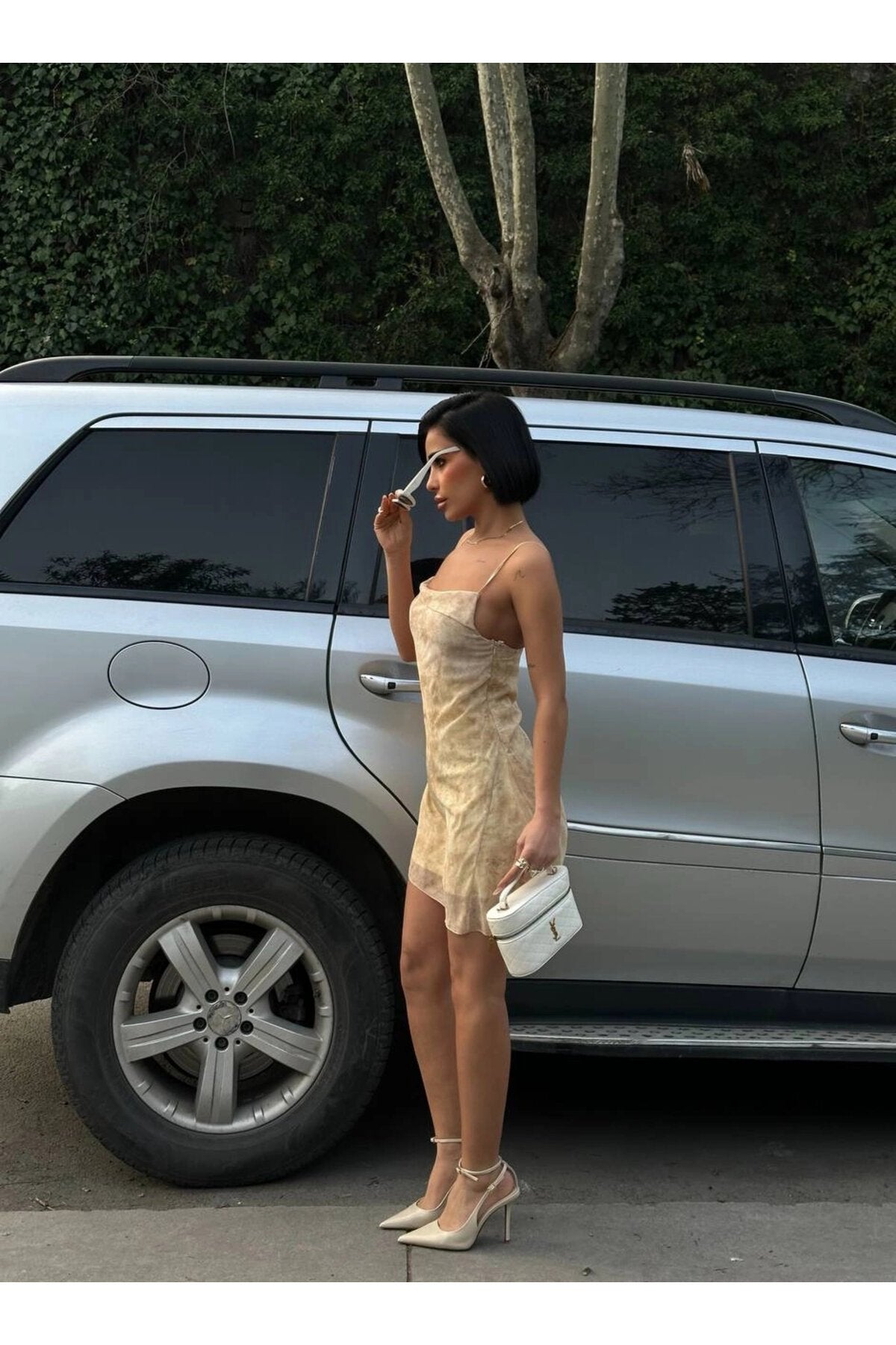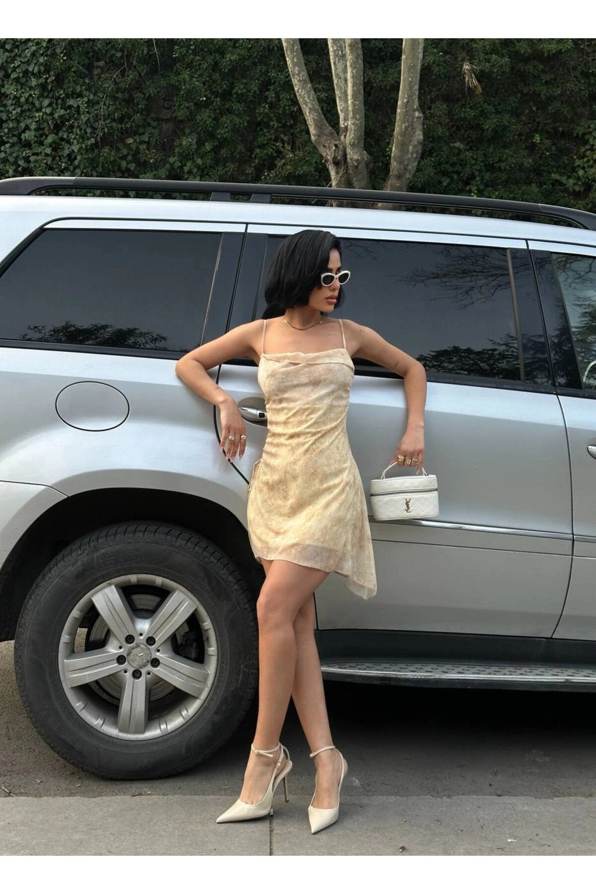 - For a coordinated, high-fashion look, style it with a white structured handbag and retro-inspired sunglasses, making it the perfect ensemble for a fashionable city stroll or a weekend getaway.