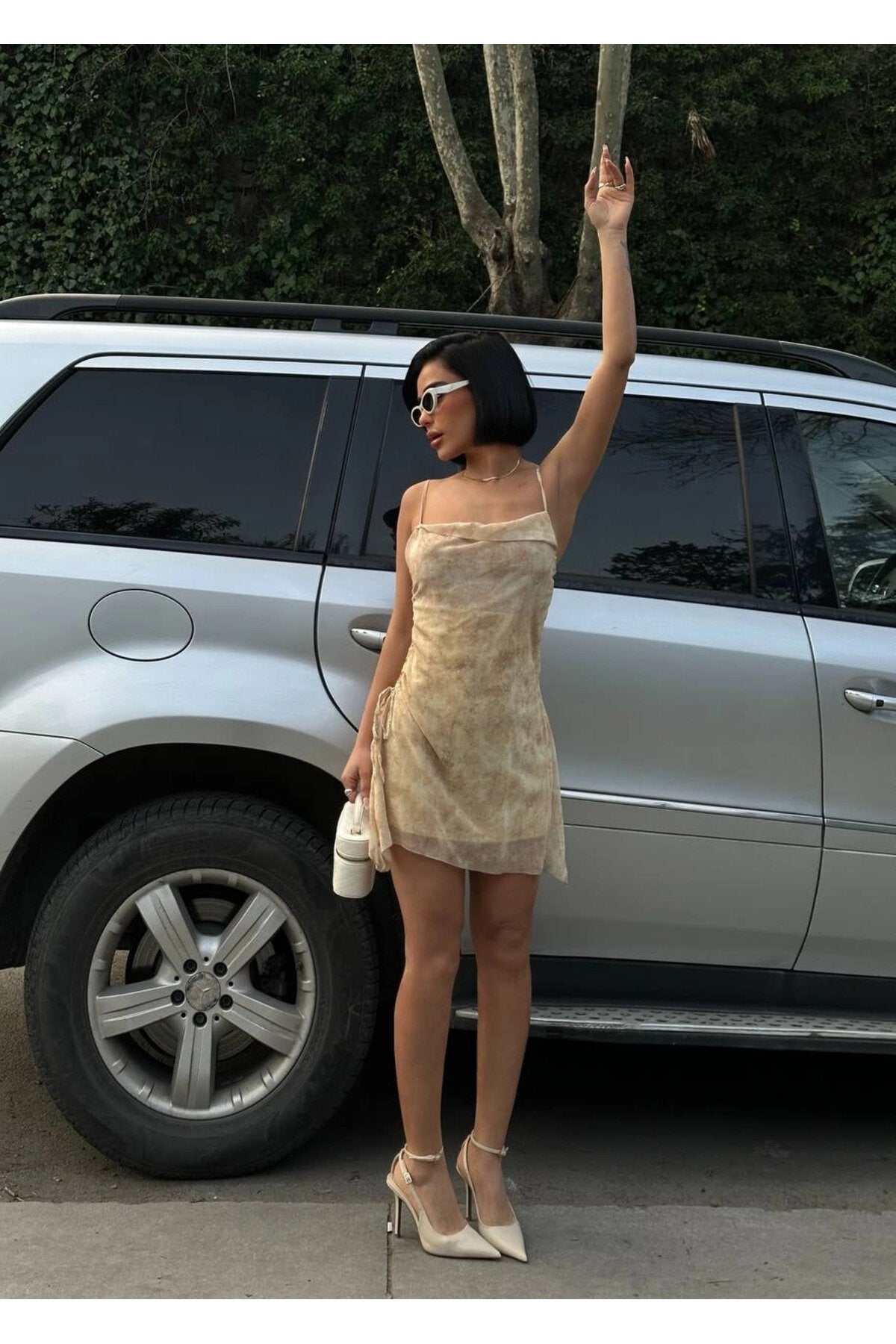 - The dress features ultra-thin spaghetti straps and a soft, watercolor-inspired beige pattern that offers a unique artistic flair, blending neutral tones for a versatile and chic appearance.