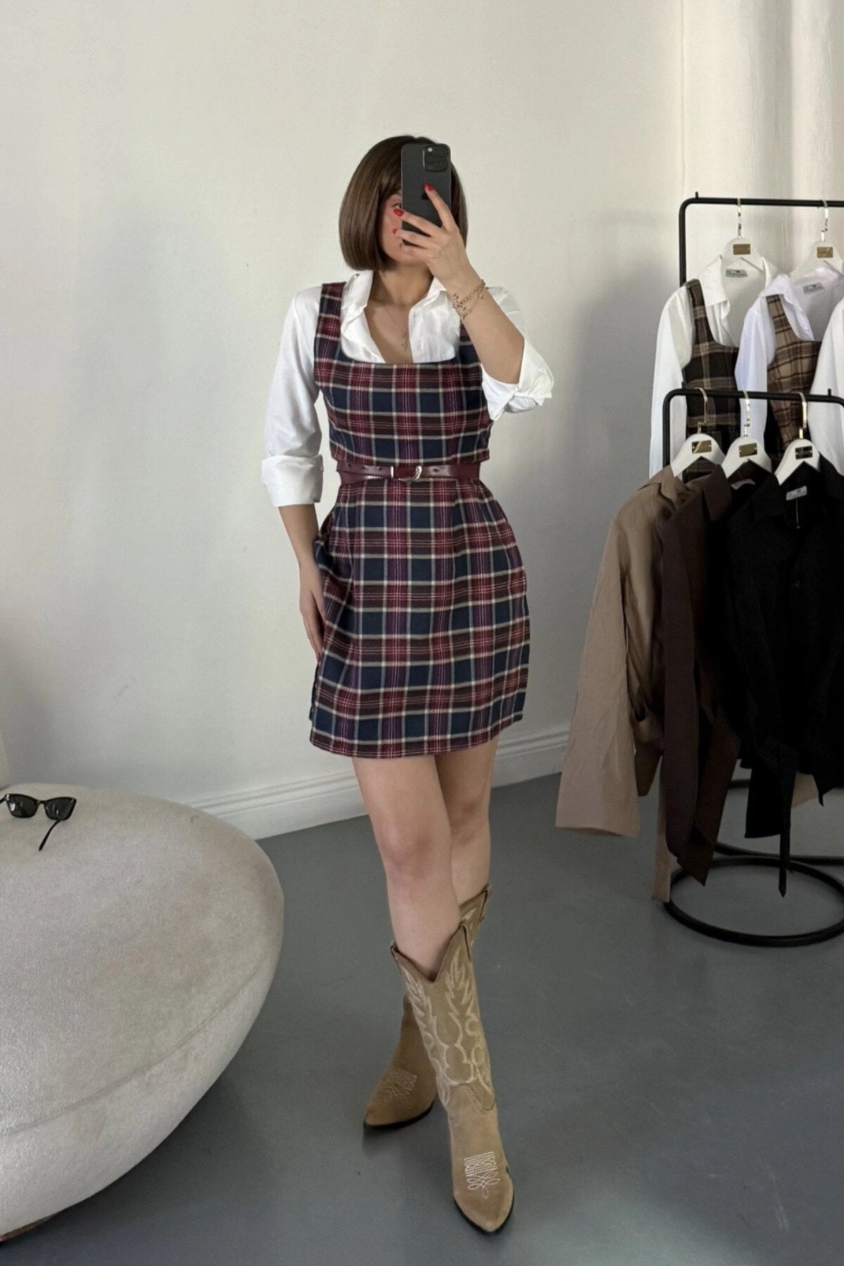 Mini Plaid Thick Strap Shirt Dress - Burgundy