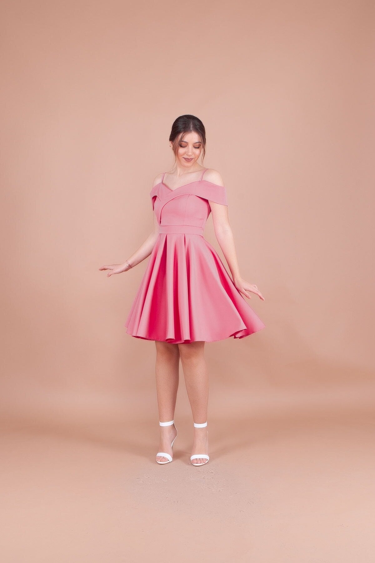 This stunning dusty rose evening dress combines romantic femininity with a modern silhouette to create a truly captivating look. Its fit-and-flare design highlights your waist while the mini length adds a playful, youthful charm perfect for any celebratory occasion.
