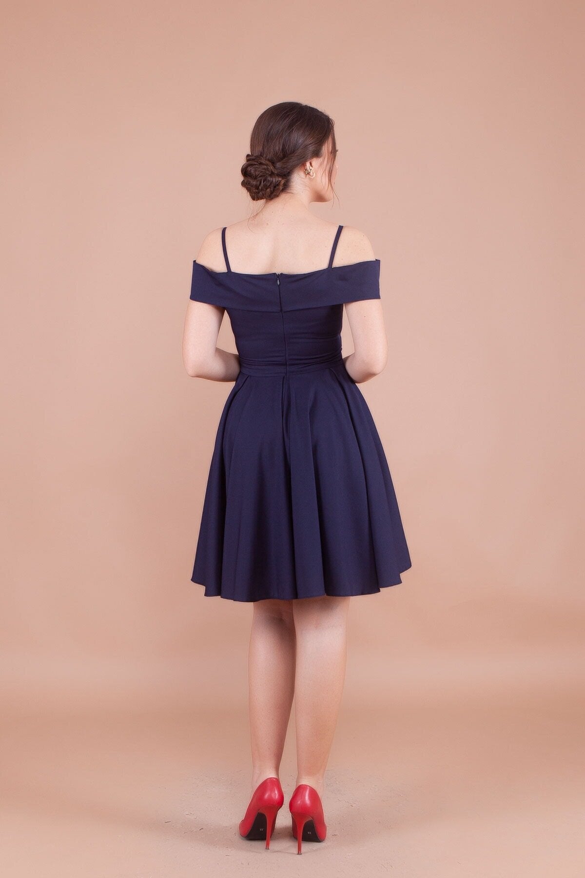 Mini Pleated Strapped Off-the-Shoulder Evening Dress - Navy Blue