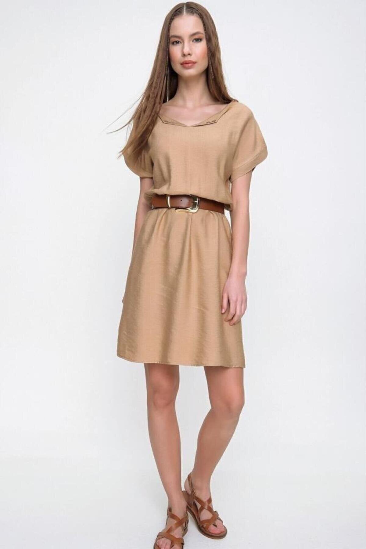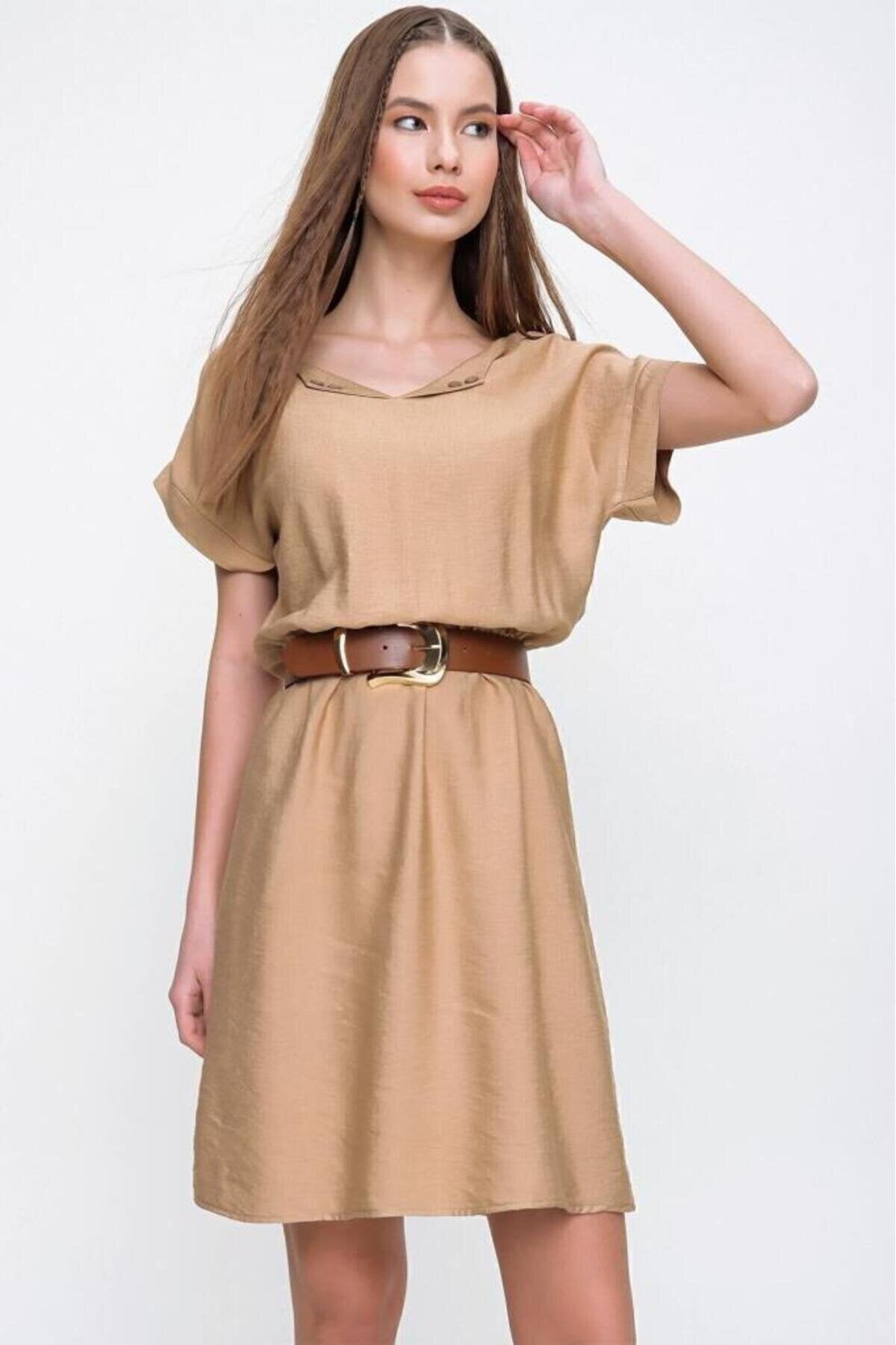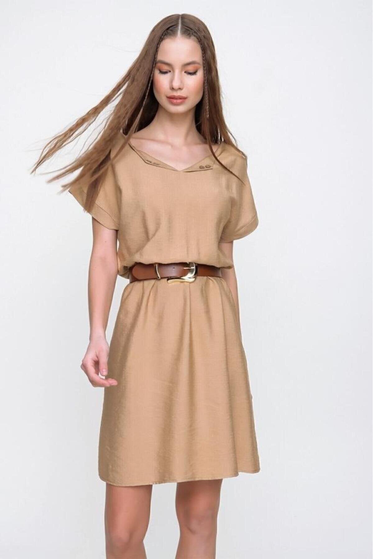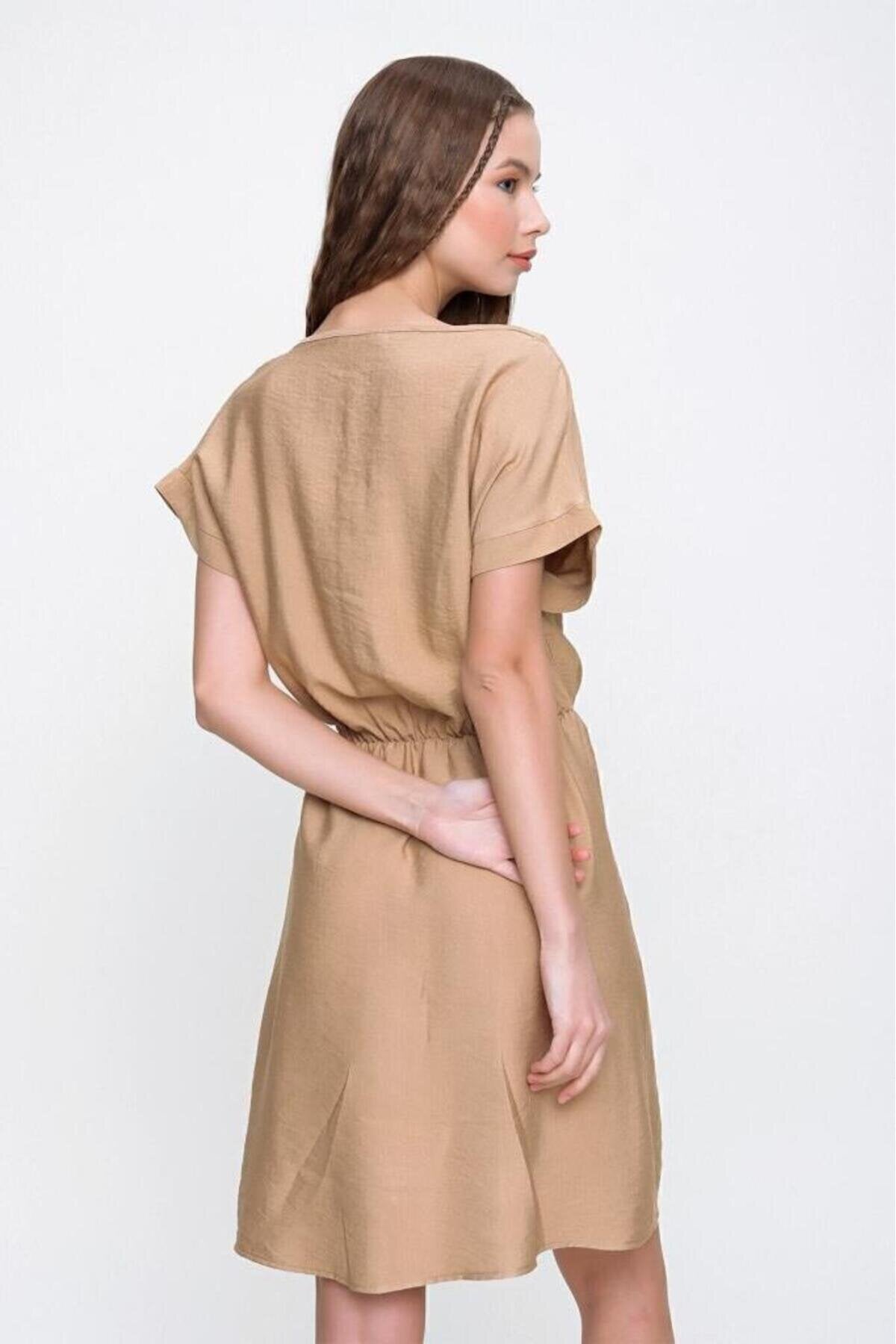 Fabric Type: Woven, Material: Linen Look, Sleeve Type: Short Sleeve, Pattern: Plain, Color: Beige, Fit: Regular, Neckline: V-Neck, Closure Type: Buttoned, Sleeve Length: Short, Product Detail: Button Detail, Pocket: No Pockets, Collection: Basic, Thickness: Lightweight, Lining Status: Unlined, Length: Regular, Persona: Feminine, Silhouette: Wrap, Occasion: Casual, Weave Type: Textured, Additional Feature: Elastic Waist, Print/Embroidery Technique: Unprinted, Belt/Sash Status: No Belt, Sustainability Detail: No, Package Contents: Single Item, Cup: Cupless, Season: All Seasons, Origin: TR, Box Status: No Box