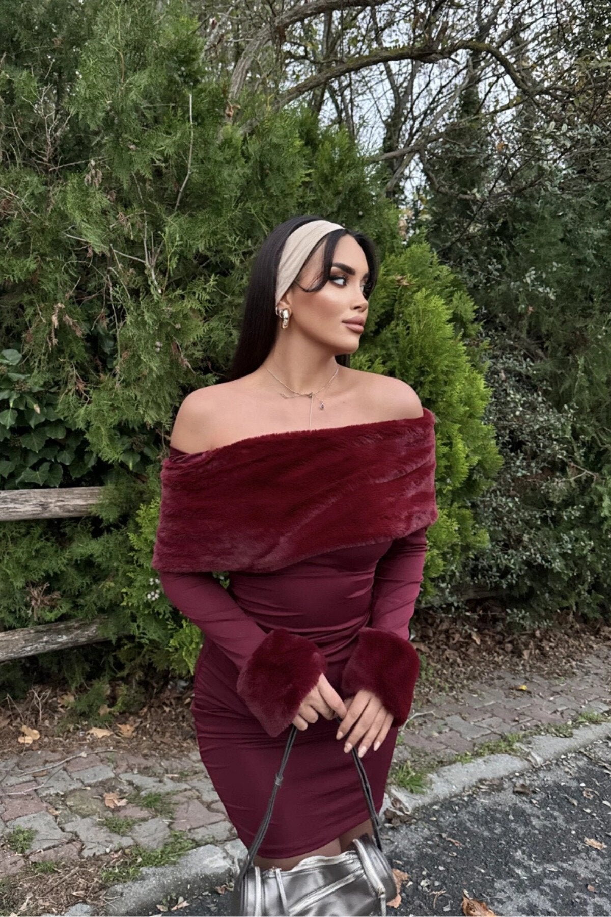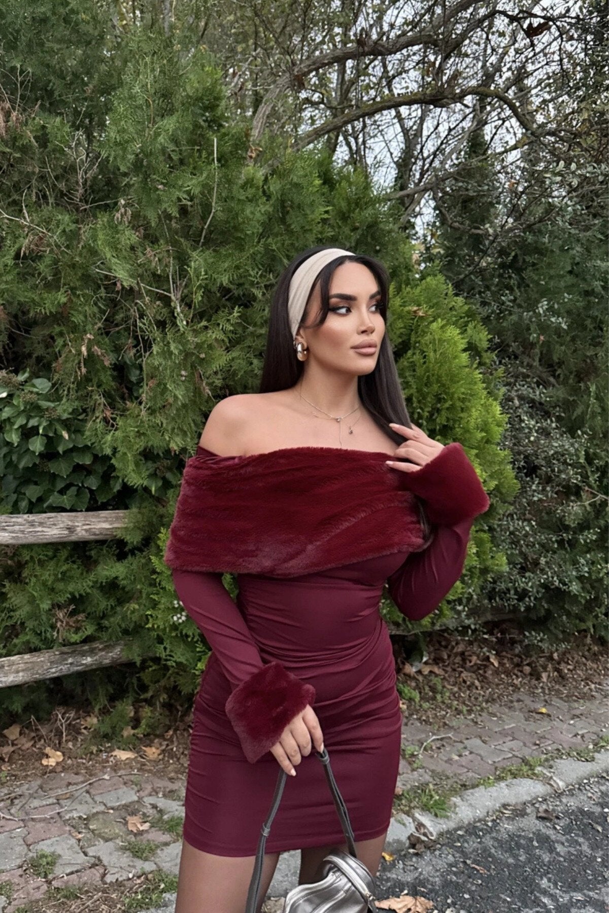 Mini Ruched Off-the-Shoulder Faux Fur Dress - Burgundy