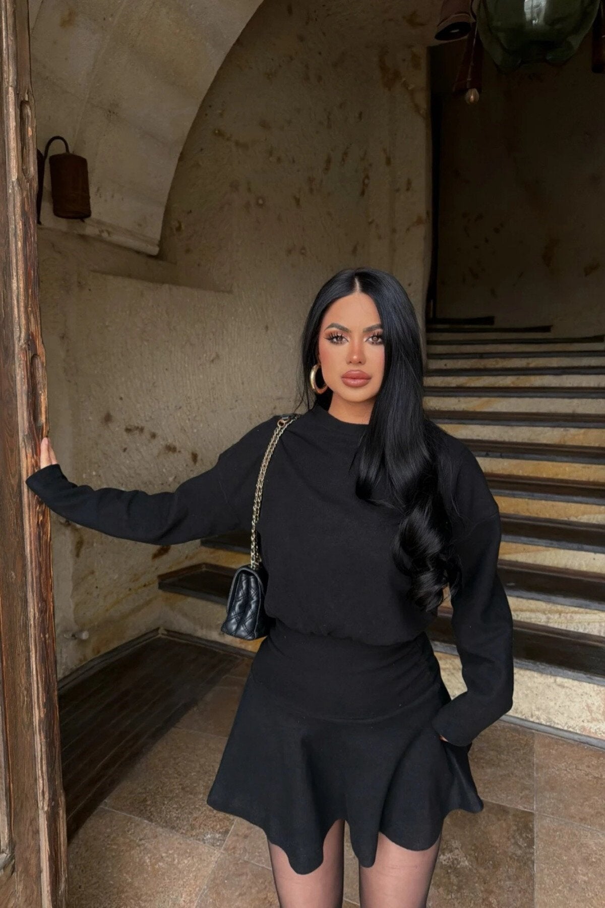 Mini Selanik Fabric Gathered Waist Dress - Black