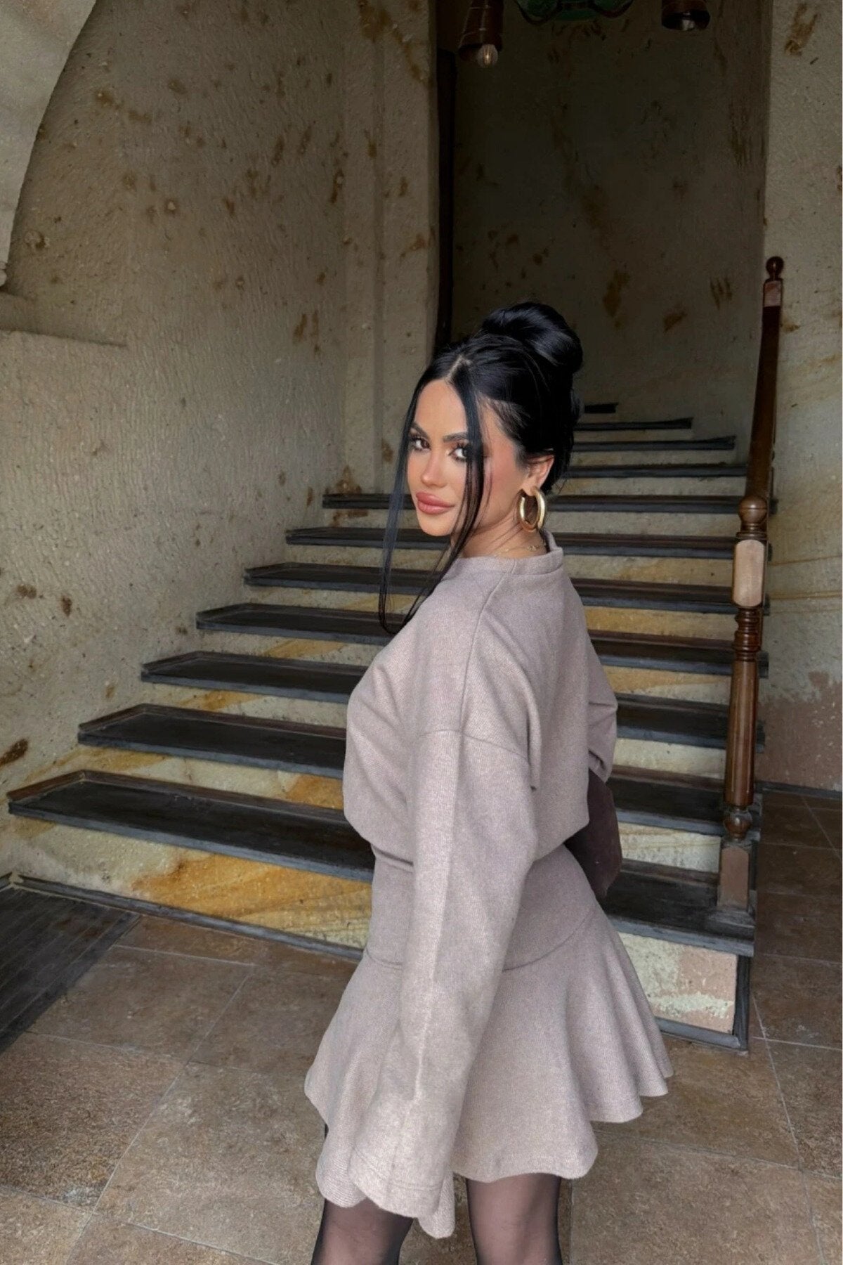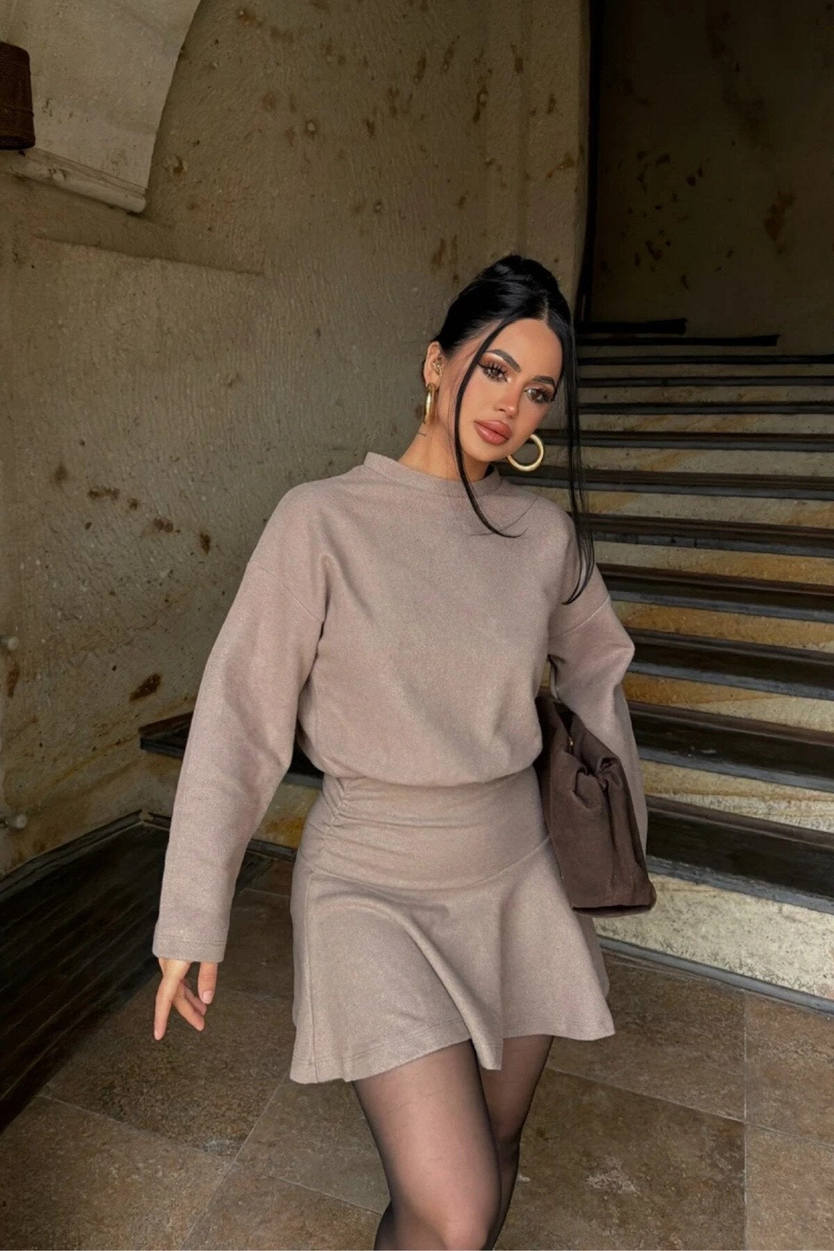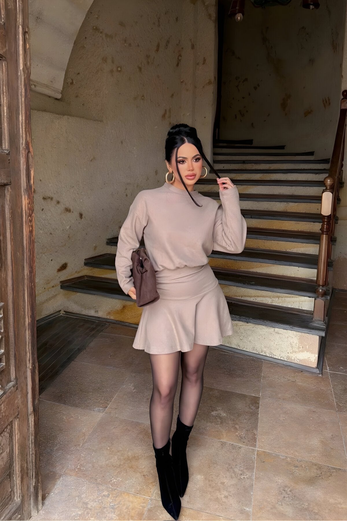 Mini Selanik Knit Shirred Waist Dress - Beige