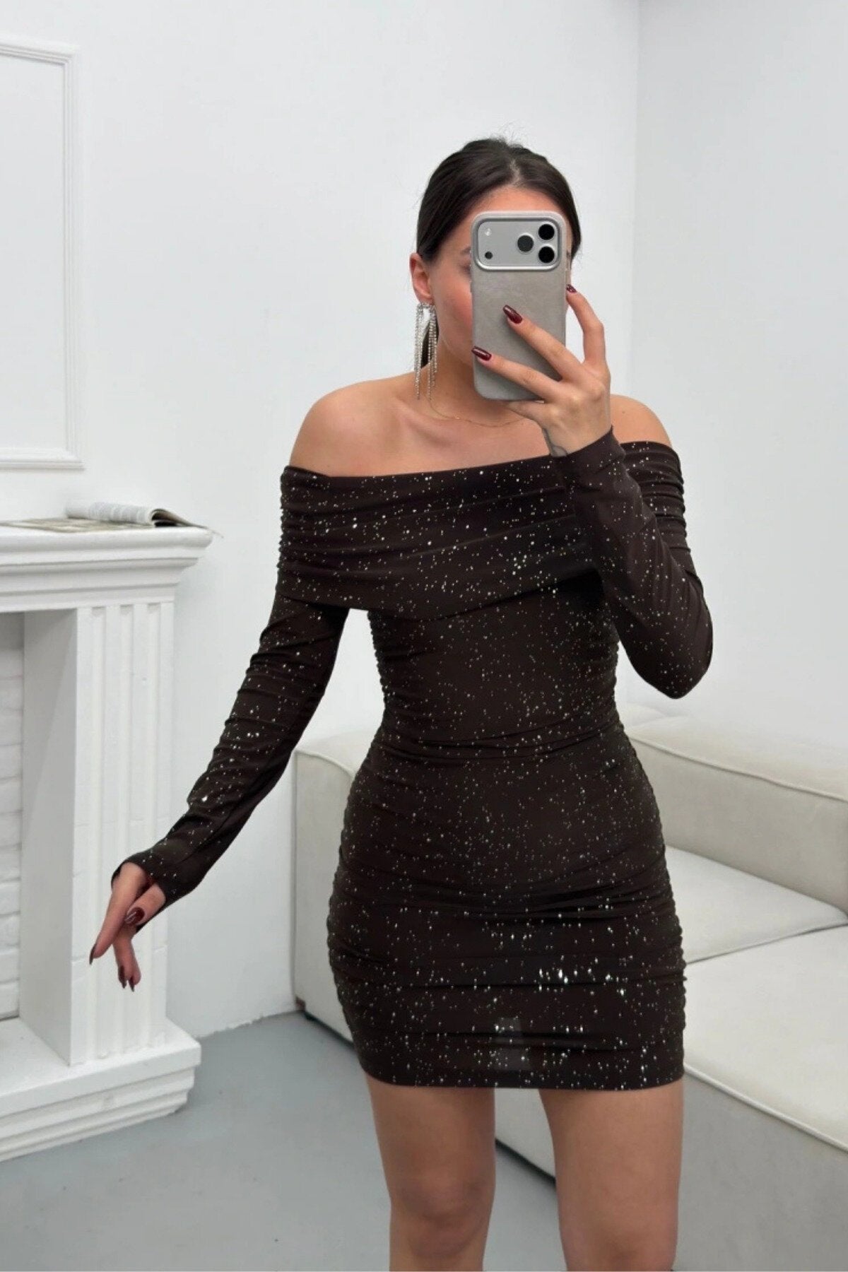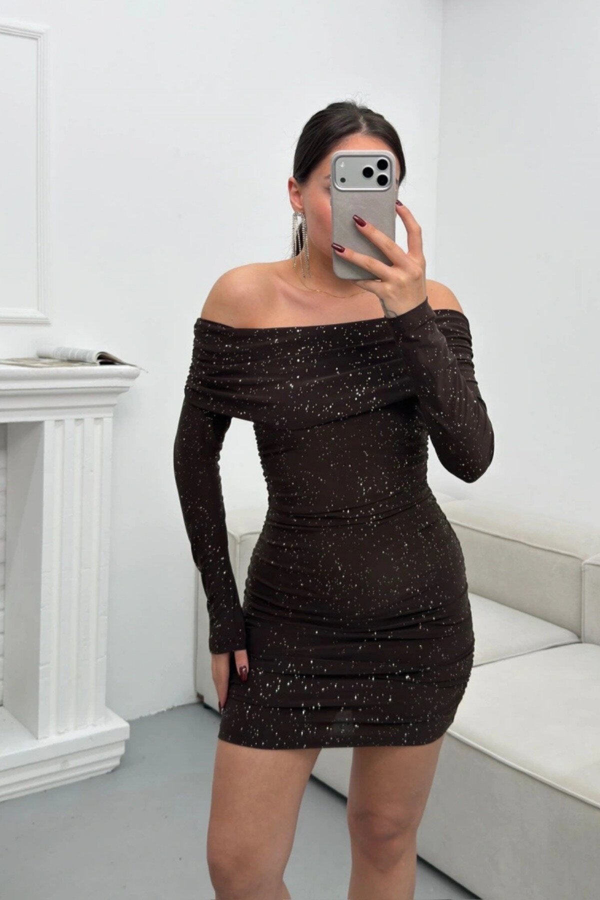 Embrace the night in this stunning Mini Shimmery Off-the-Shoulder Dress. This piece combines a rich, chocolate brown hue with a captivating glitter finish to create a look that is both modern and timelessly elegant, designed to turn heads at every turn.