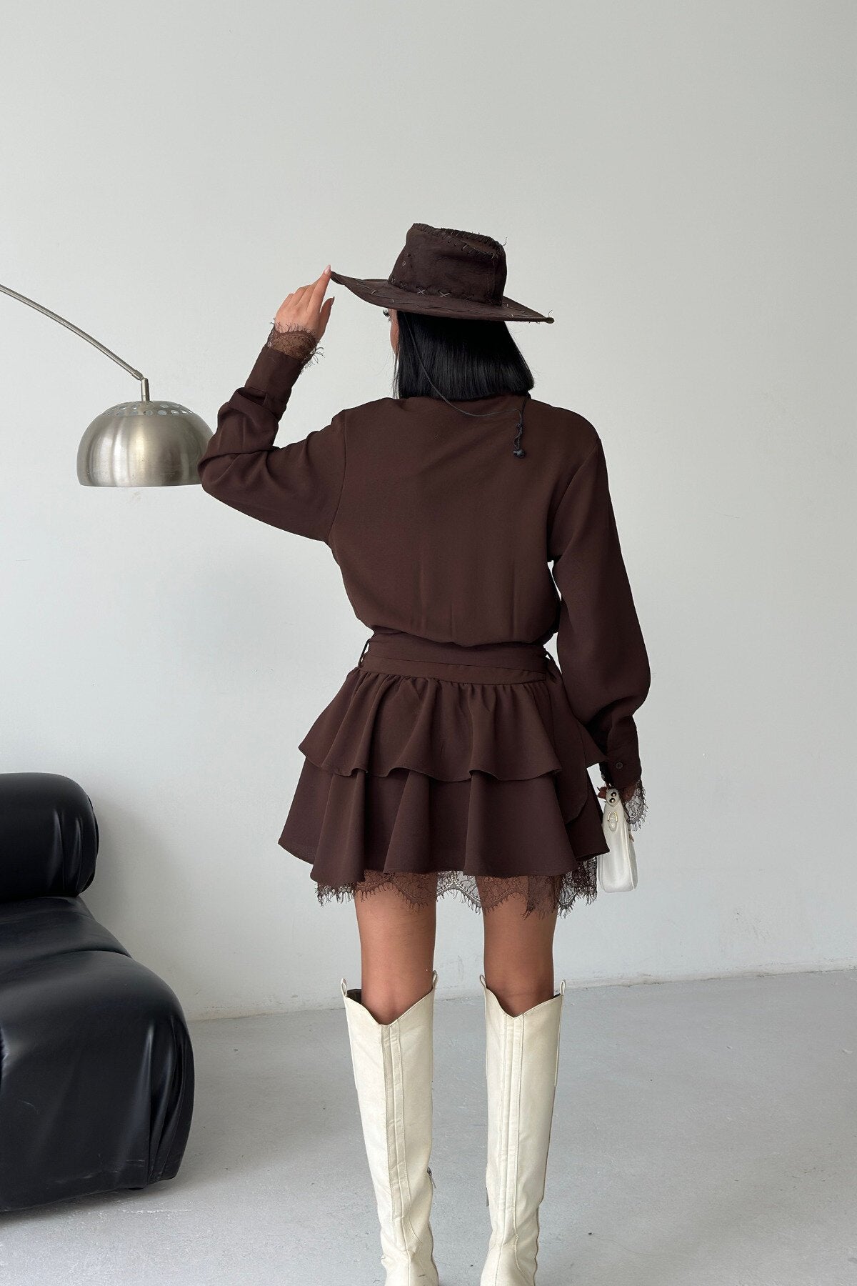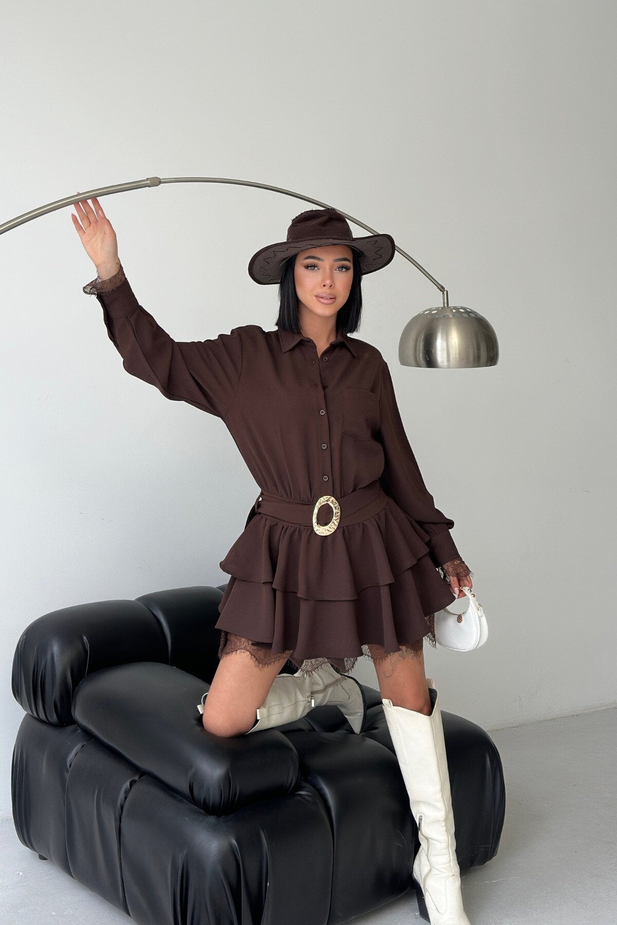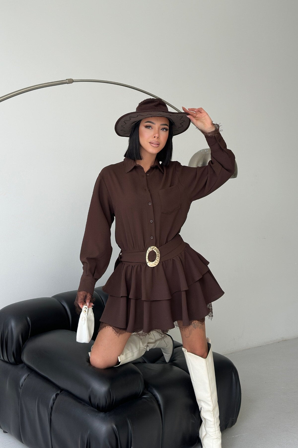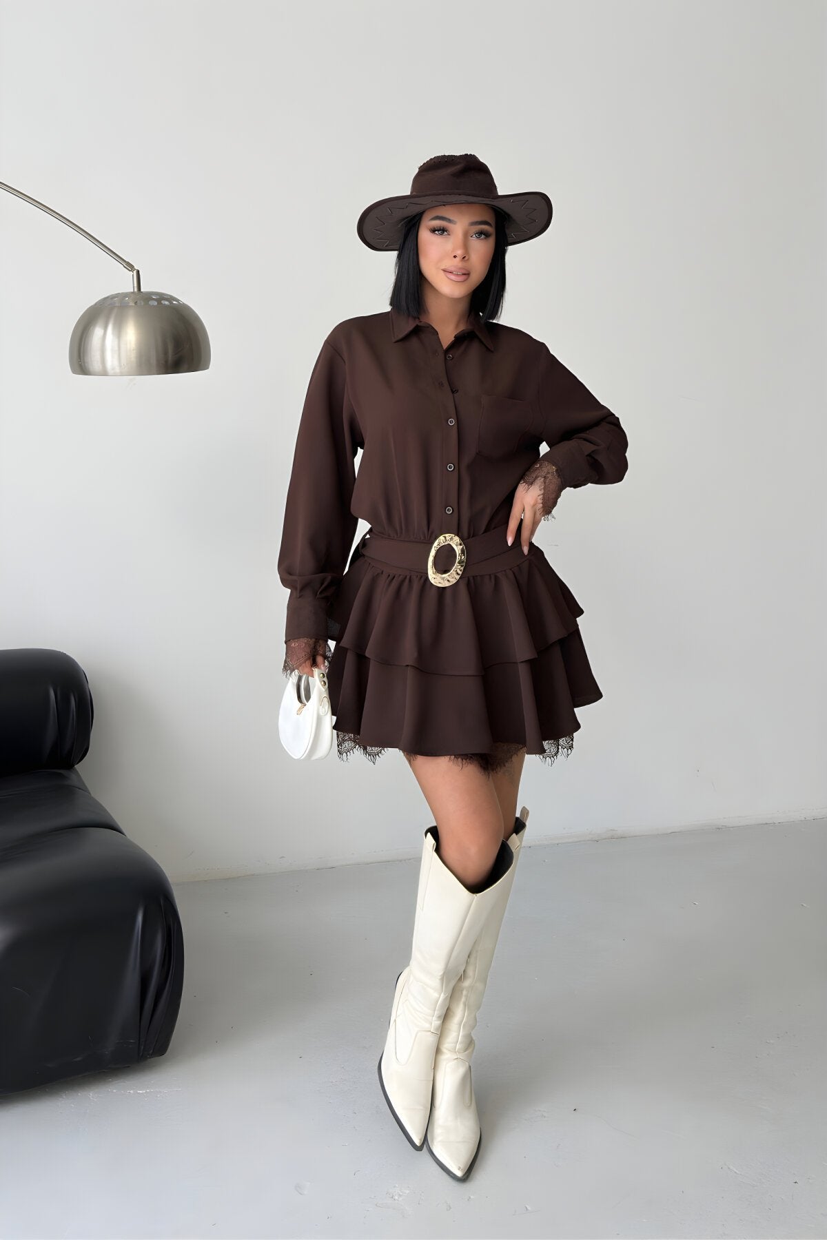 This mini shirt dress masterfully blends classic tailoring with a feminine, playful edge. Crafted in a rich chocolate brown hue, its tiered silhouette and delicate lace accents create a look that is both grounded and exceptionally stylish, perfect for the modern trendsetter.