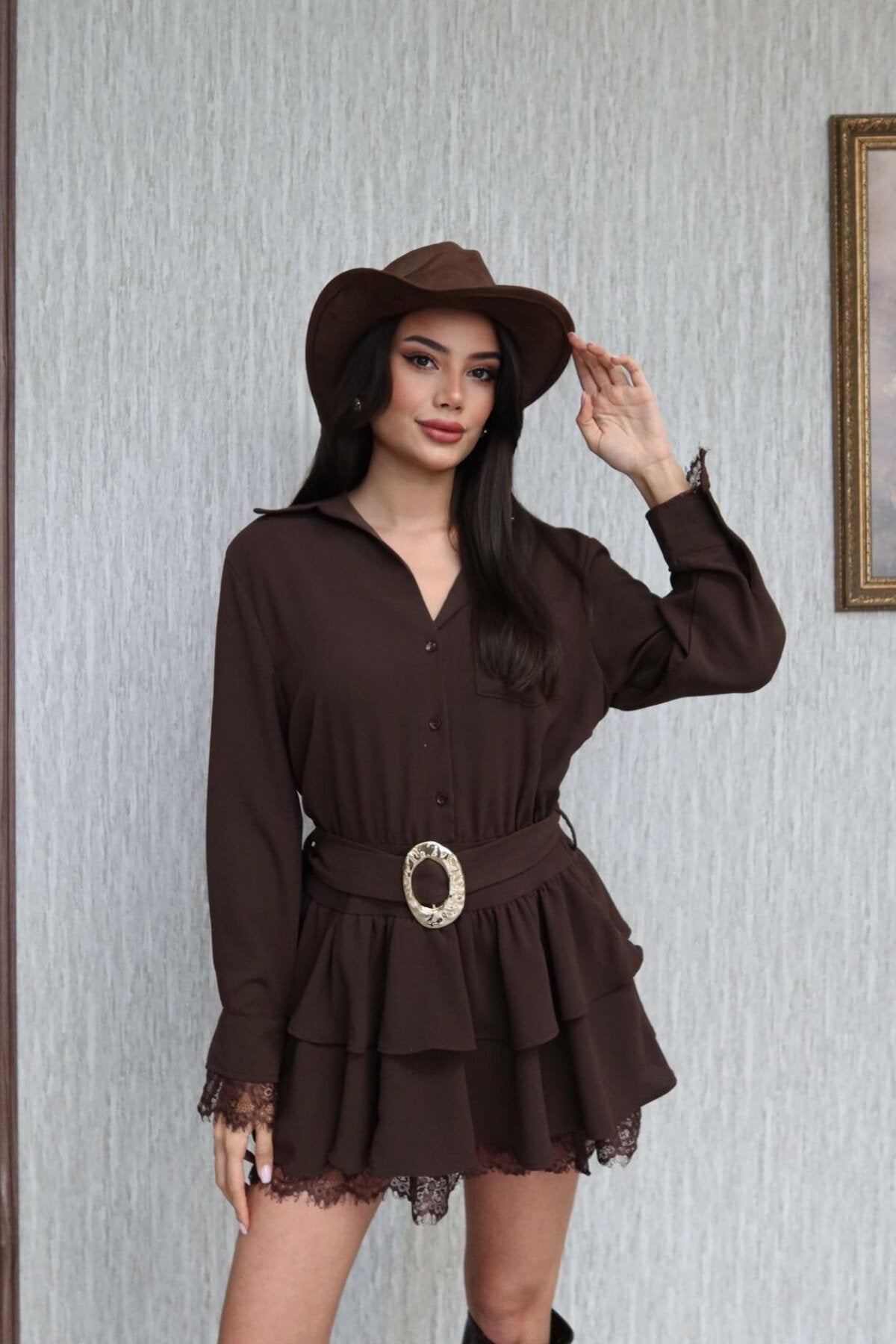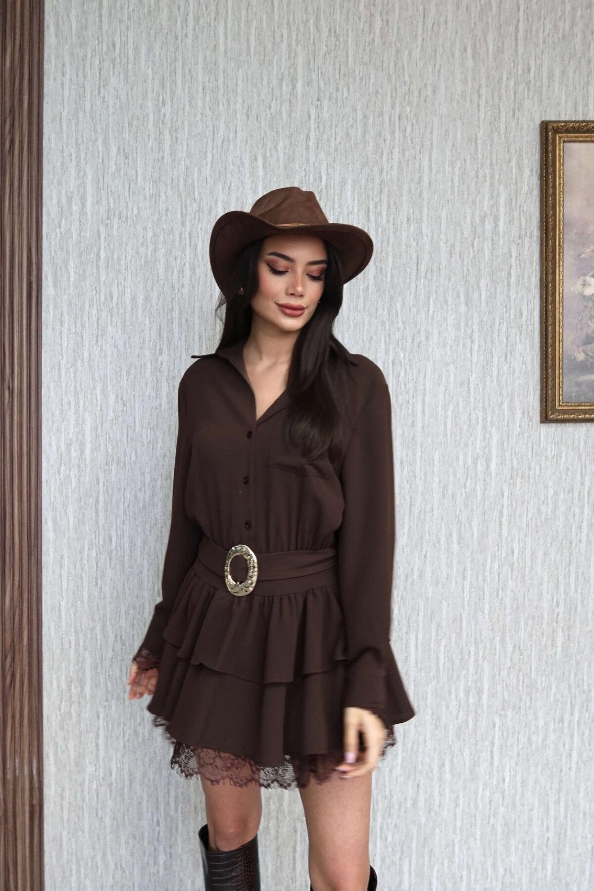 A sophisticated blend of classic tailoring and feminine charm, this chocolate brown mini dress captures a unique, contemporary aesthetic. The structured shirt-collar bodice meets a playful, tiered skirt, creating a silhouette that is both empowered and whimsical for a truly standout look.