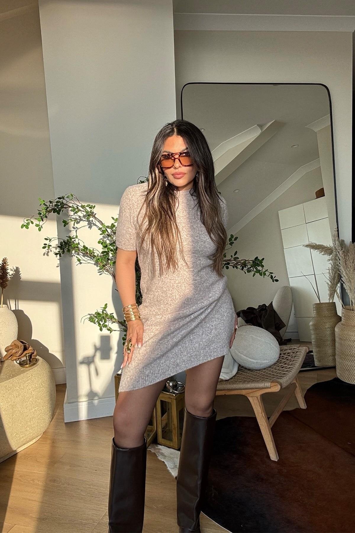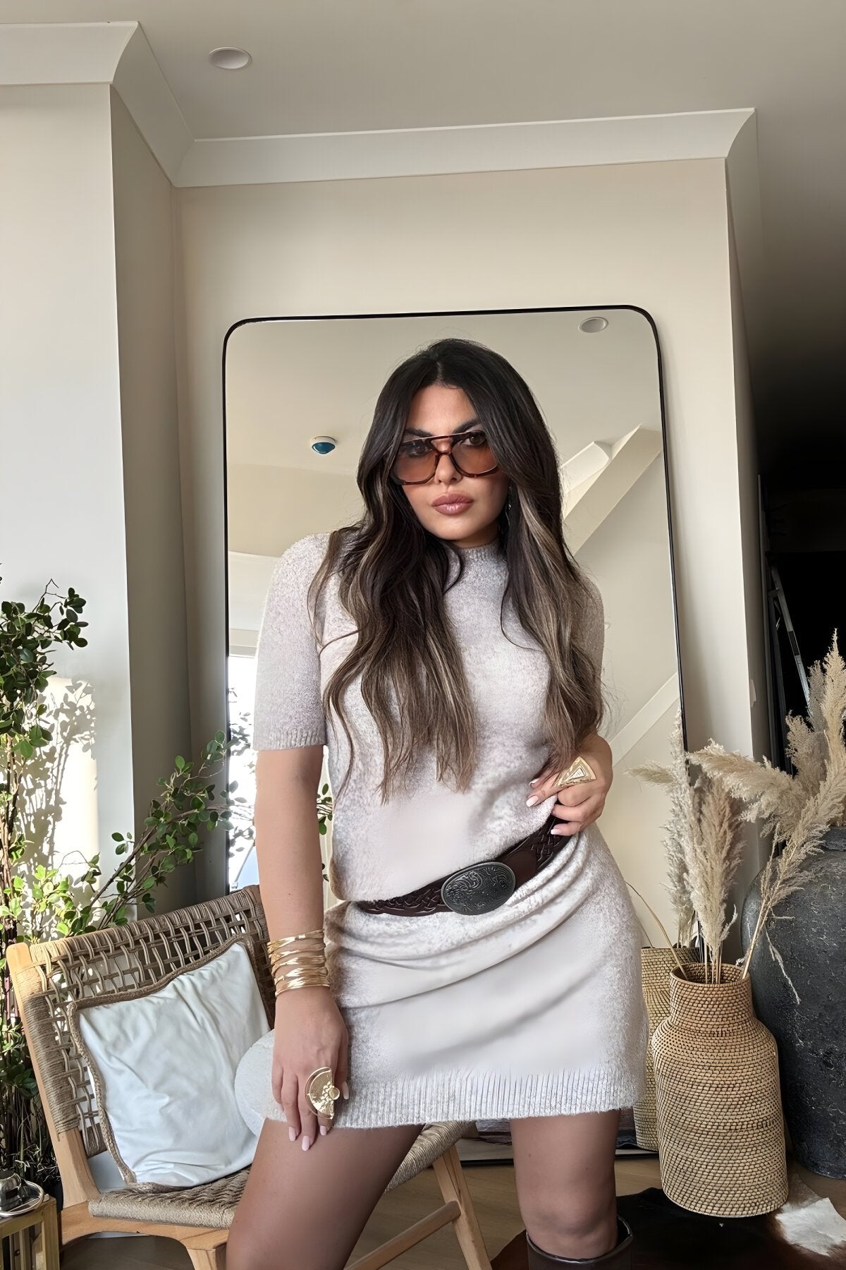 Embrace understated elegance with this beautifully crafted mini knit dress. Its contemporary silhouette and soft texture blend comfort with sophisticated charm, making it a versatile foundation for any modern wardrobe.