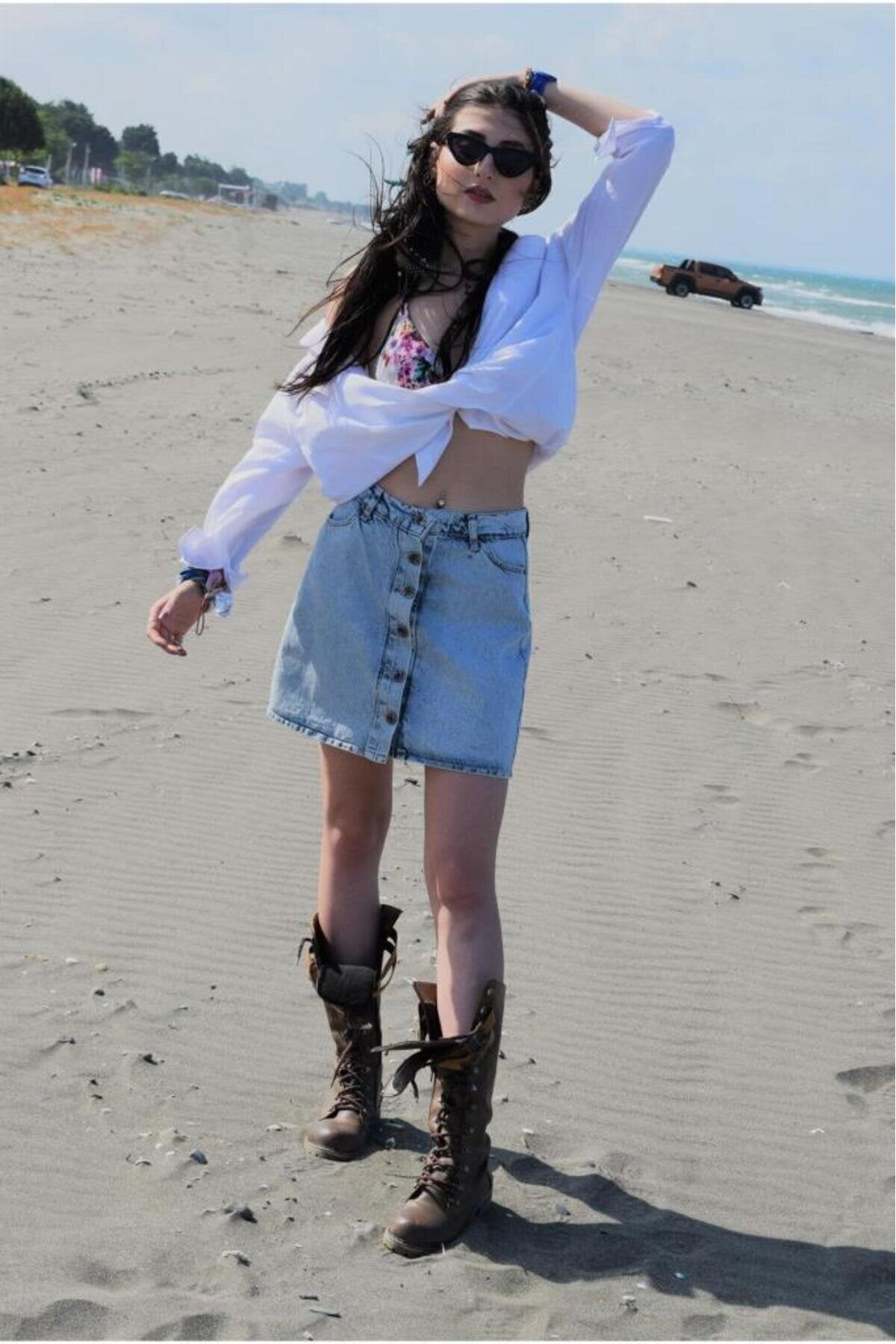 Mini Snow Wash Denim Buttoned Pocketed Skirt - Ice Blue