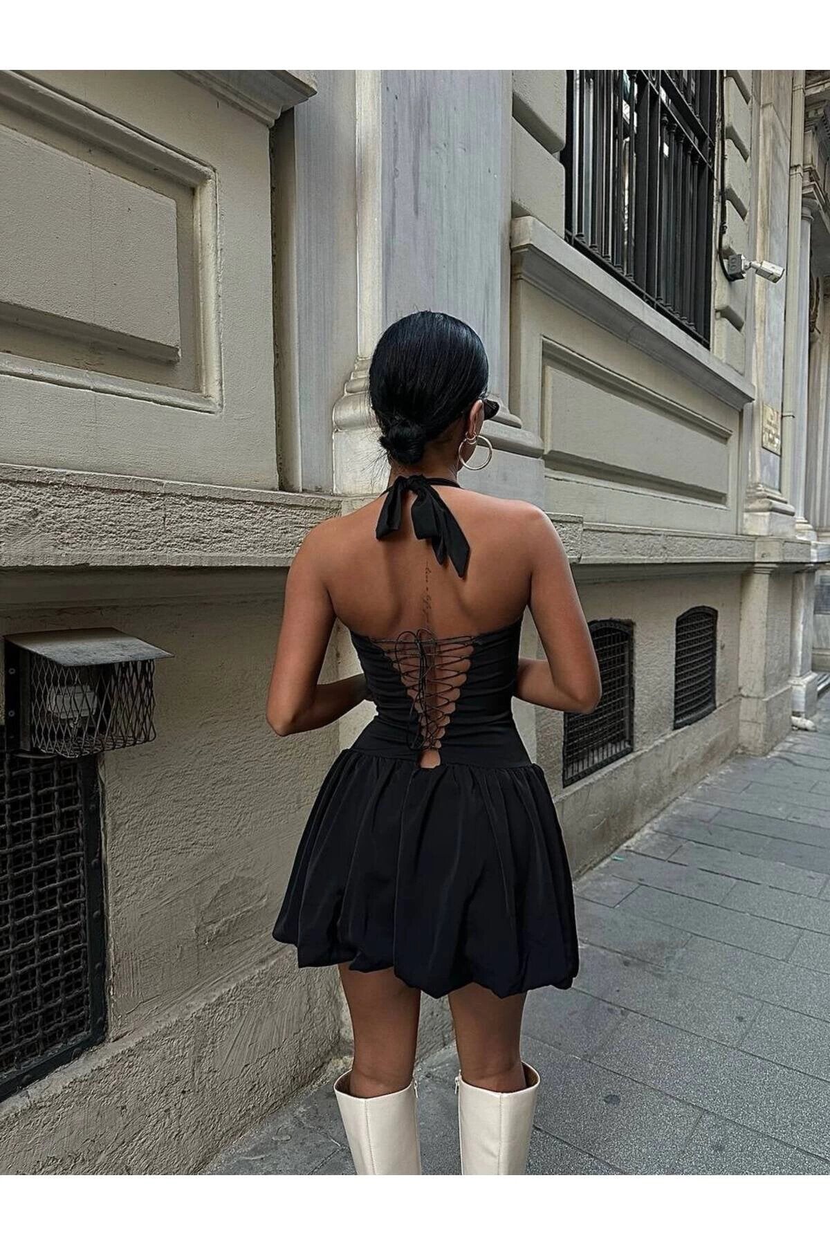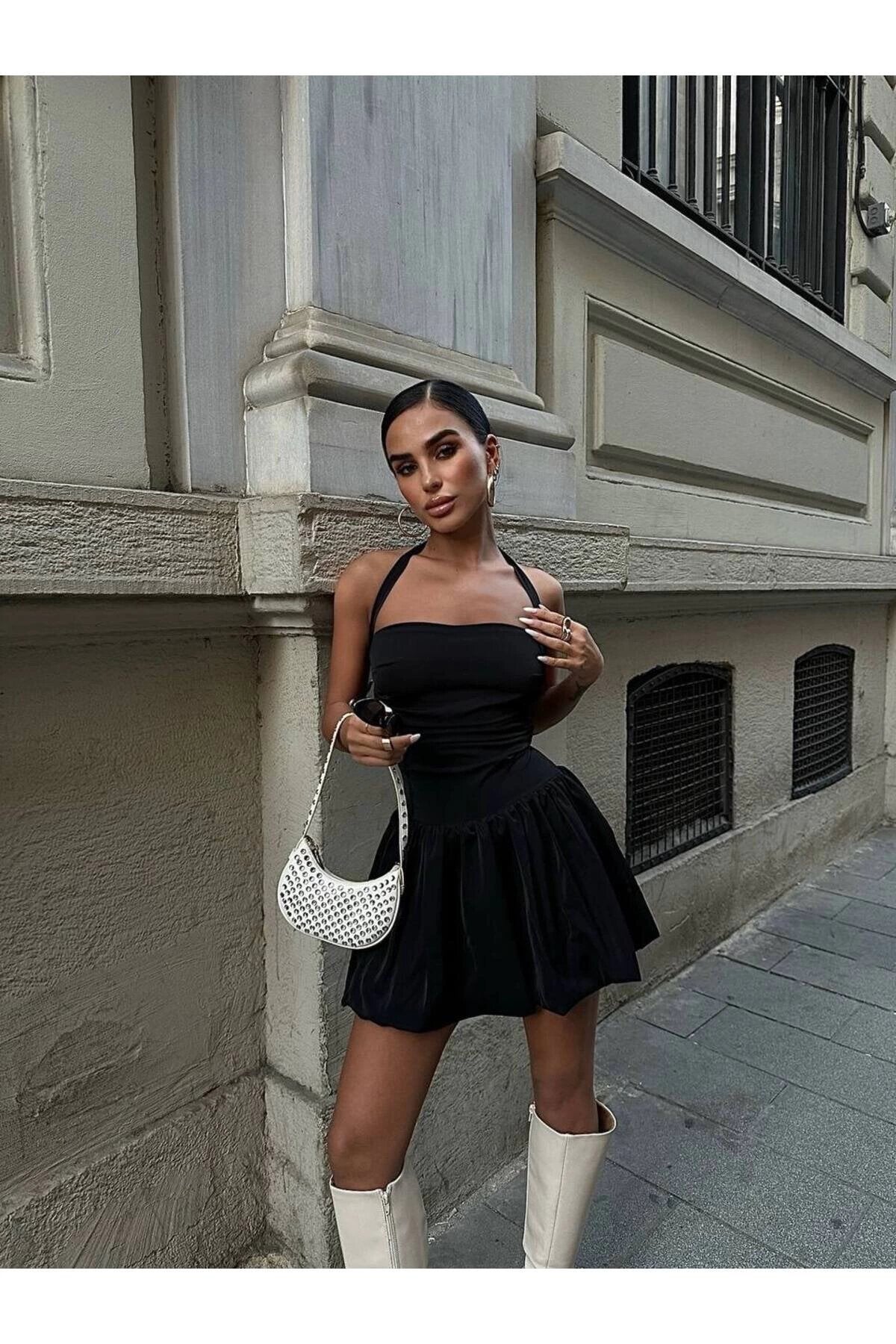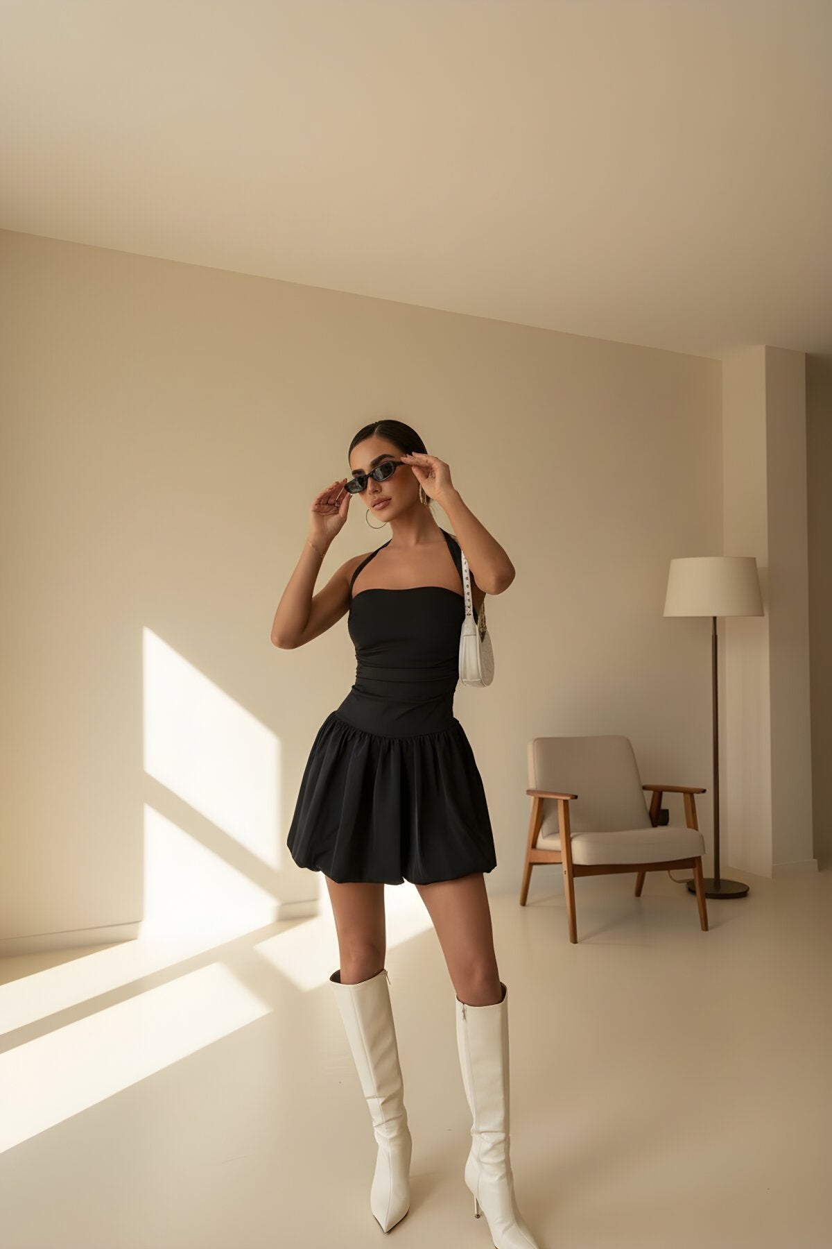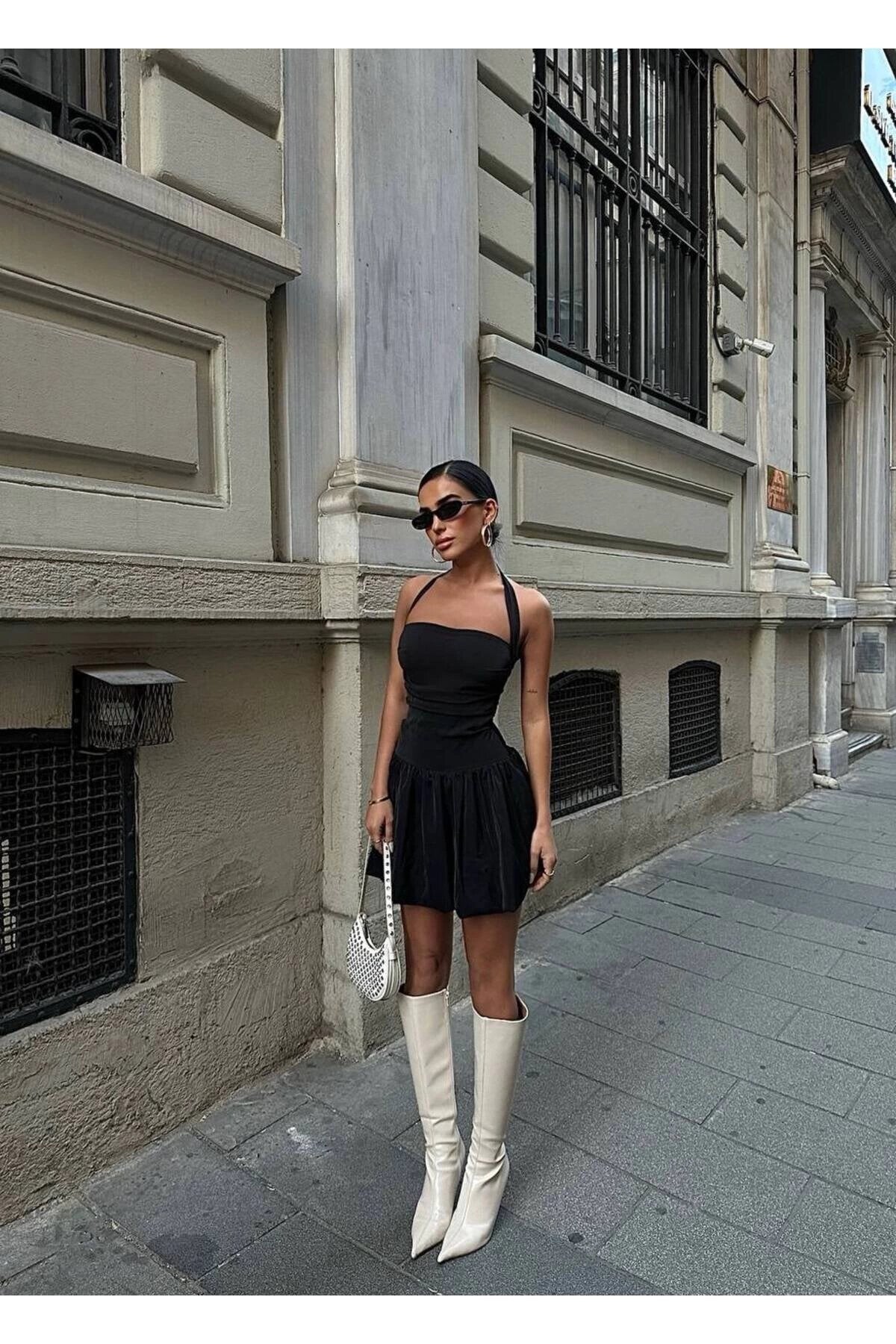 Unveiling a captivating blend of modern chic and playful elegance, this black mini shorts dress is designed to make a statement. Its sleek silhouette and thoughtful details combine to create a look that is both sophisticated and alluring, perfect for the fashion-forward individual.