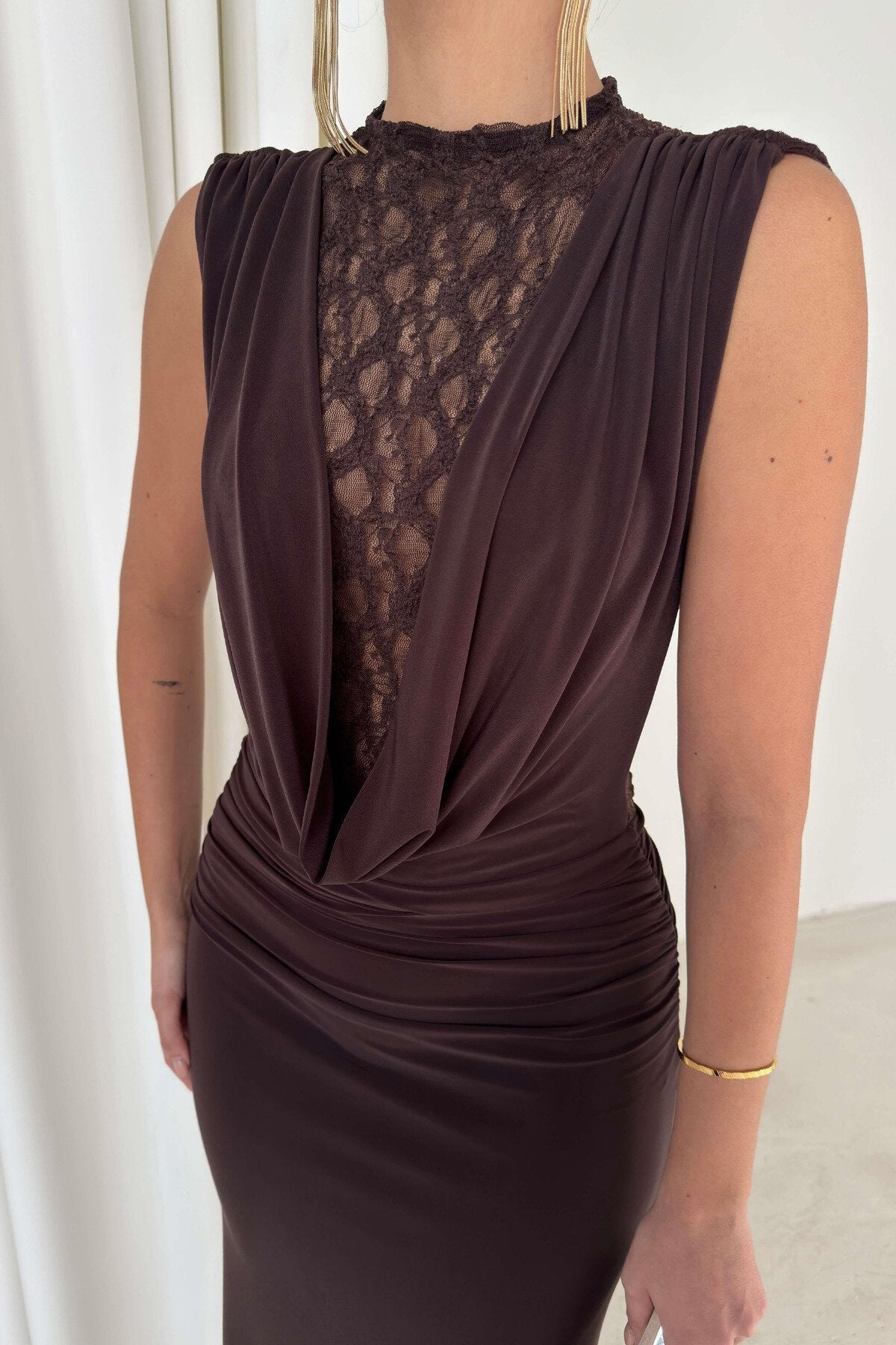 - Exquisite Lace Detailing: The bodice showcases a delicate lace-detailed insert framed by a sophisticated draped cowl neckline, offering a perfect balance of modern edge and classic romance.