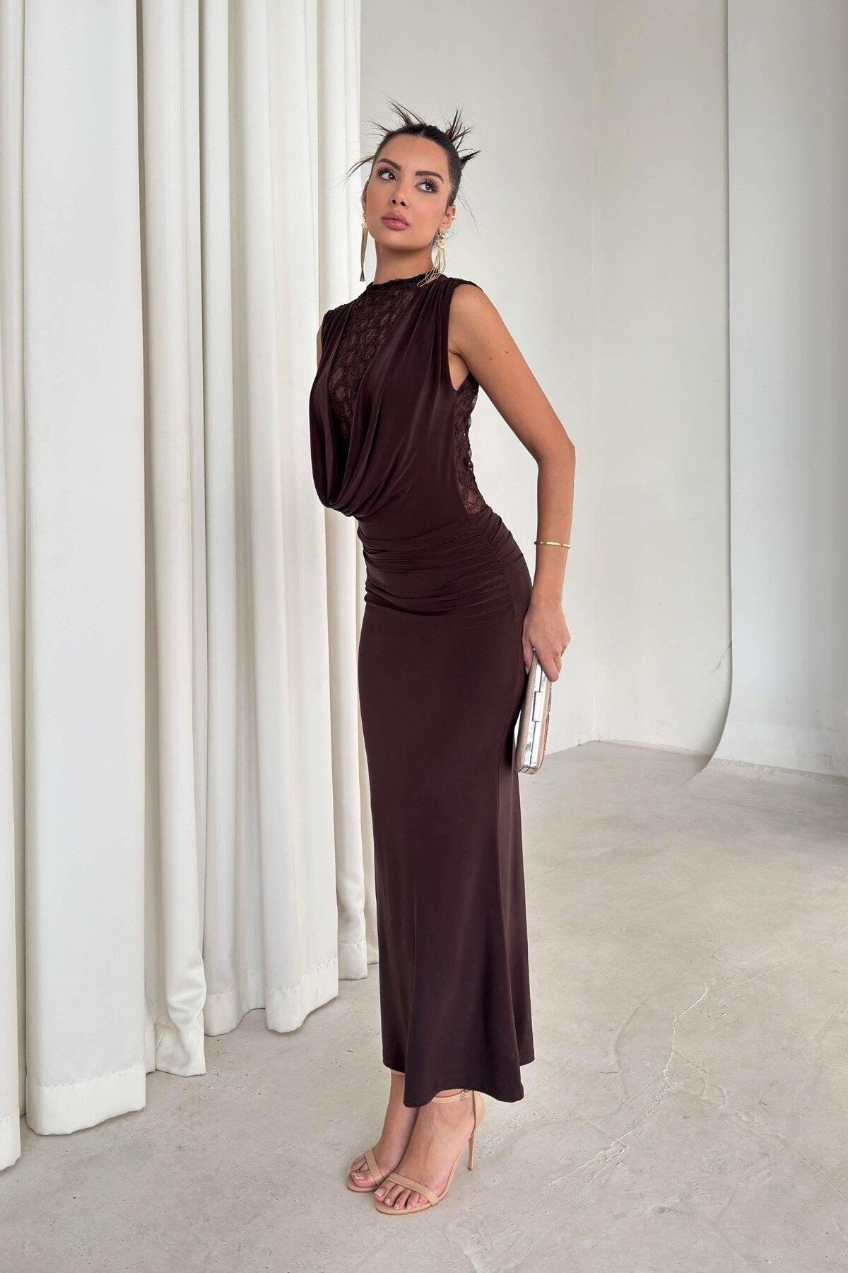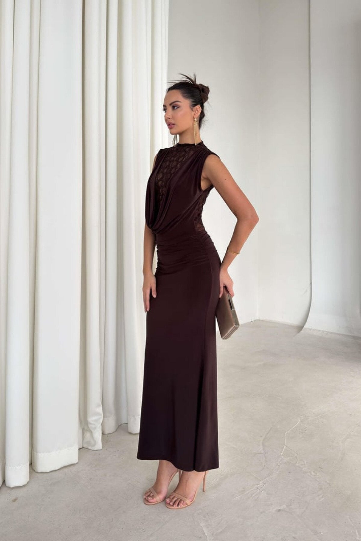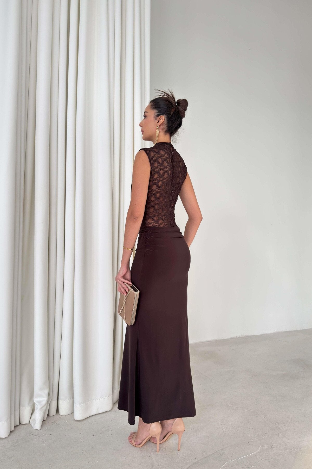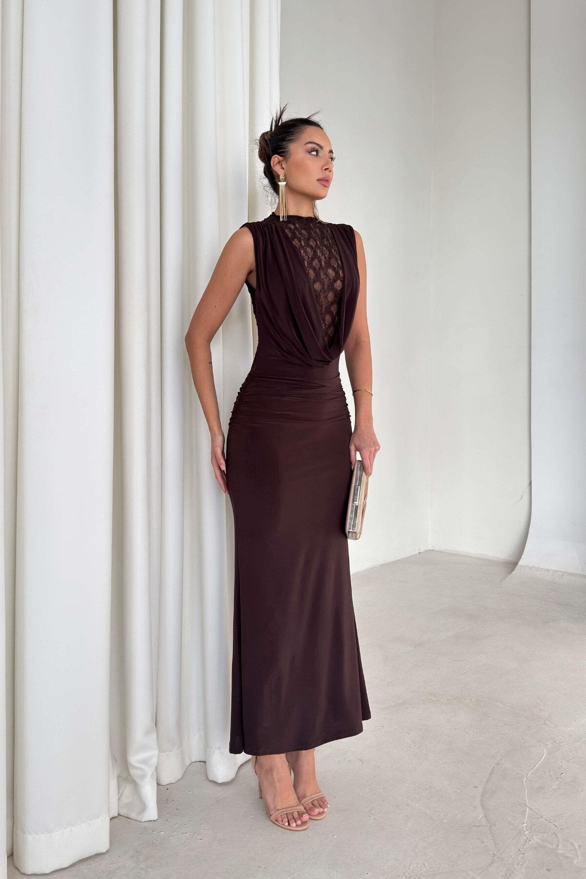 - Styling Versatility: Complement the warm brown tones with minimalist strappy heels in nude or metallic shades to elongate your silhouette and keep the focus on the beautiful neckline details.