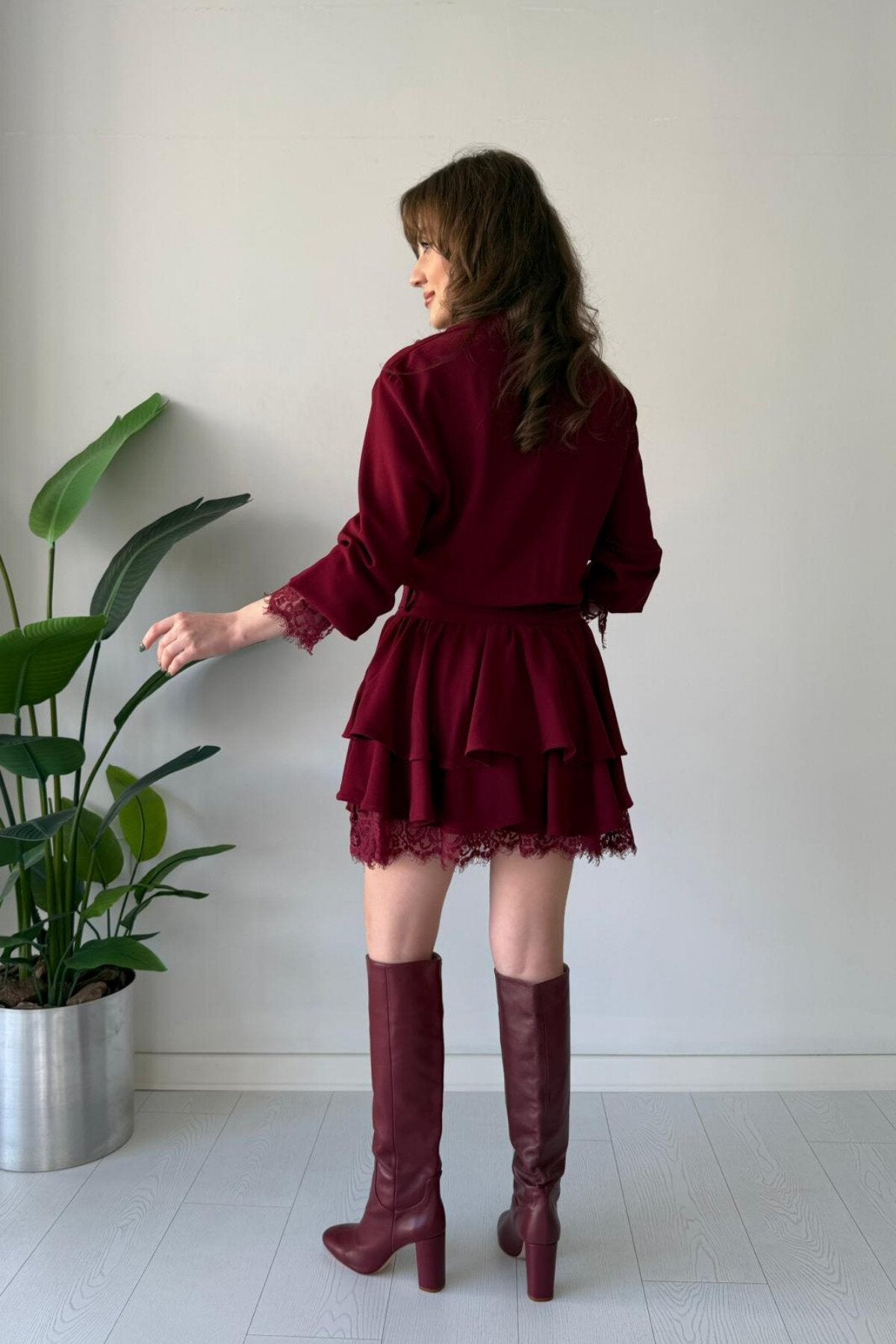 Mini Tiered Shirt-Style Lace Piped Belted Dress - Burgundy