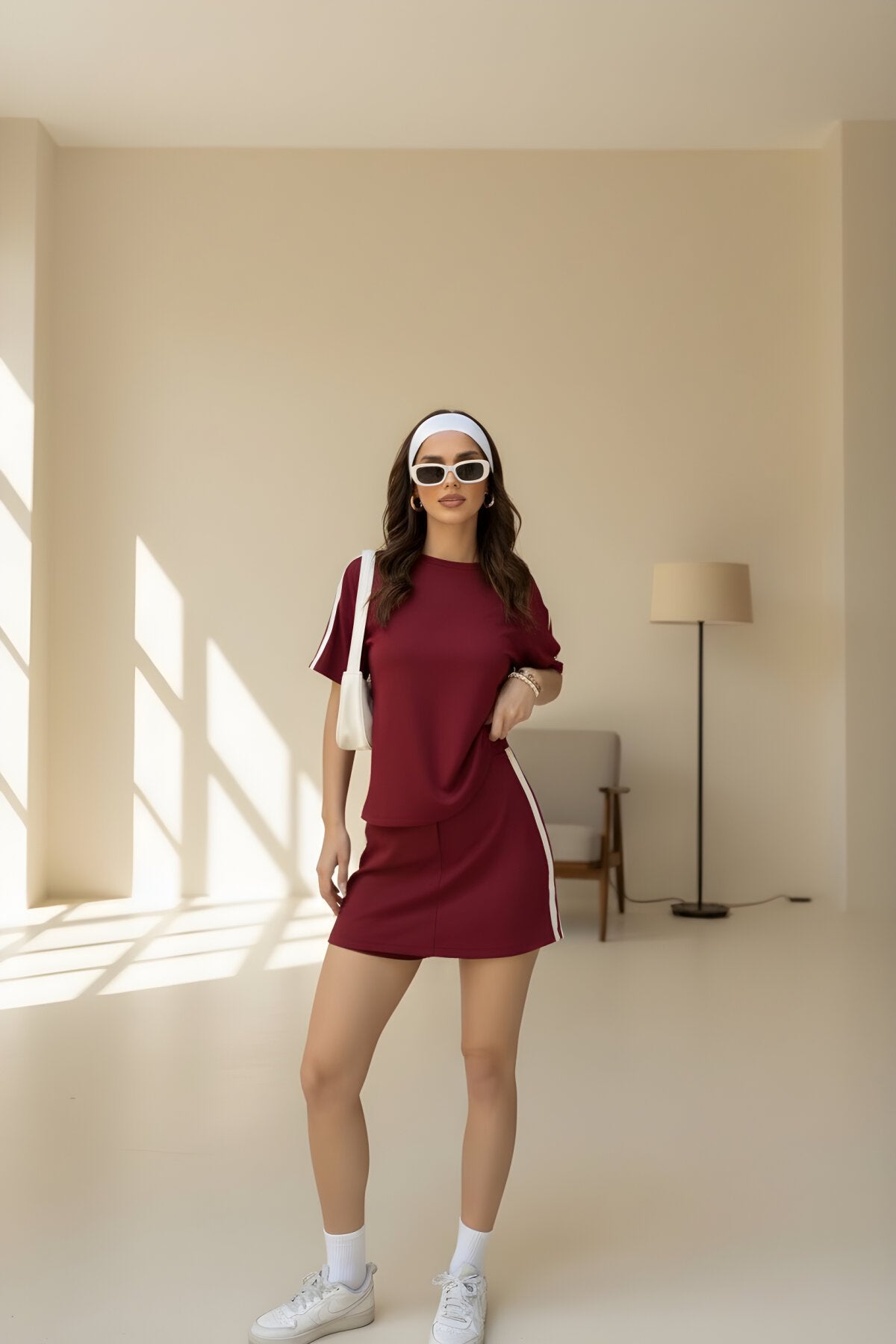 This coordinated set effortlessly blends sporty functionality with a modern, high-fashion aesthetic. Featuring a rich burgundy hue and striking white side-stripe detailing, the Modal Crew Neck T-shirt and Mini Skort Set offers a streamlined silhouette that is as comfortable as it is stylish.