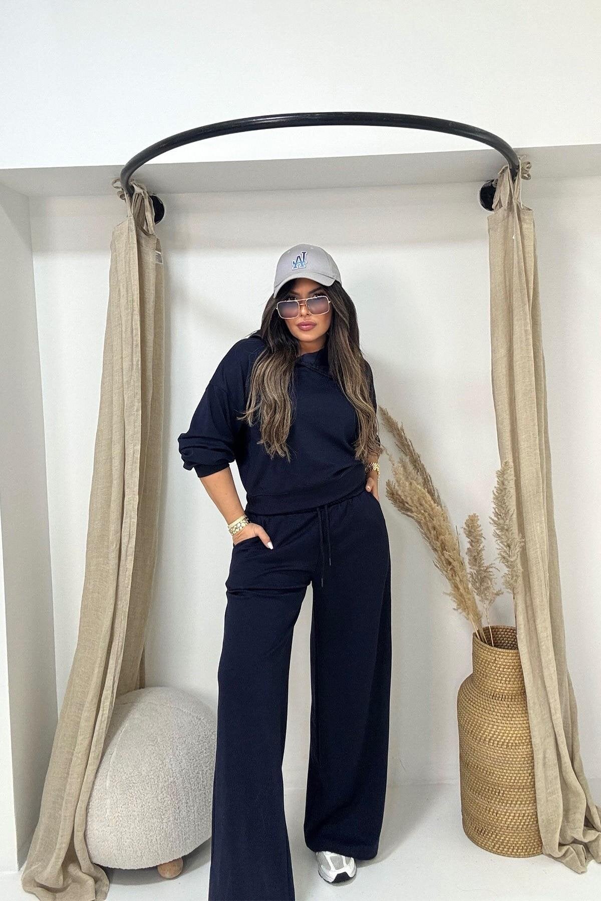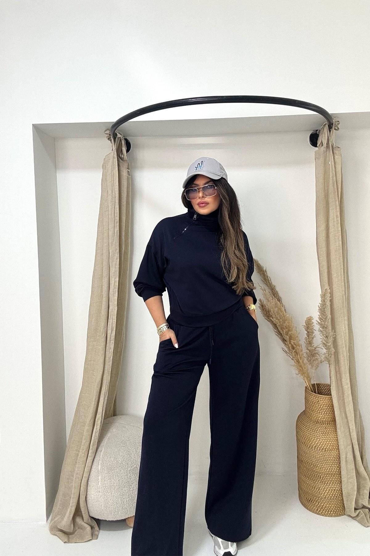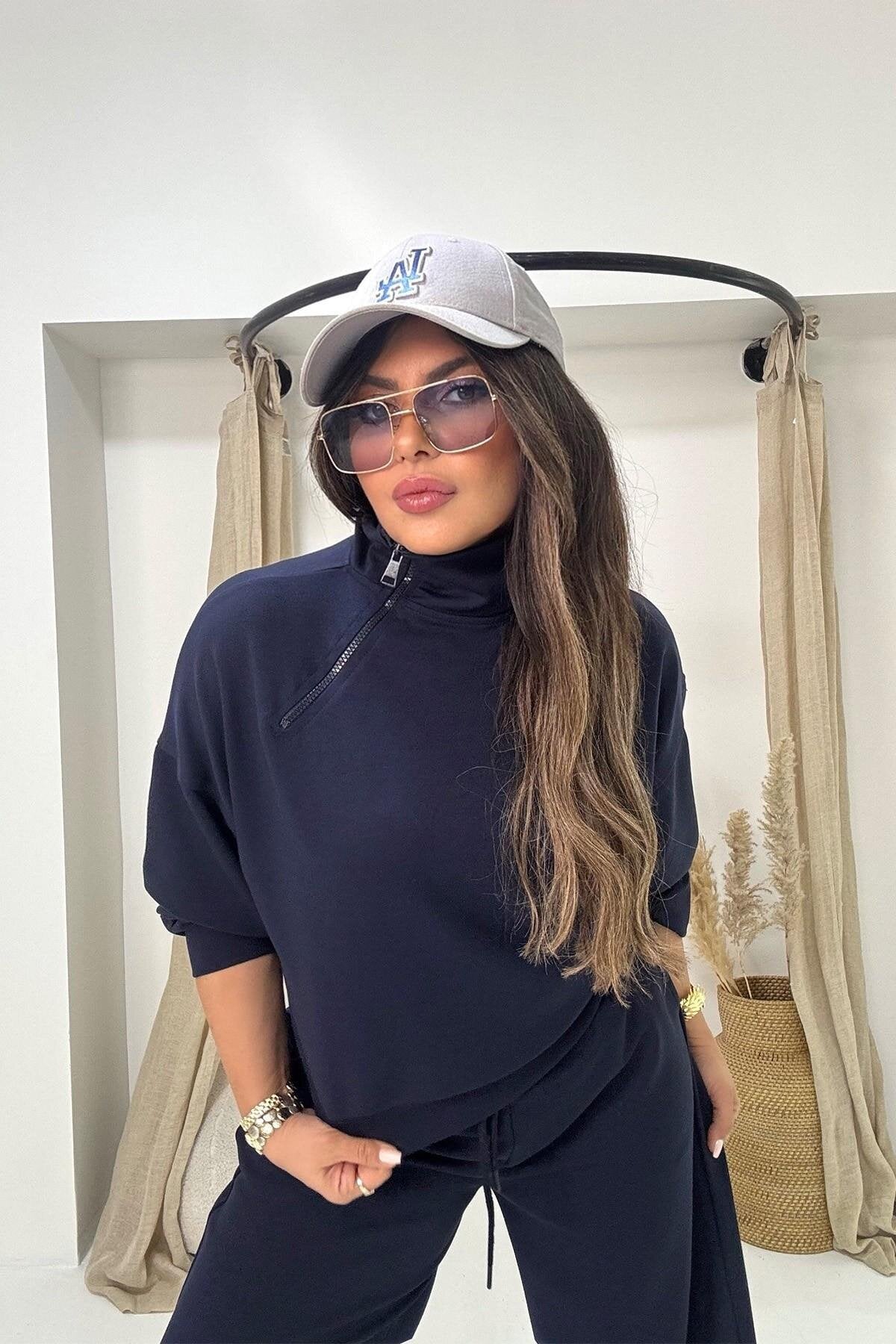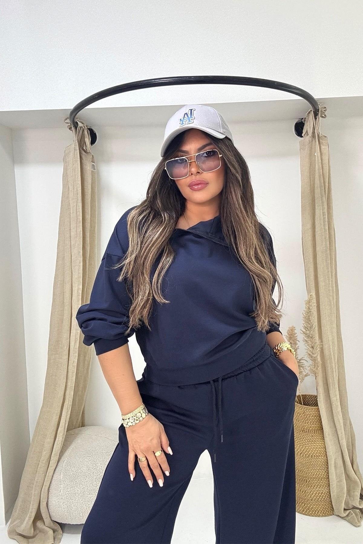 Modal Zippered Collar Tracksuit Set - Navy Blue