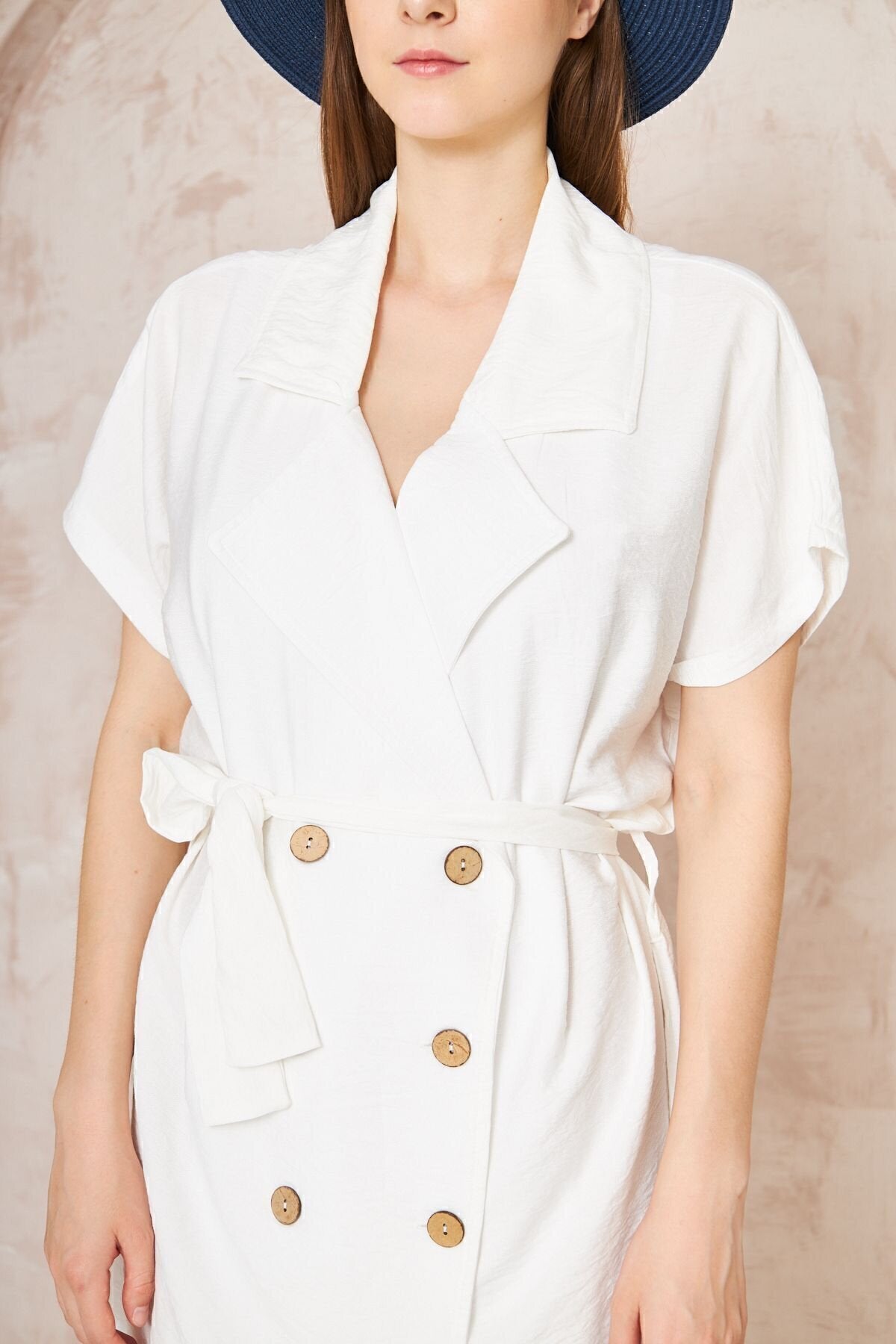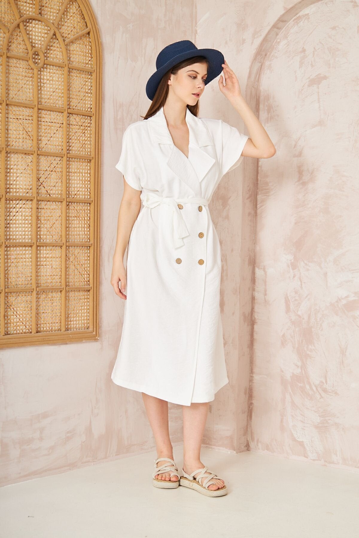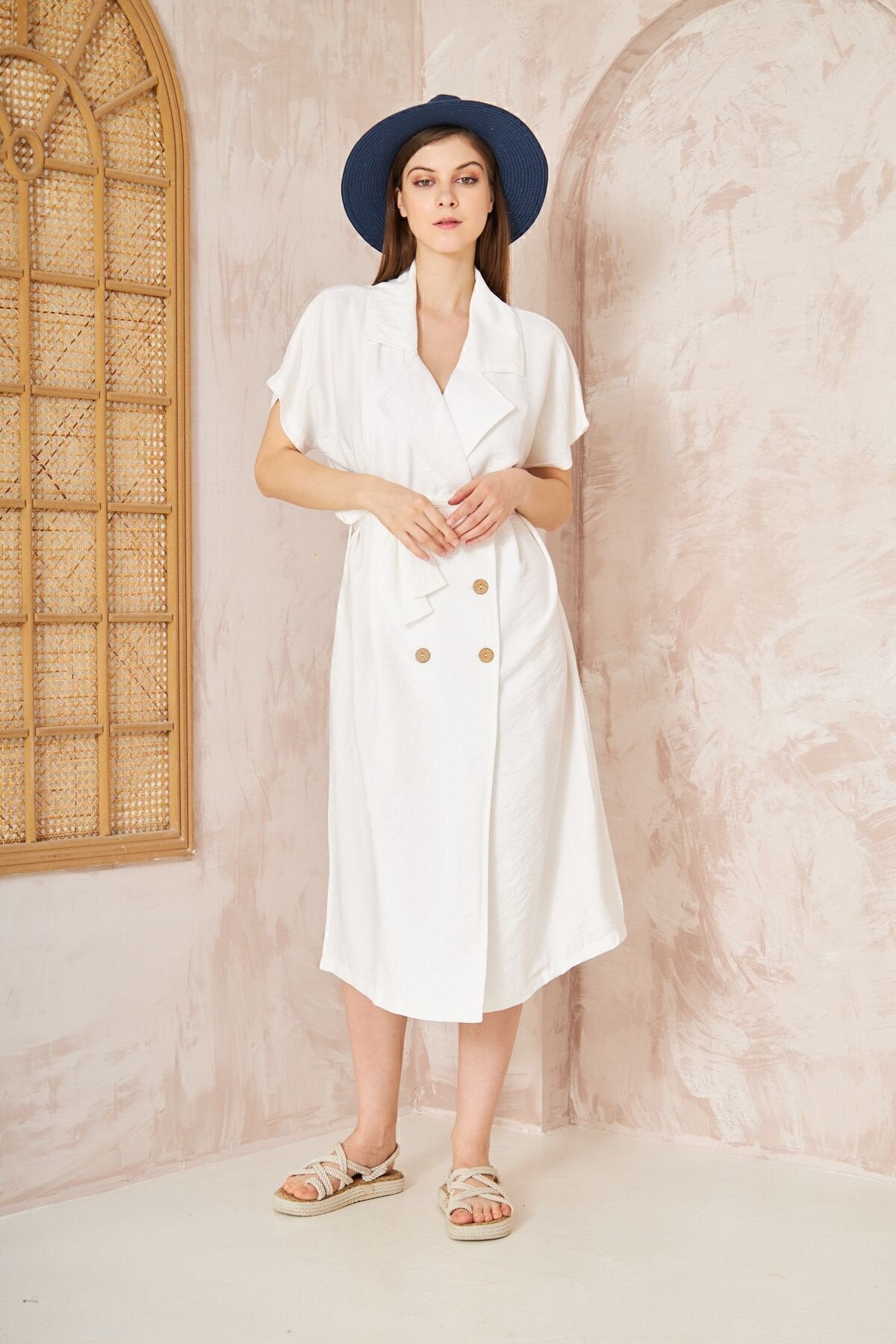 Oversize Wide-Cut Midi Short-Sleeved Linen Jacket Dress - White