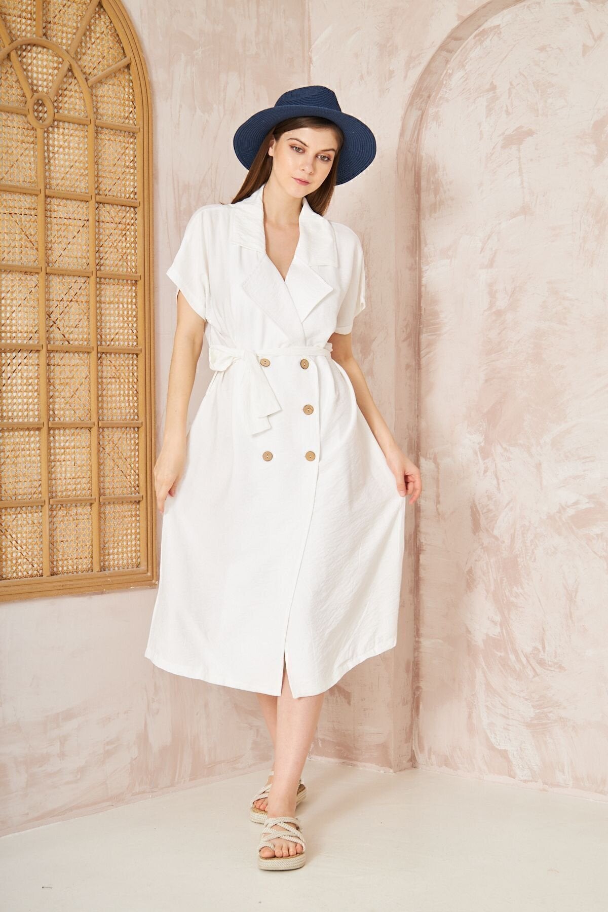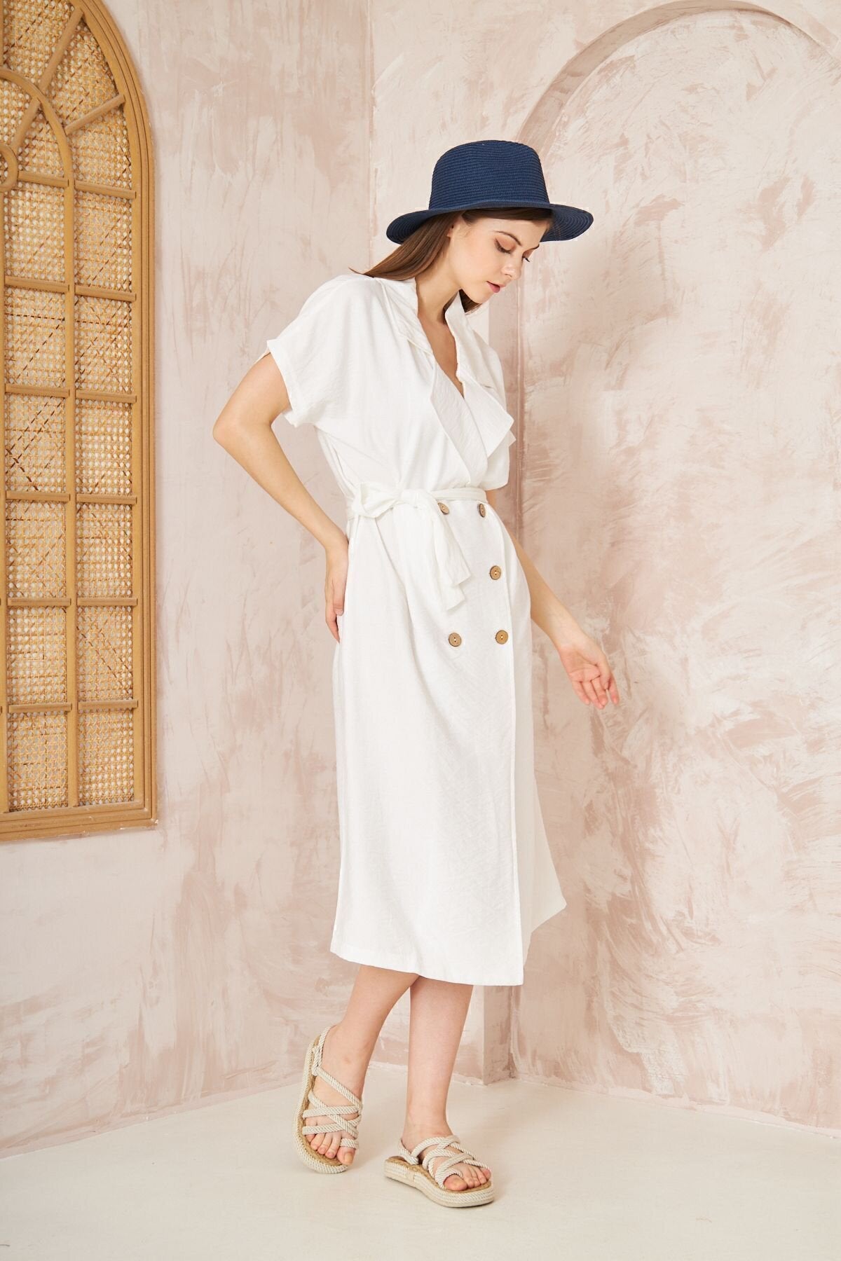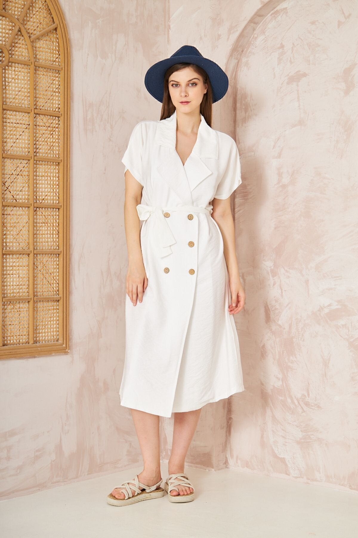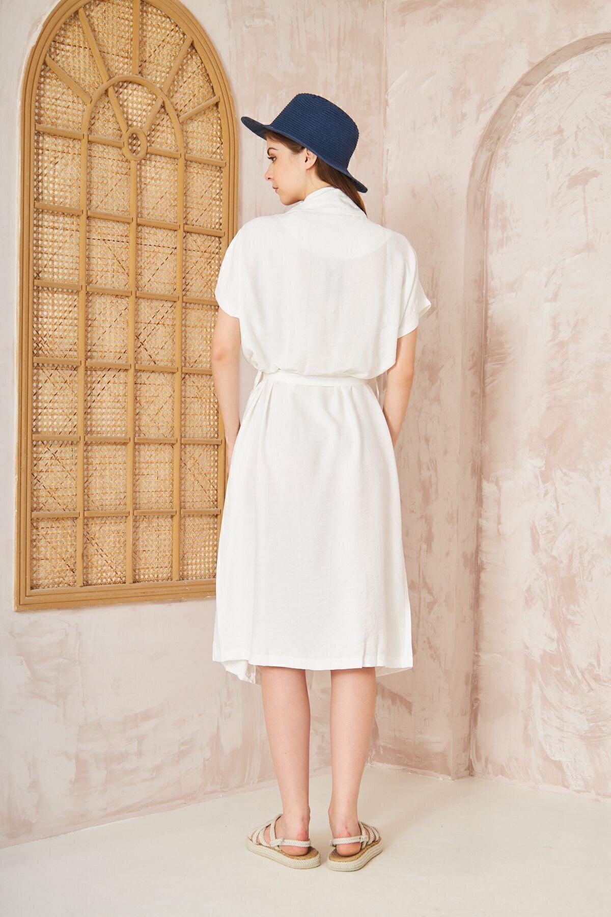 Oversize Wide-Cut Midi Short-Sleeved Linen Jacket Dress - White