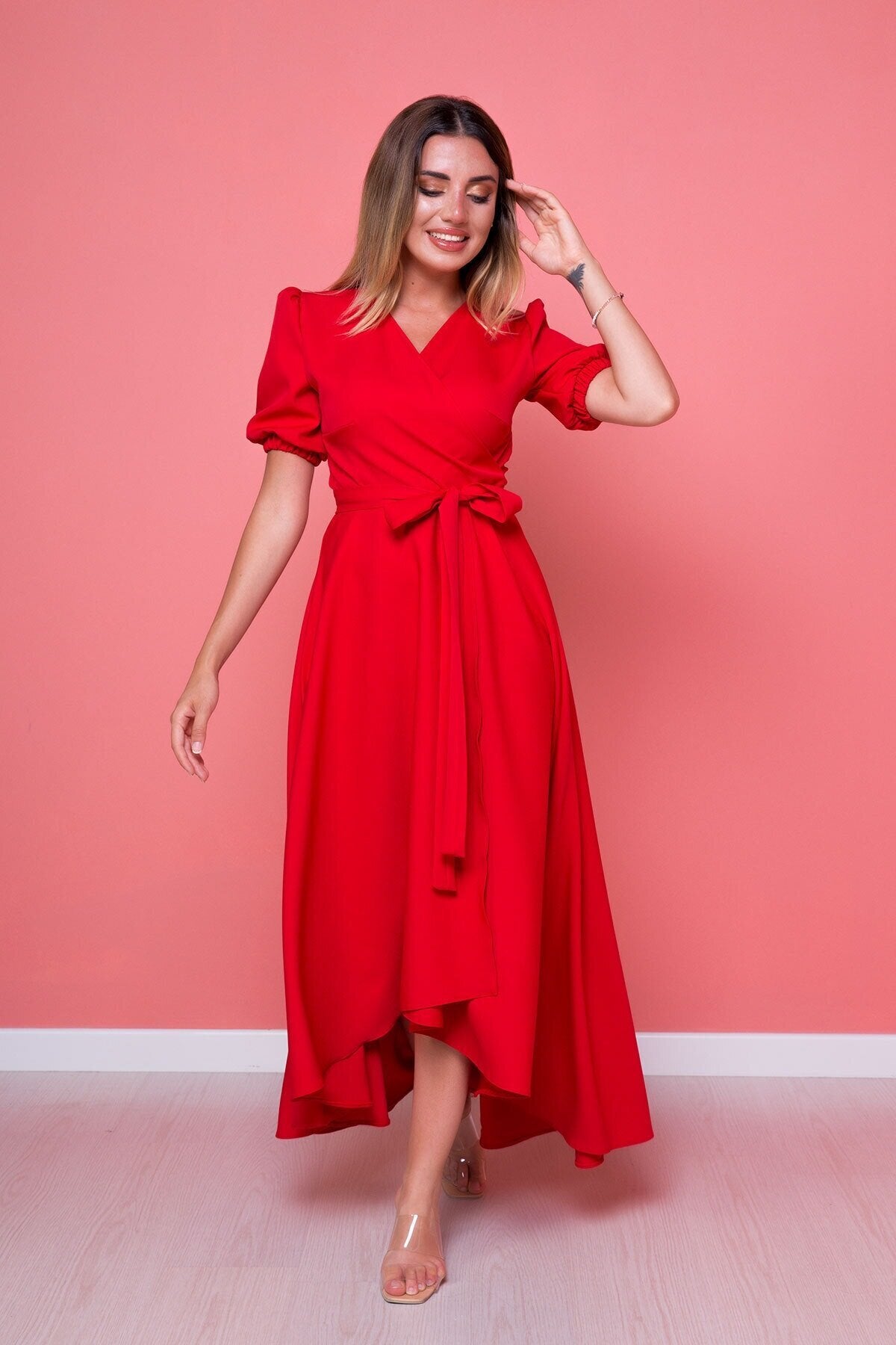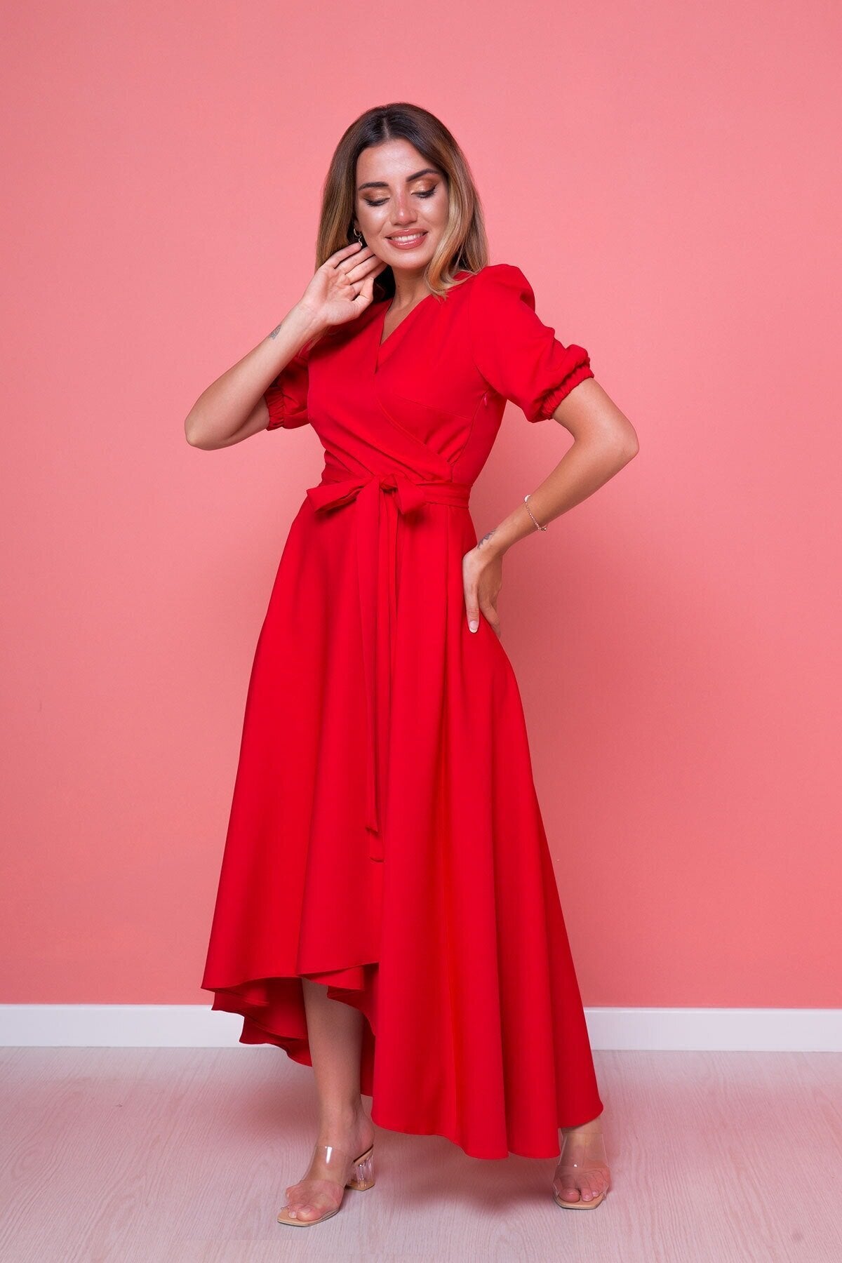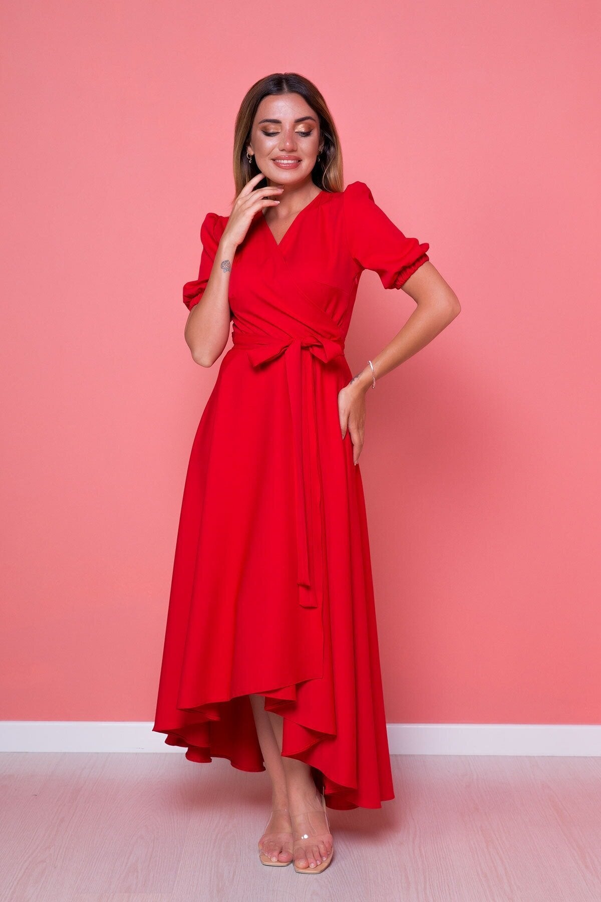 Plus Size Midi Asymmetrical Cut Dress - Red