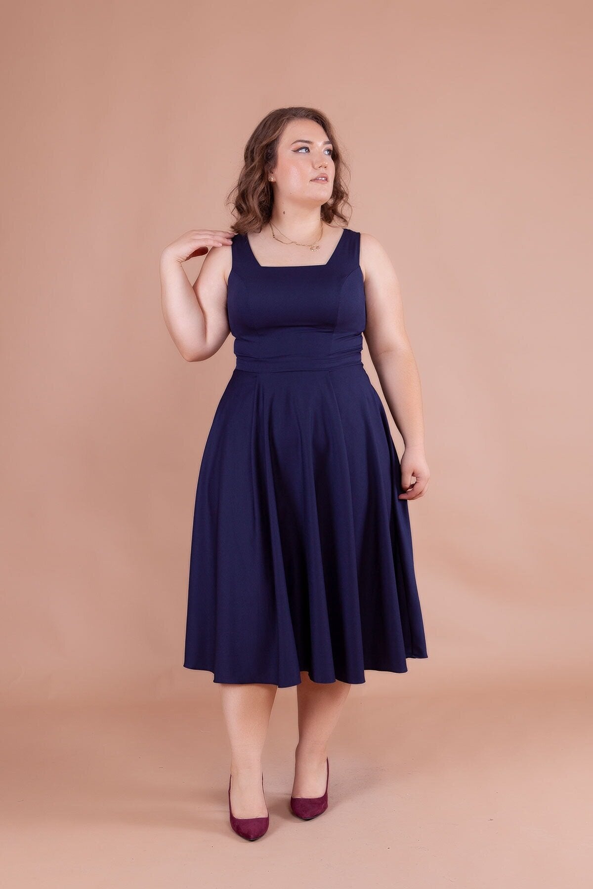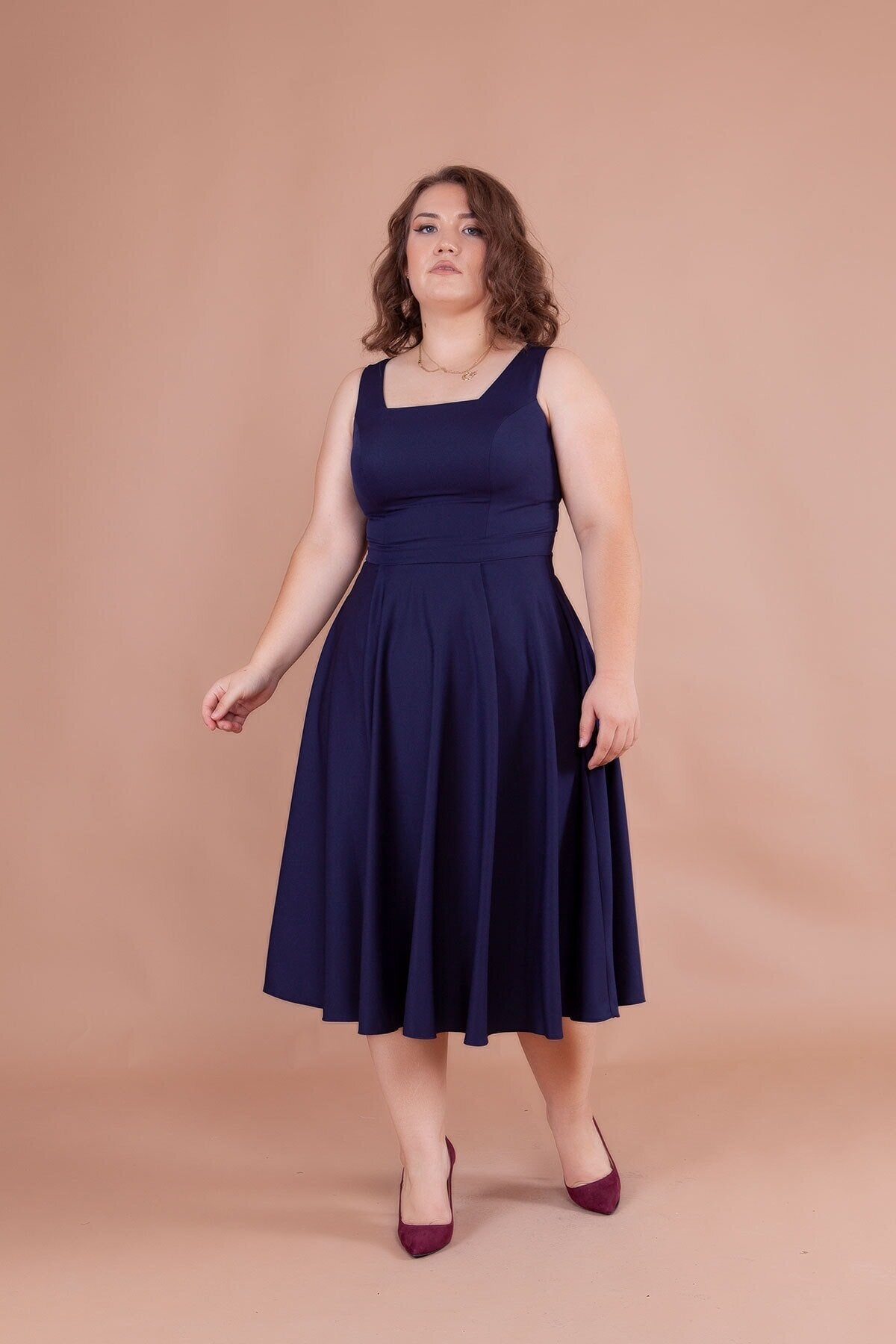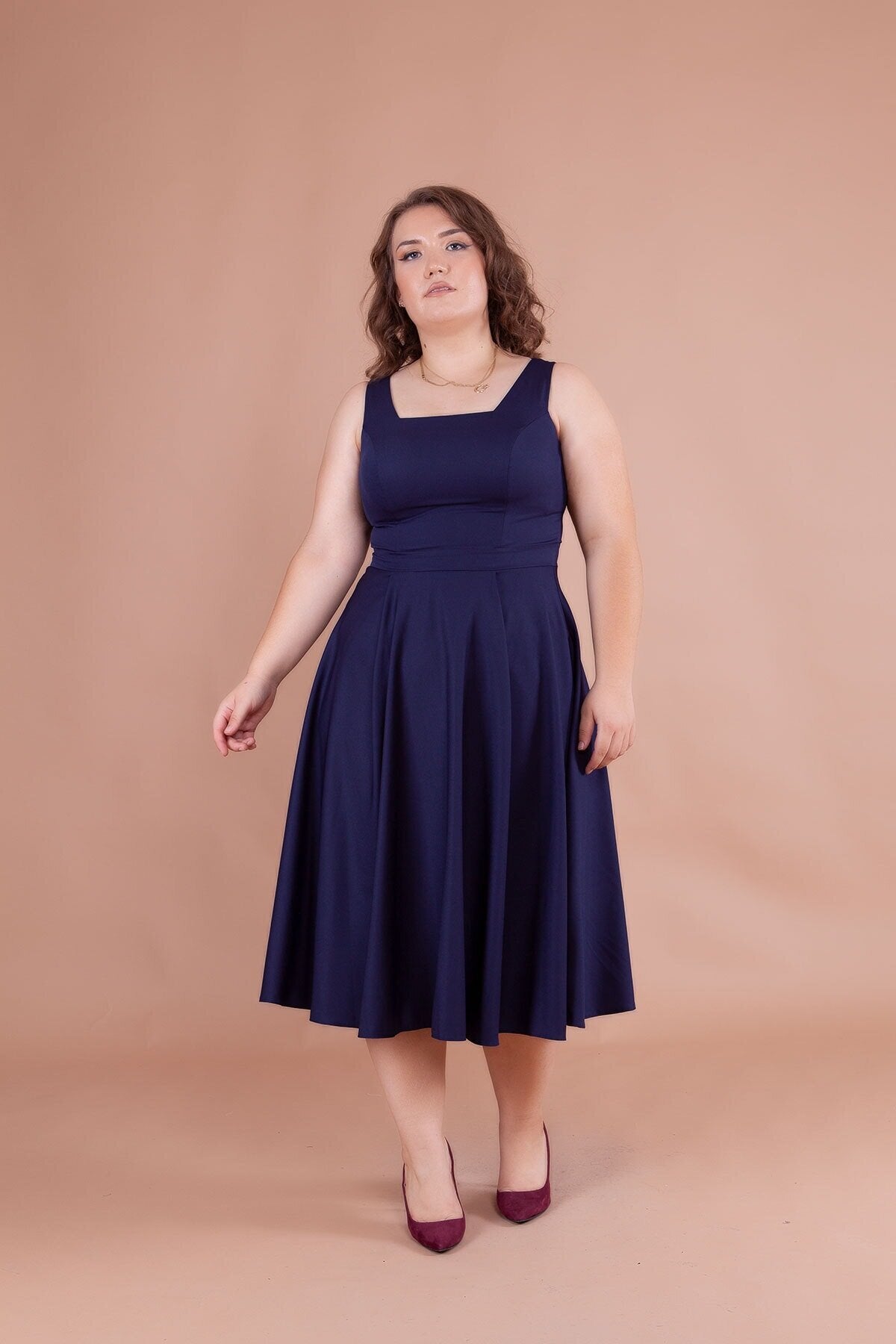 Plus Size Midi Strappy Square Neck Dress - Navy