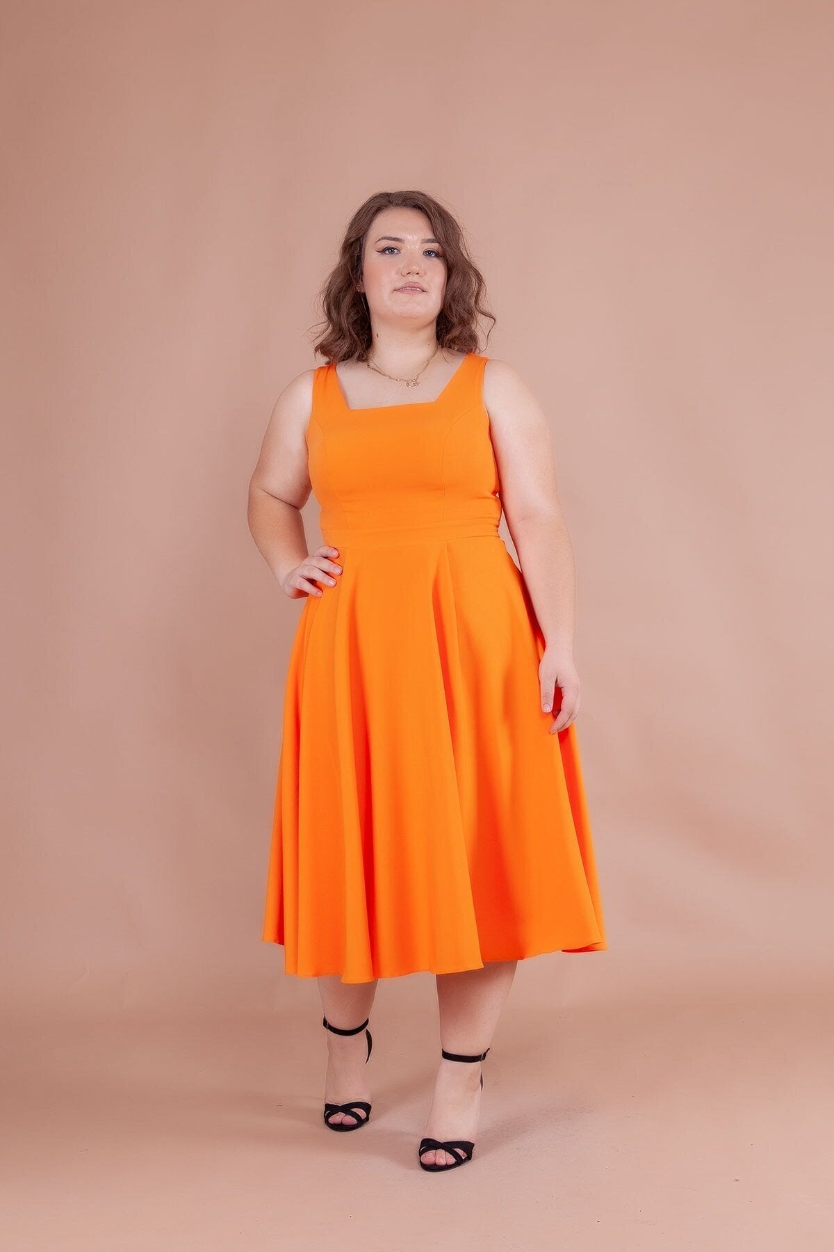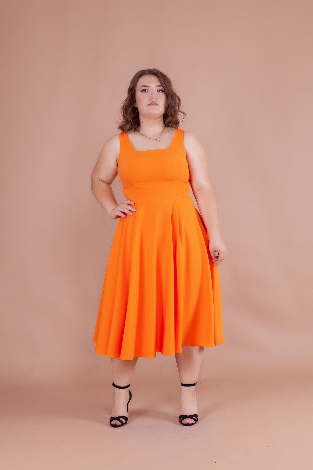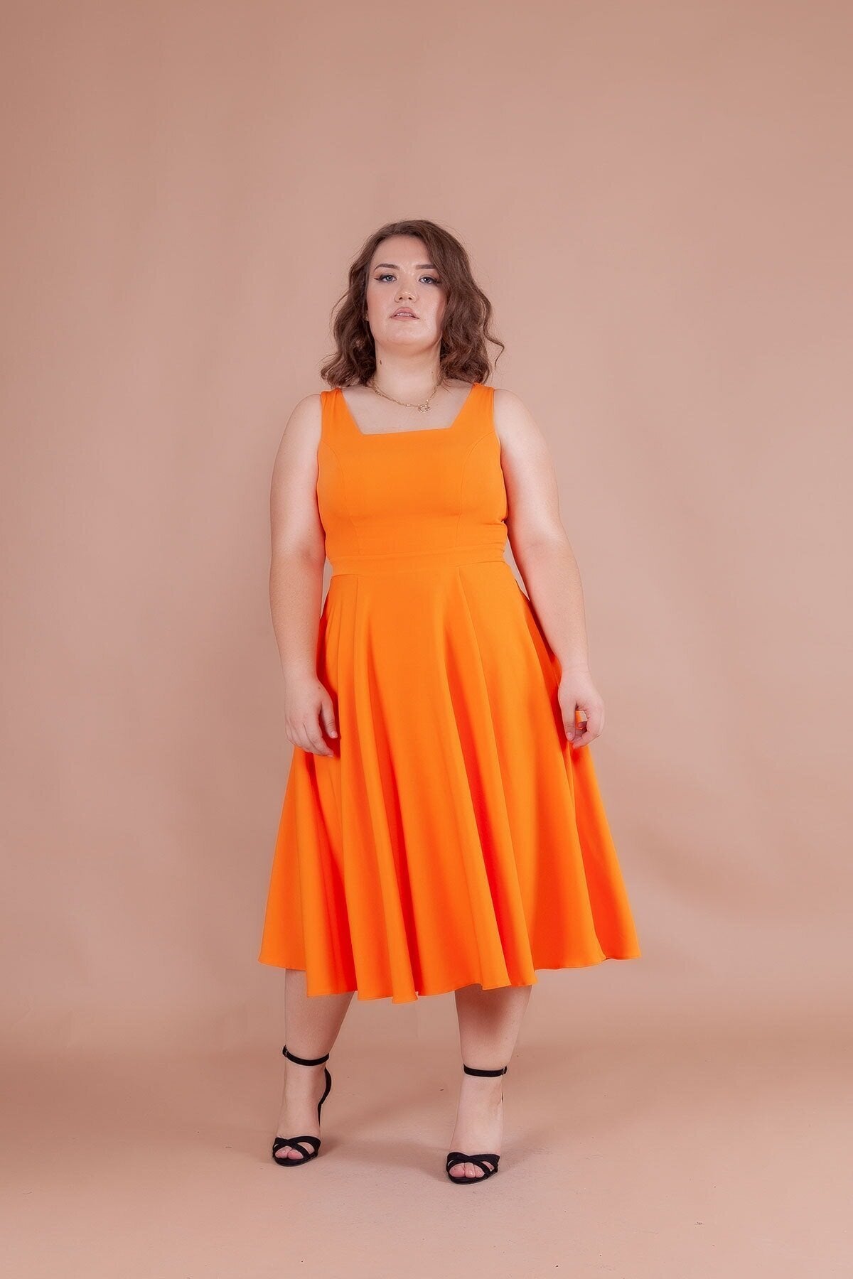Plus Size Midi Strappy Square Neck Dress - Orange