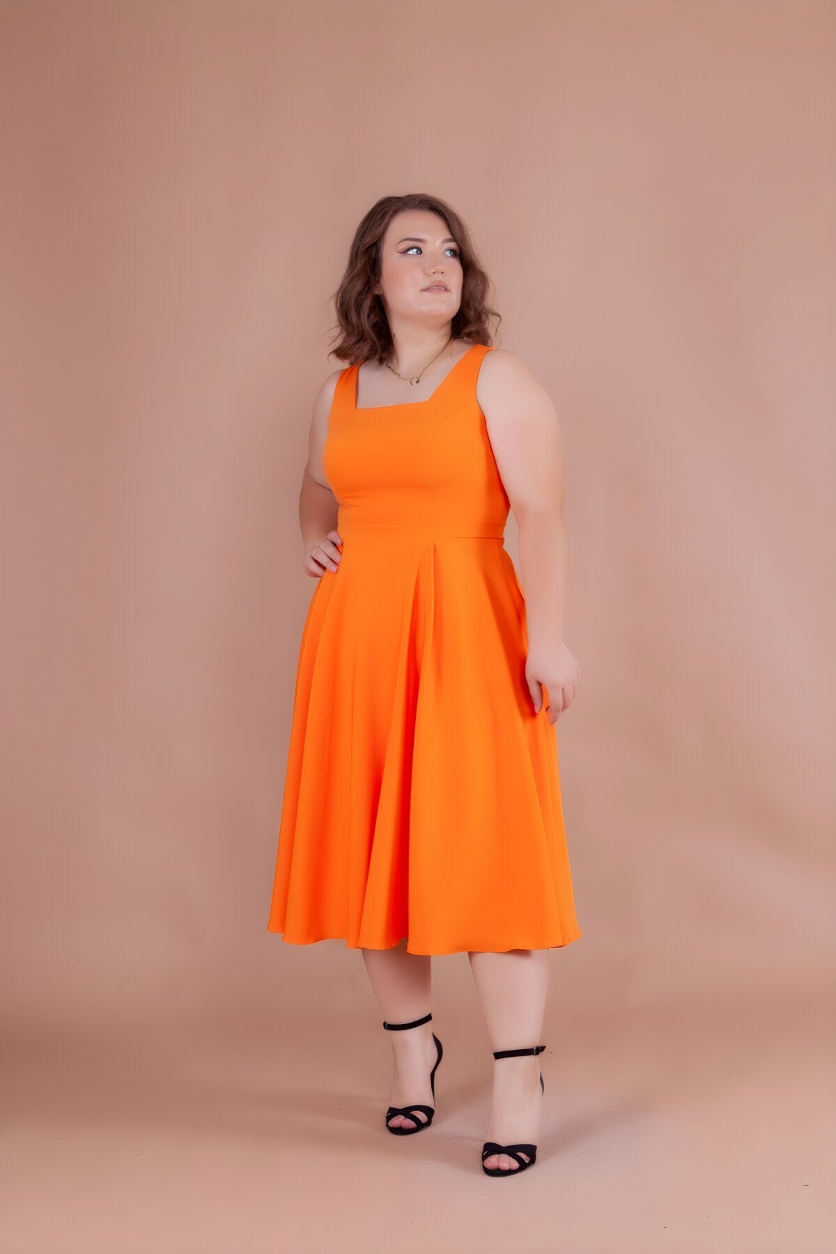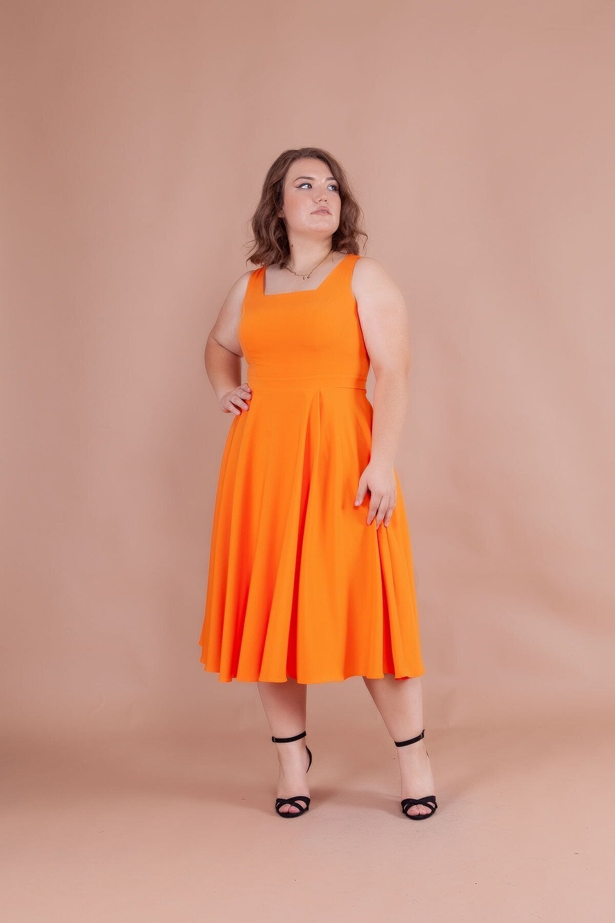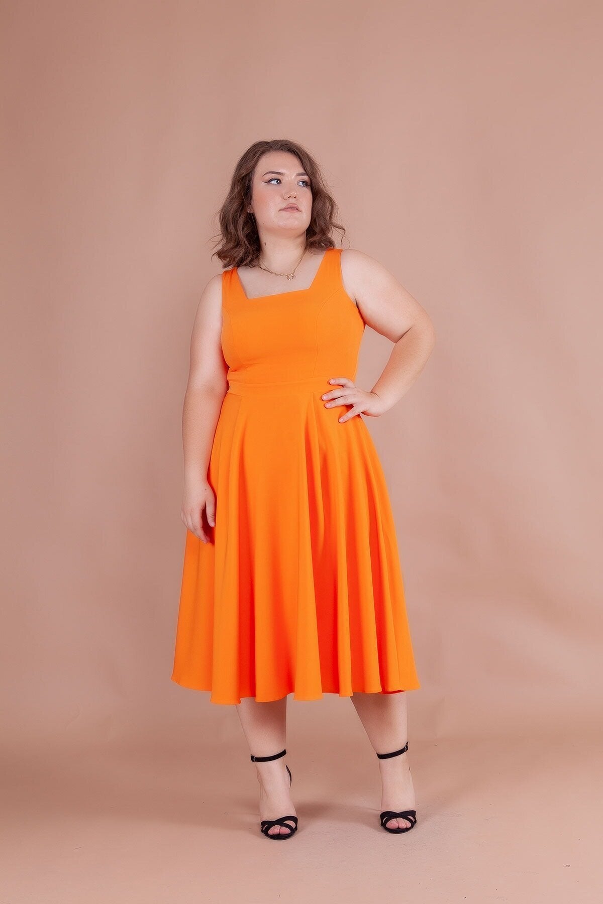 Plus Size Midi Strappy Square Neck Dress - Orange