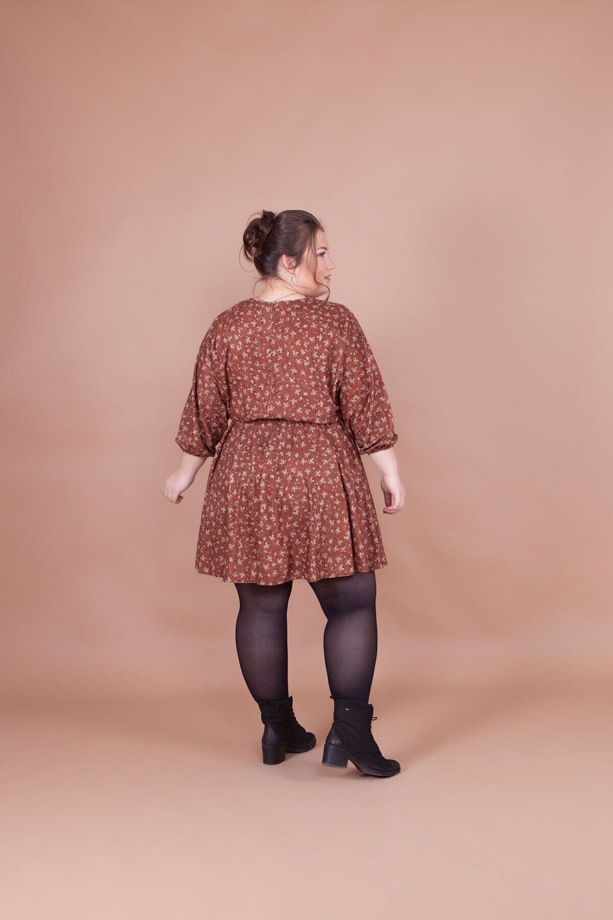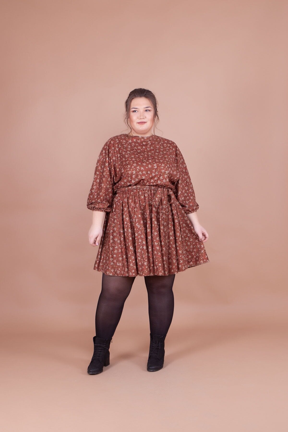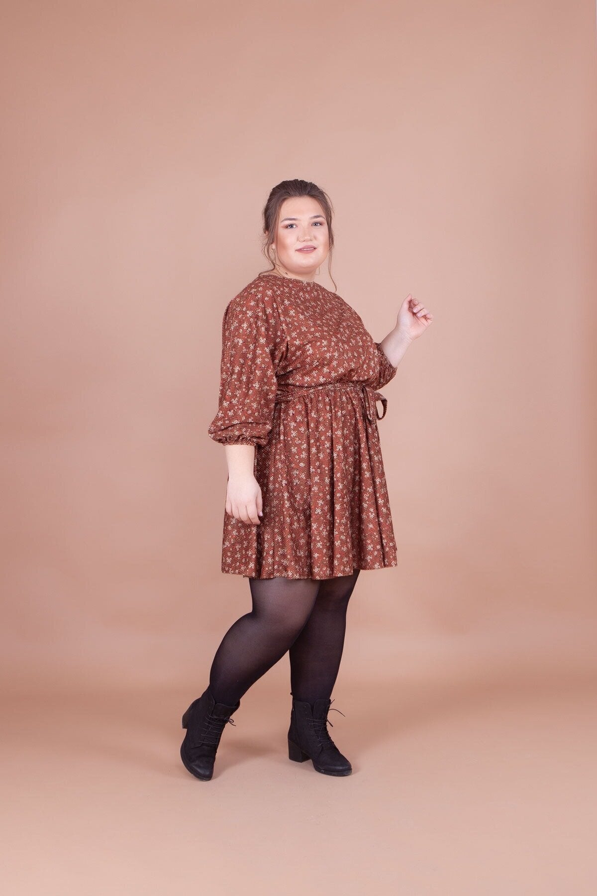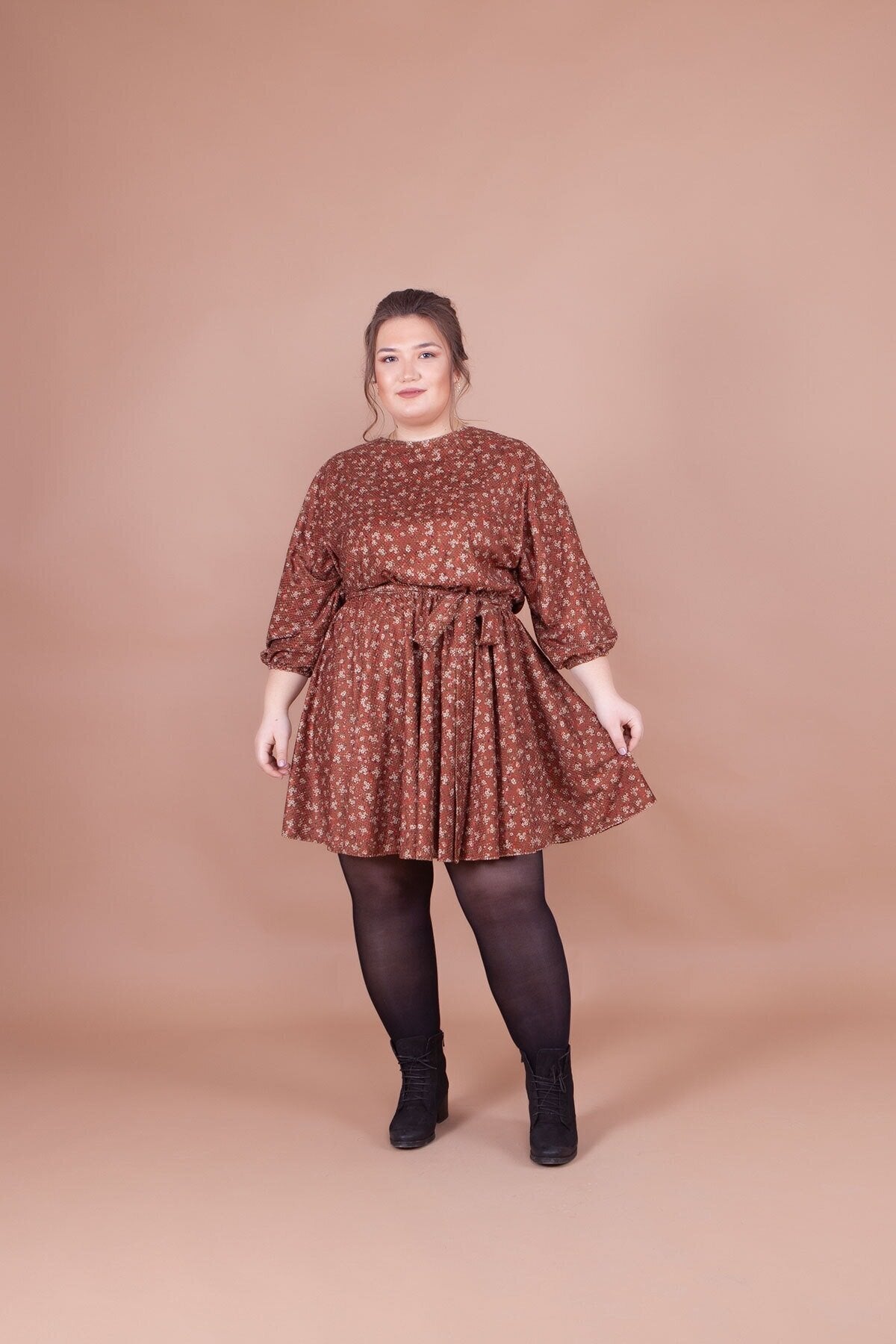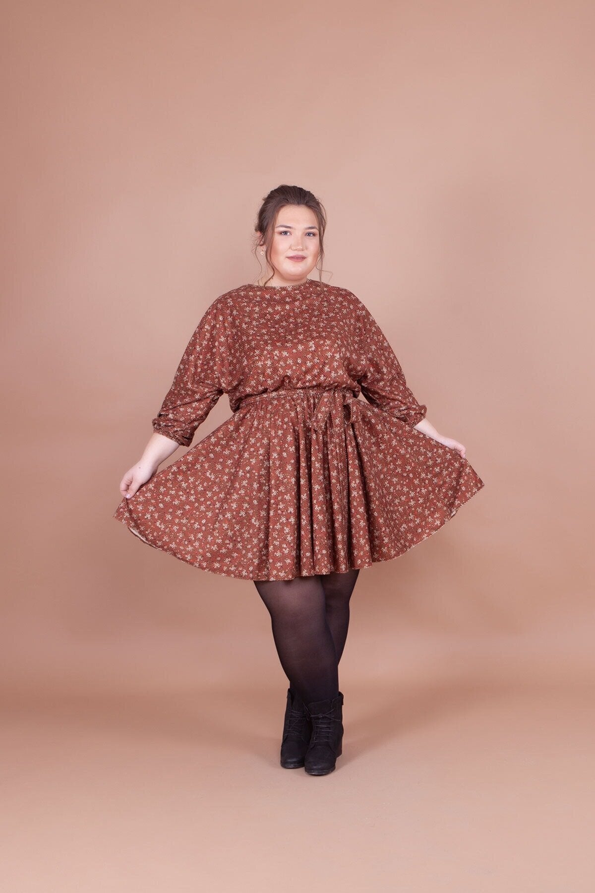 Plus Size Mini Batwing Sleeve Floral Velvet Dress - Tan