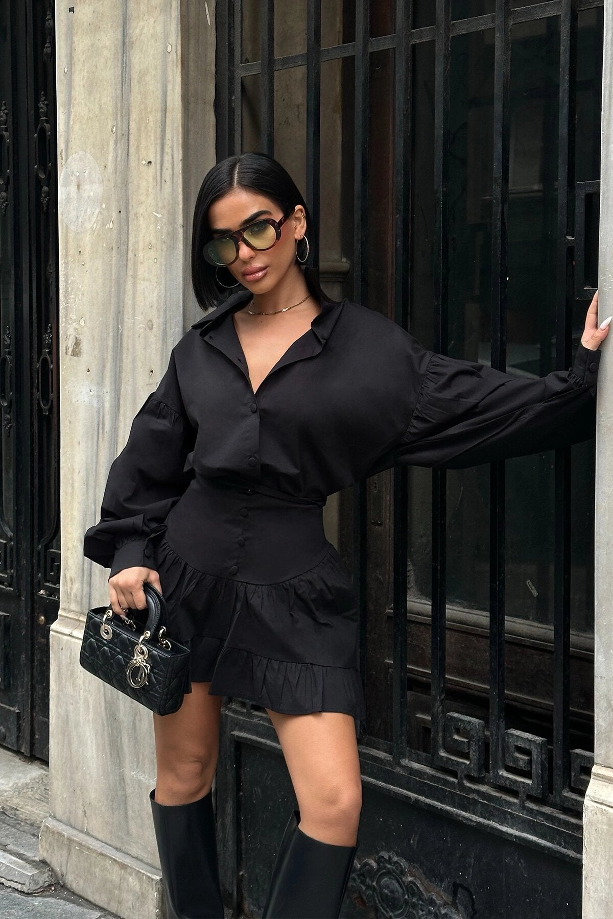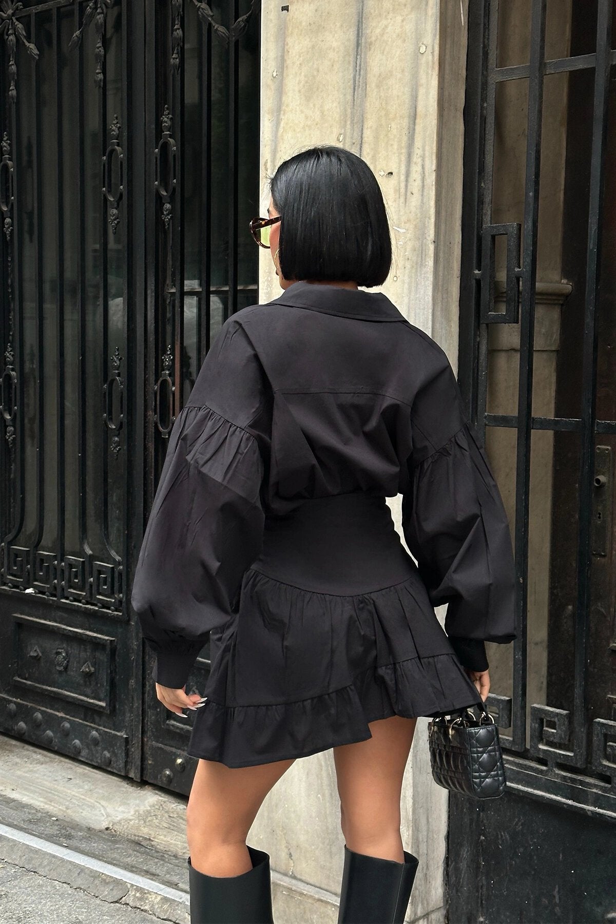 Poplin Two-Piece Buttoned Balloon Sleeve Set - Black