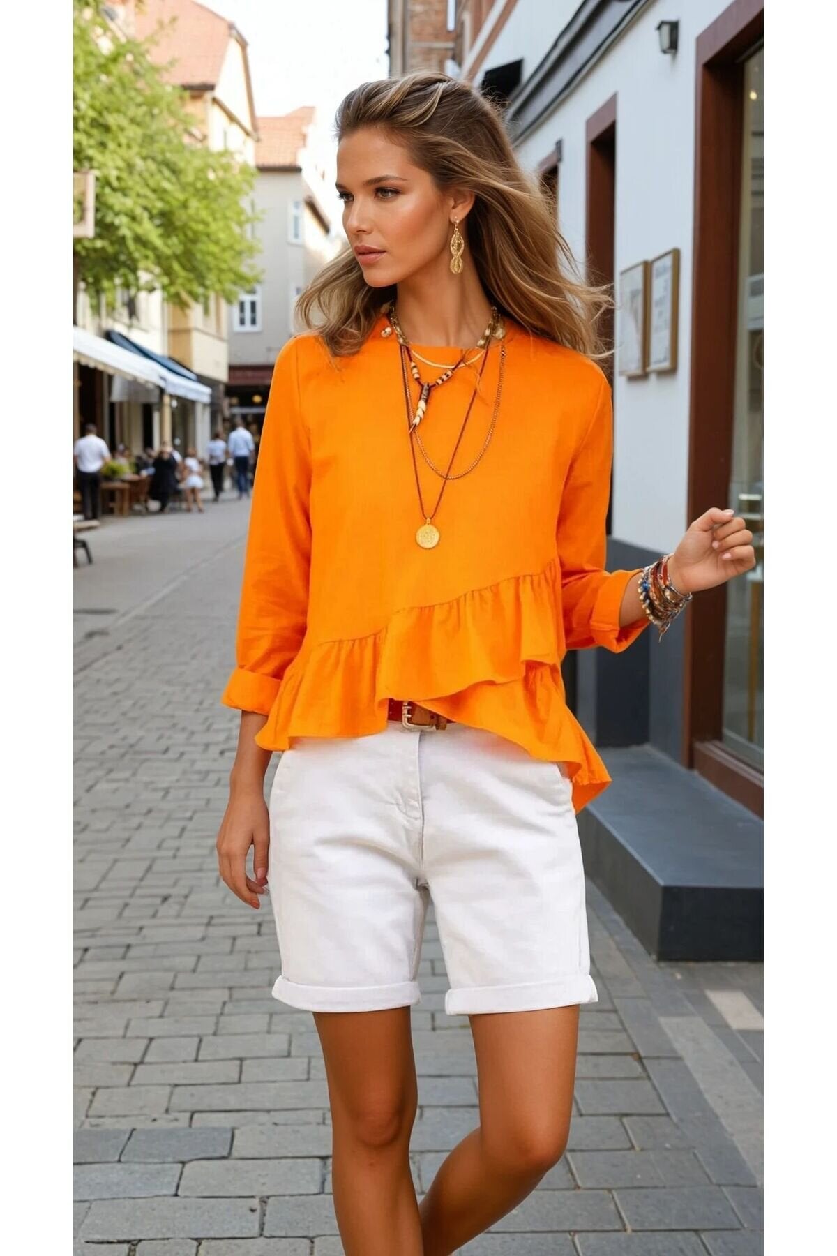 Relaxed Fit Long Back Ruffled Cotton Linen Blouse - Orange