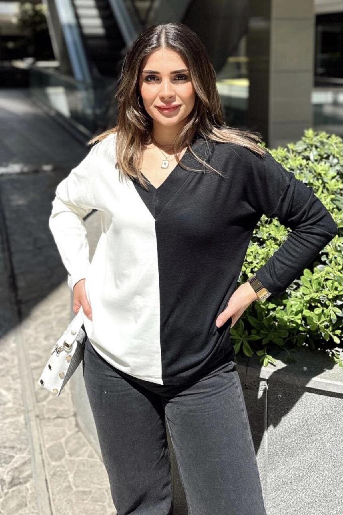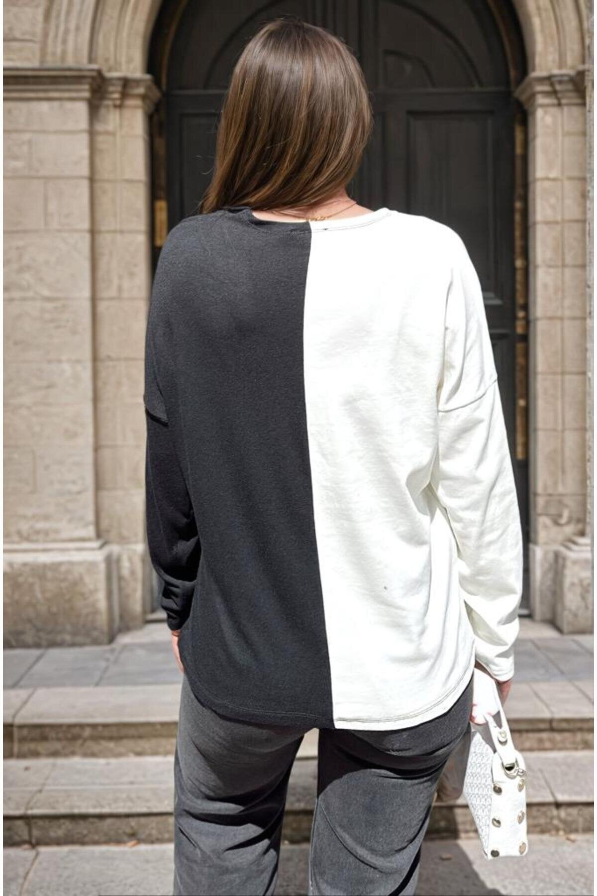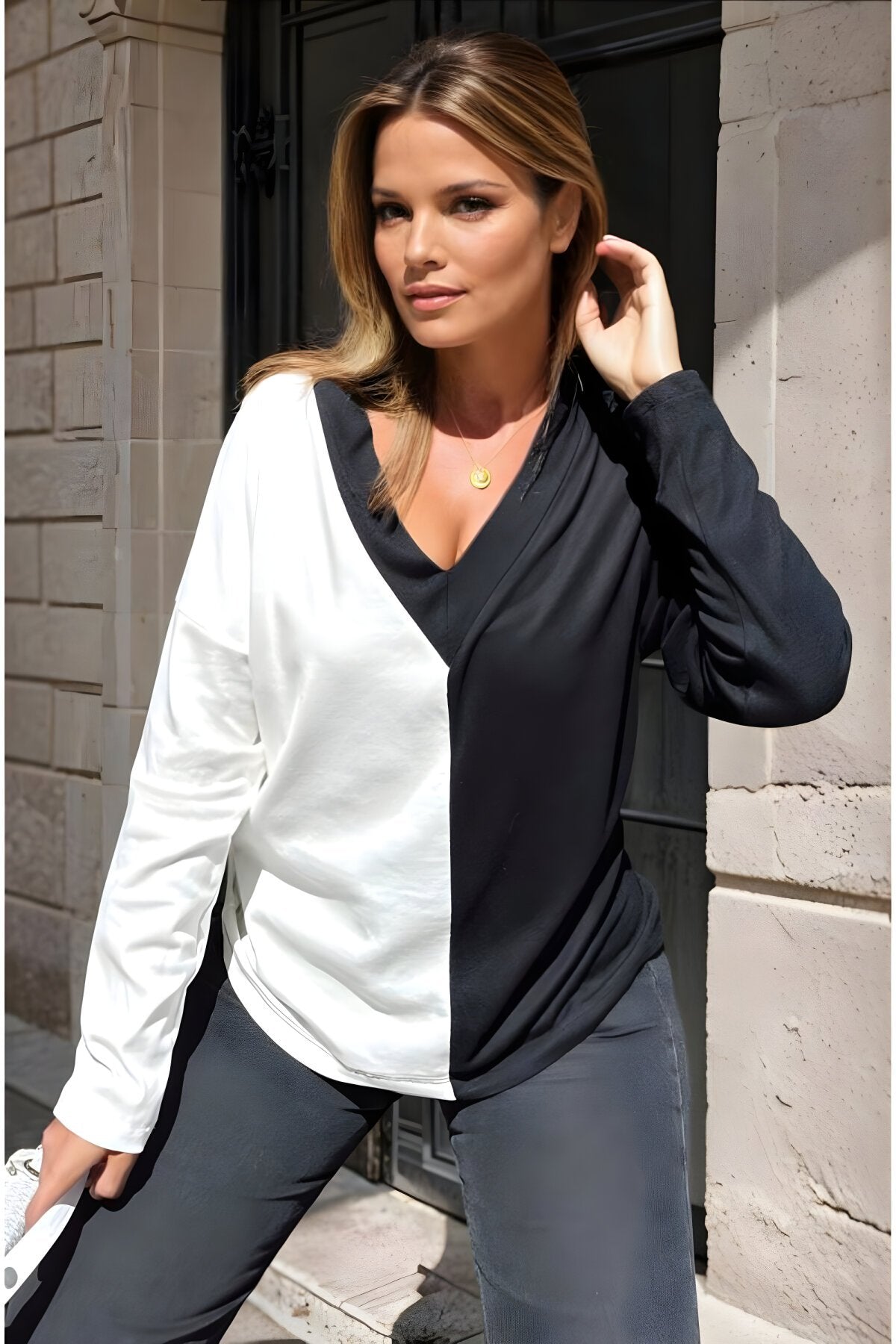 Relaxed Fit Long Sleeve Color Block V Neck Blouse - White