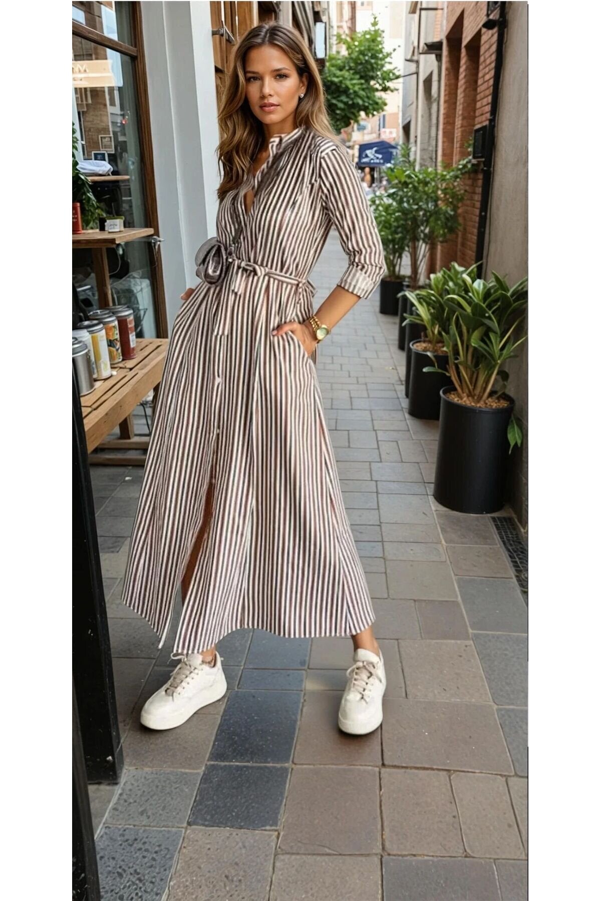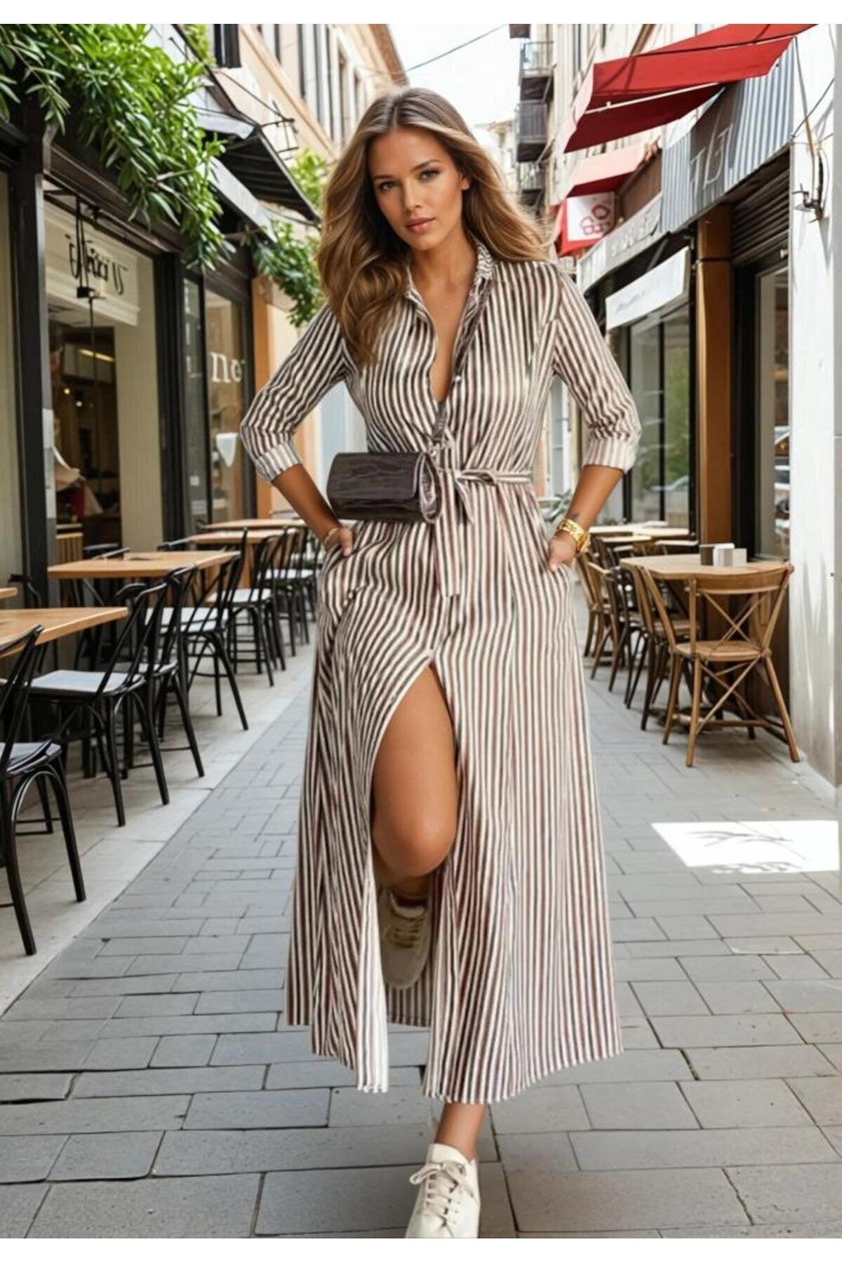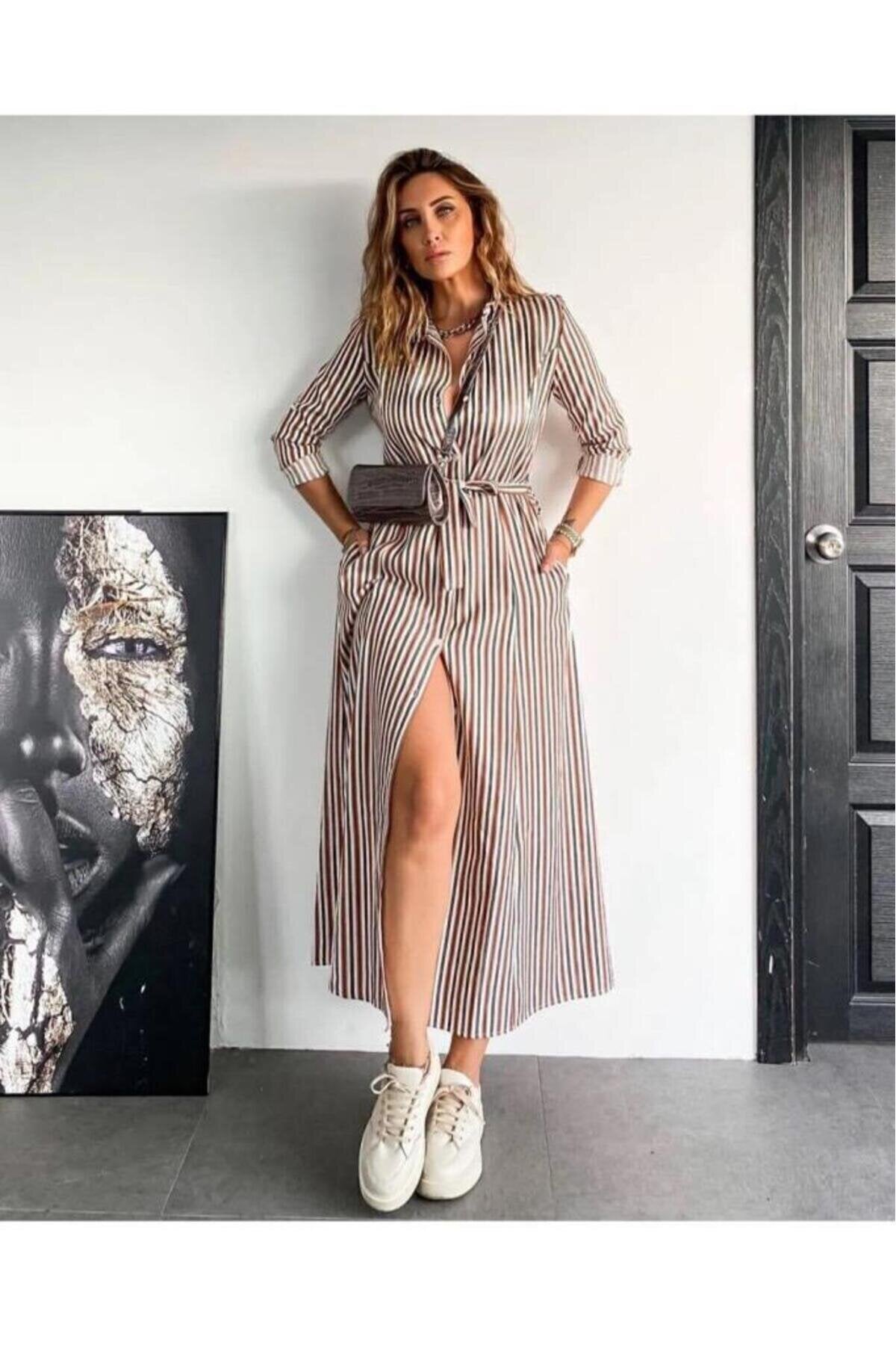 Relaxed Fit Long-Sleeved Striped Wrinkle-Free Pocketed Shirt Dress - Terracotta/Black/Beige