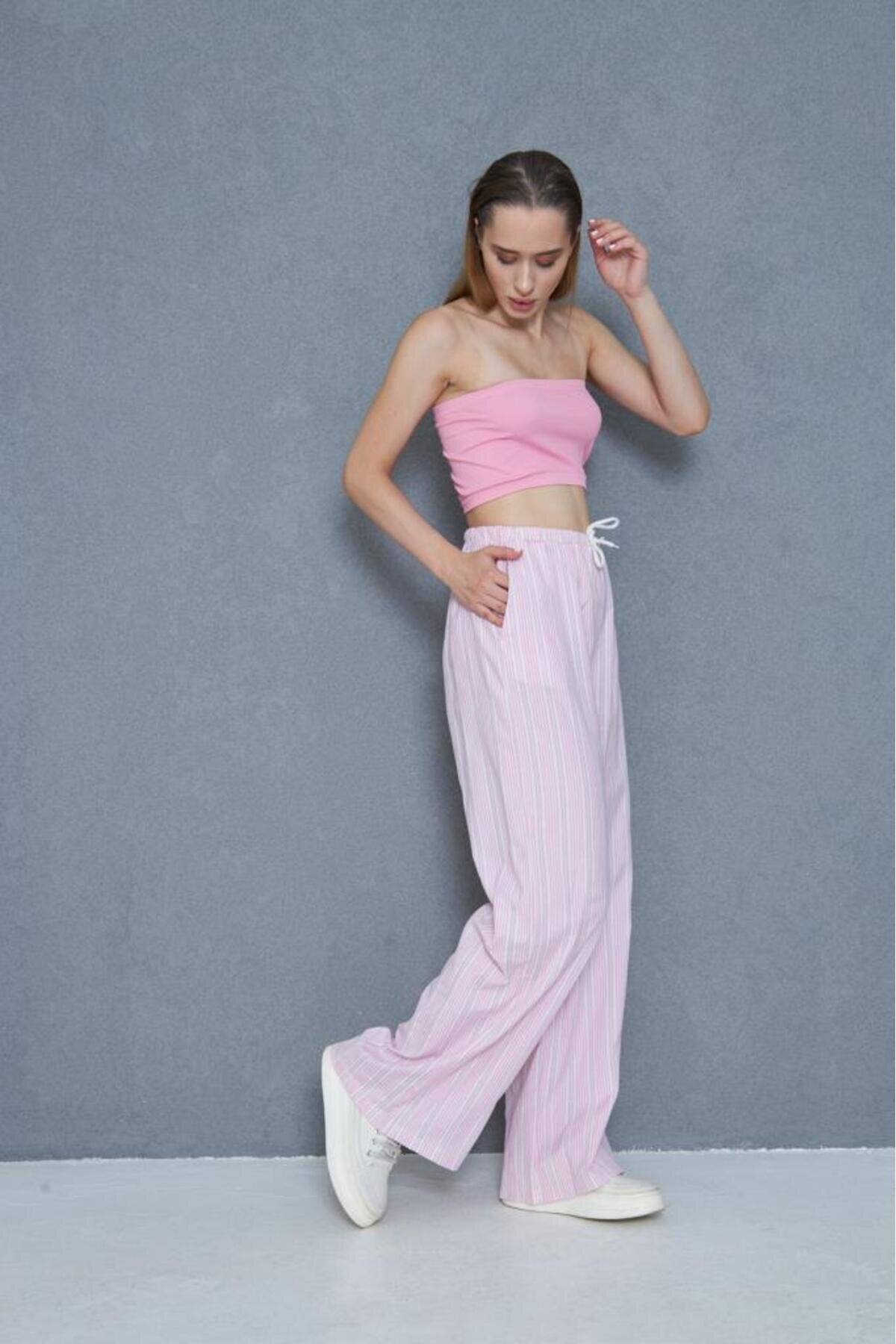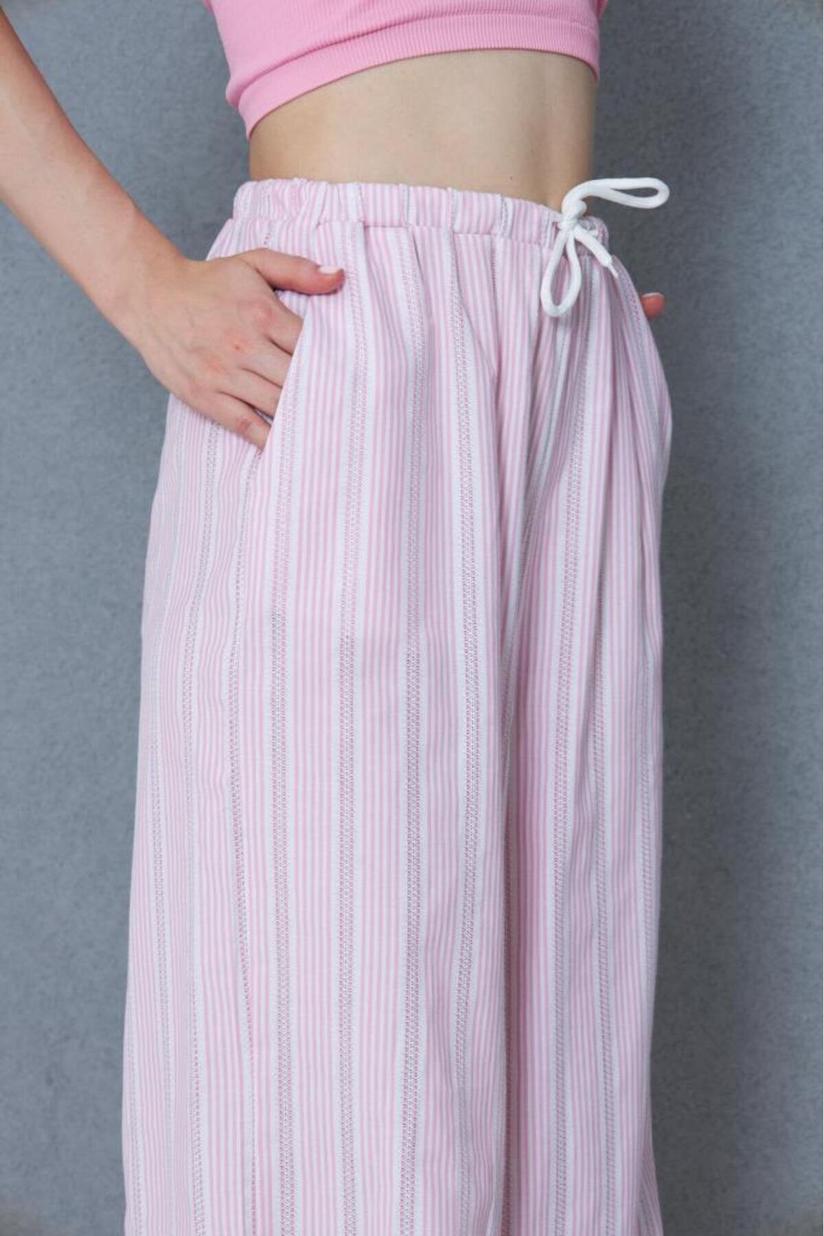Relaxed Fit Wide Leg Poplin Drawstring Eyelet Pants - Pink