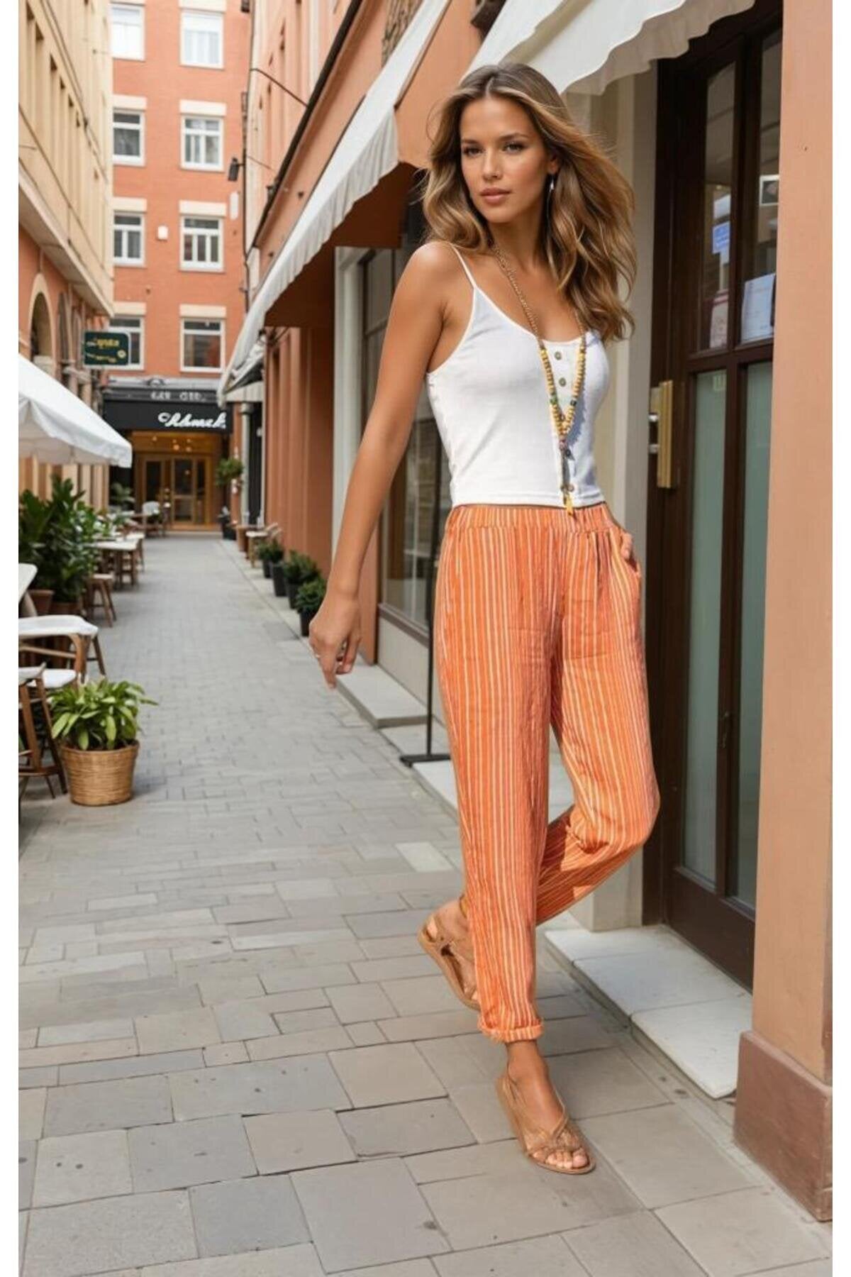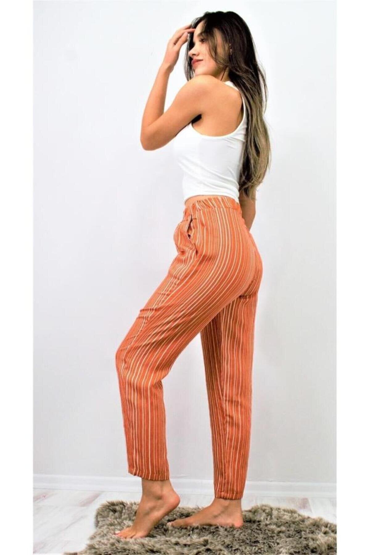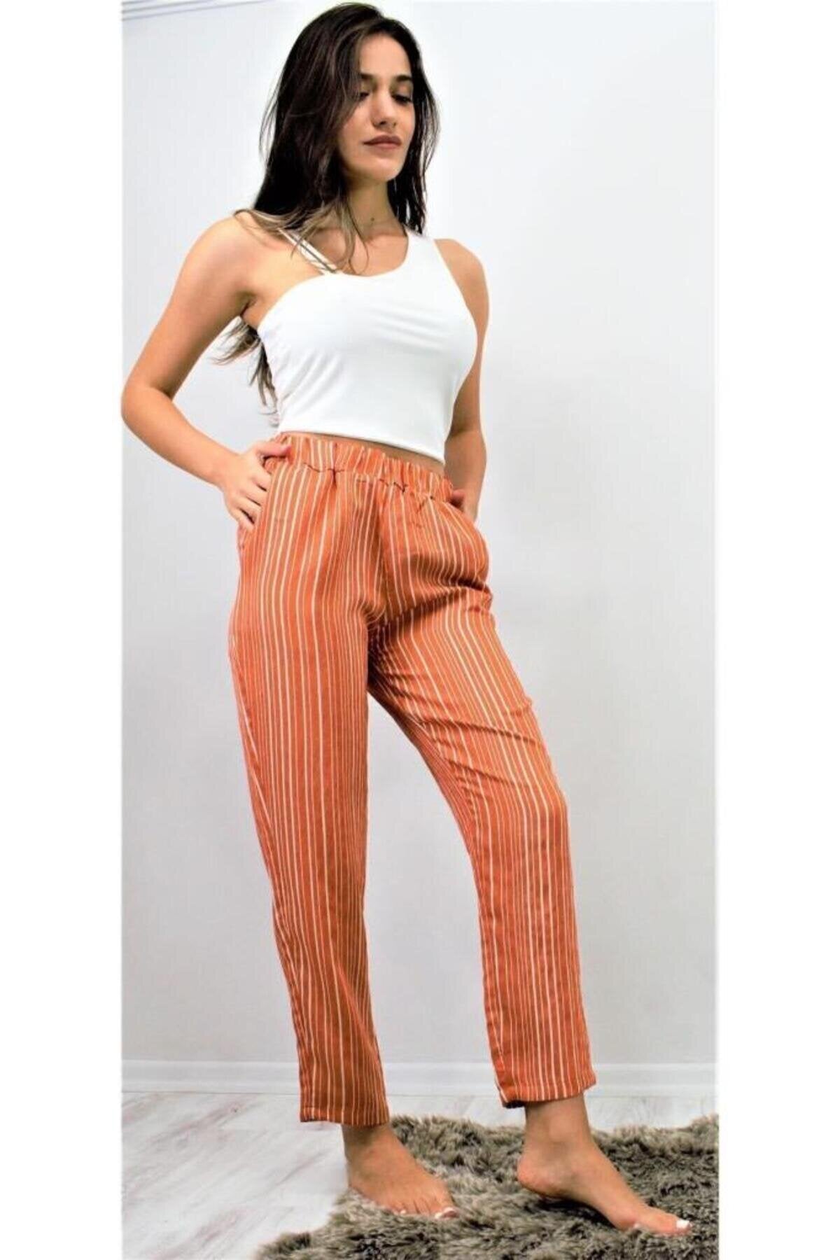 Relaxed Summer Vertical Striped Elastic Waist Cuffed Pants - Rust