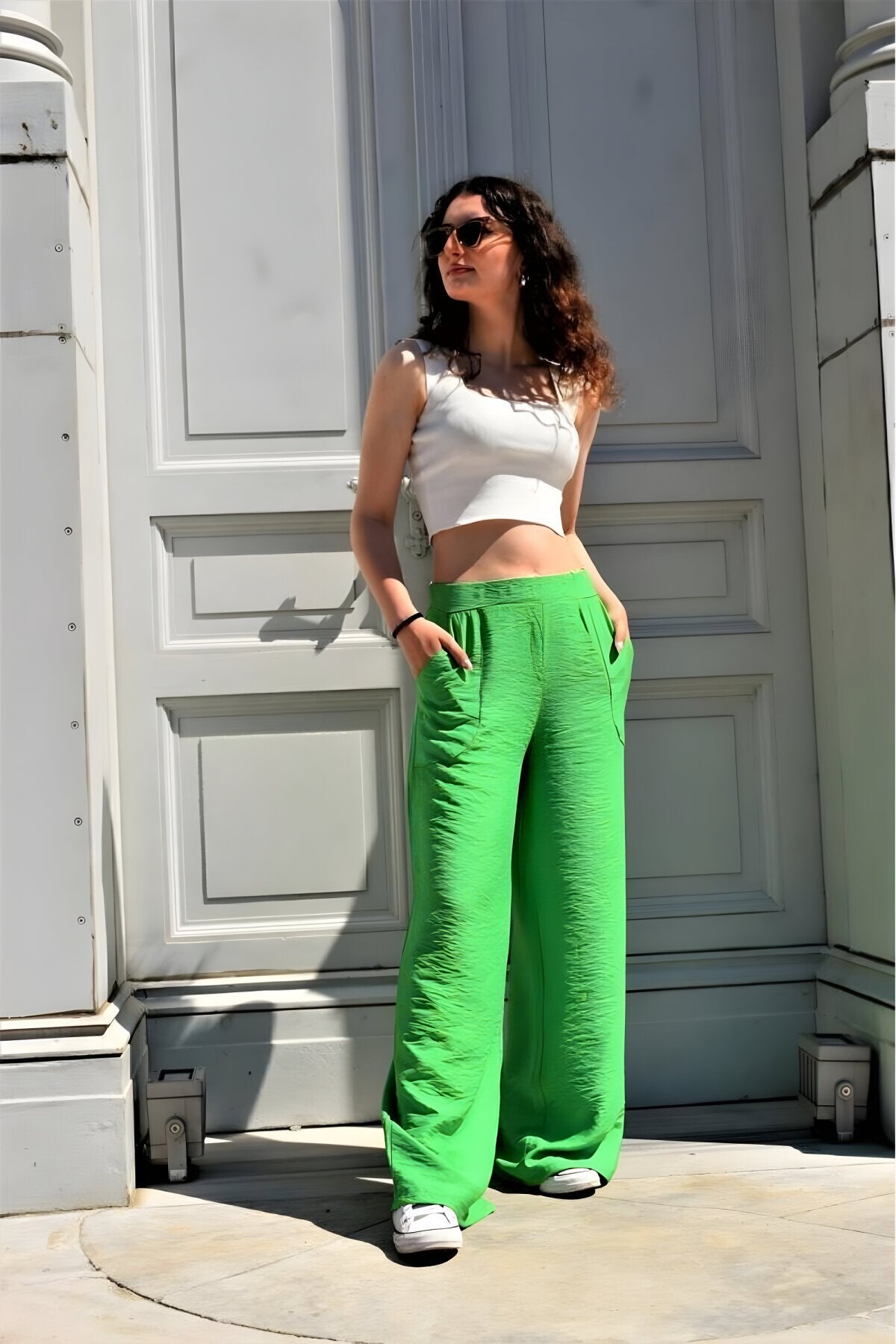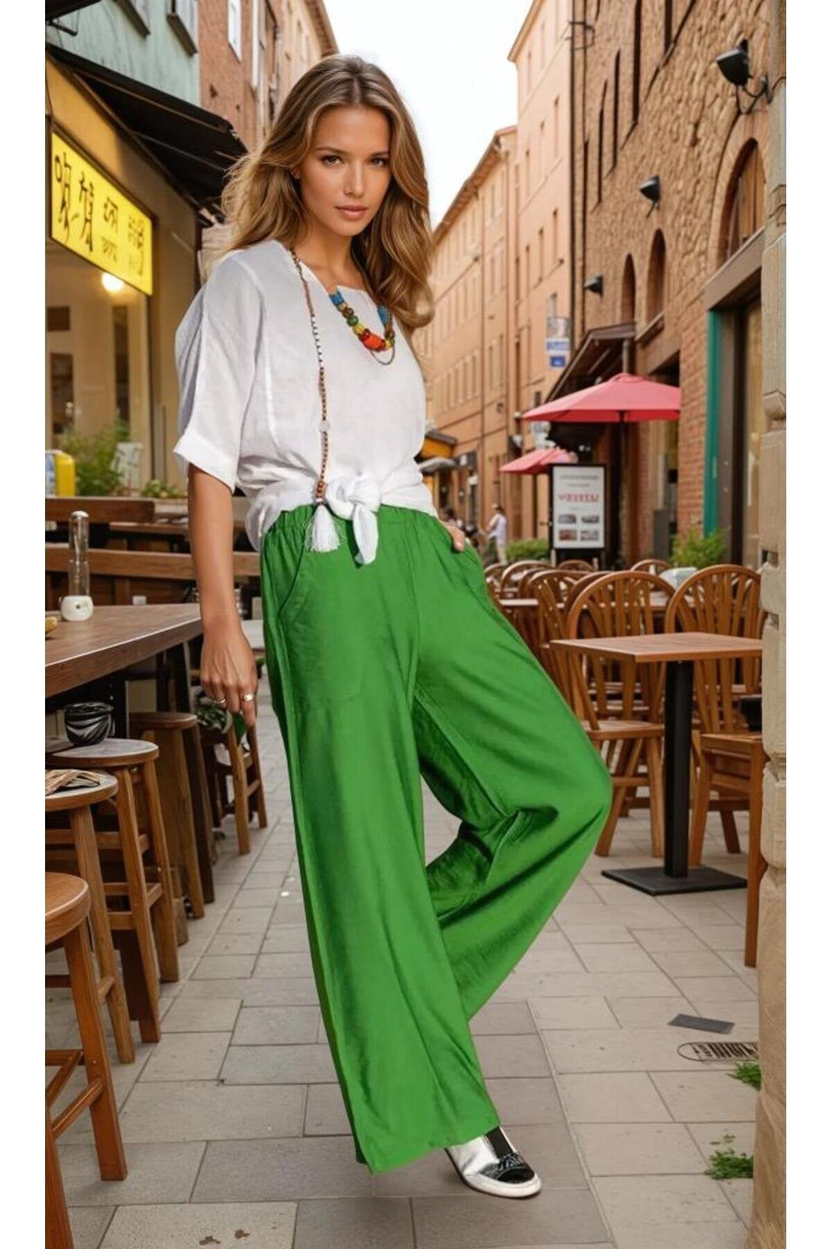 Relaxed Wide Leg Linen-Look Elastic Waist Pants - Green