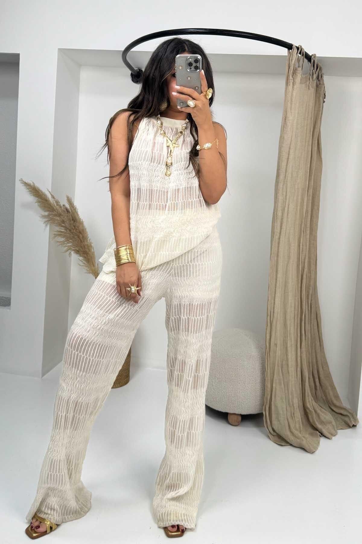 Semi-Sheer Textured Two-Piece Set - Ecru