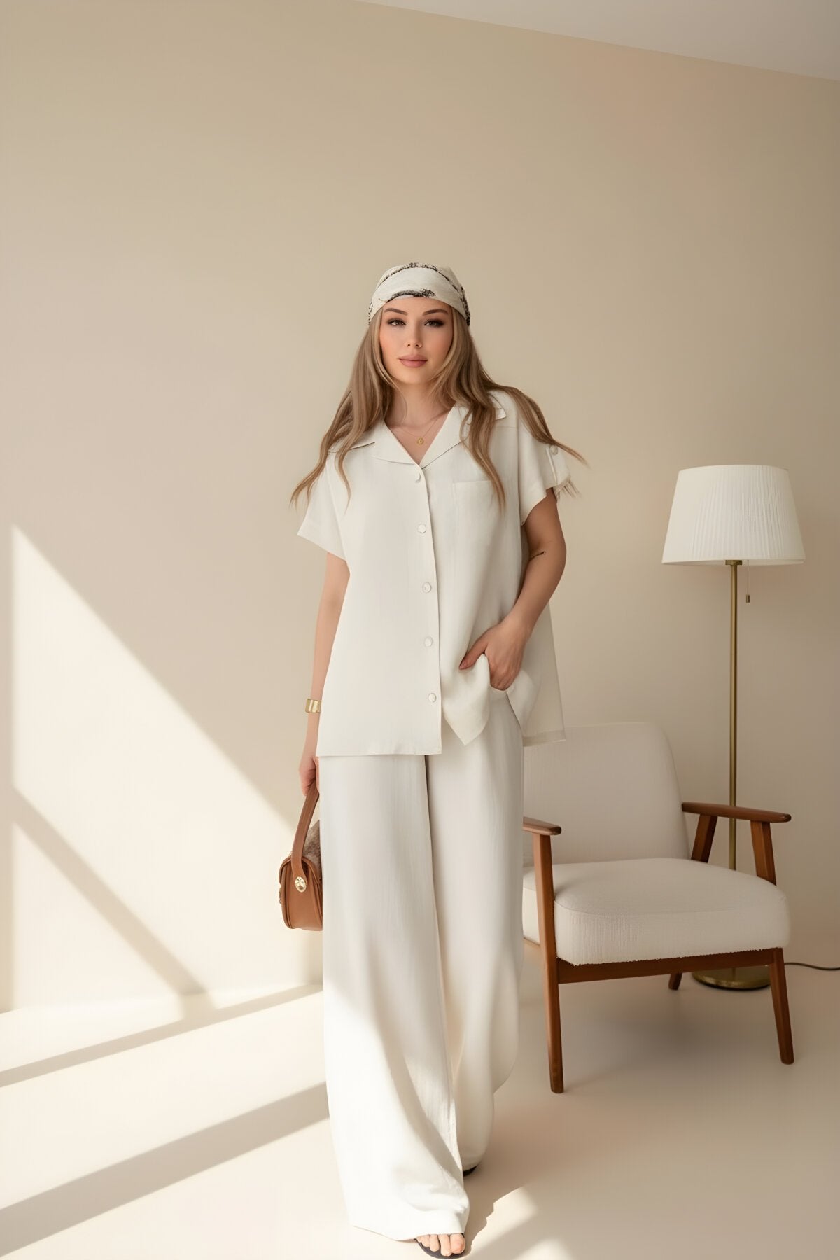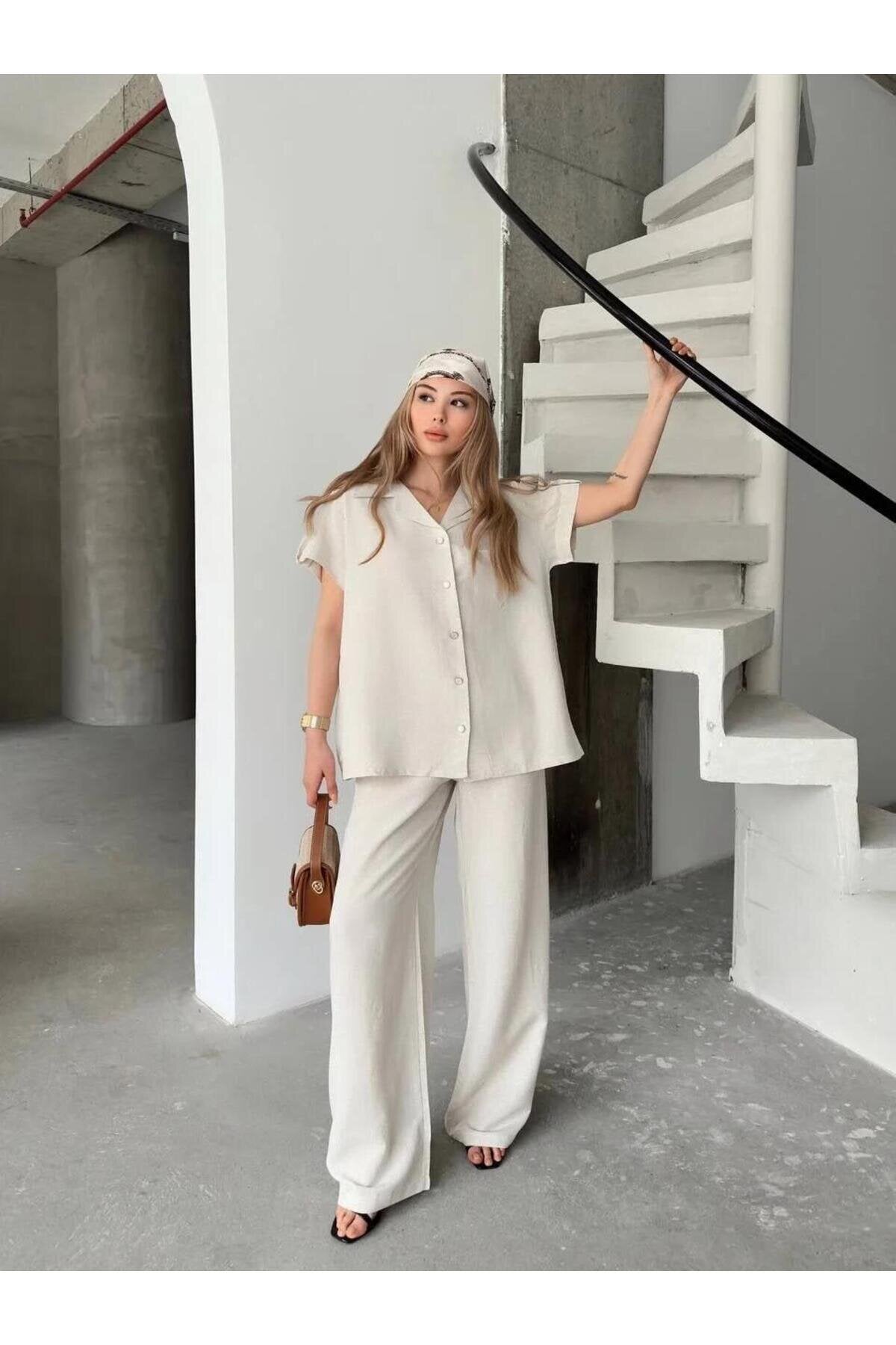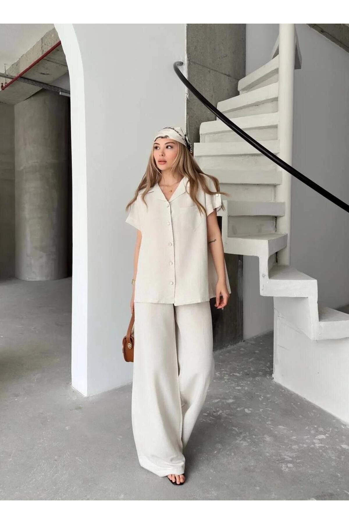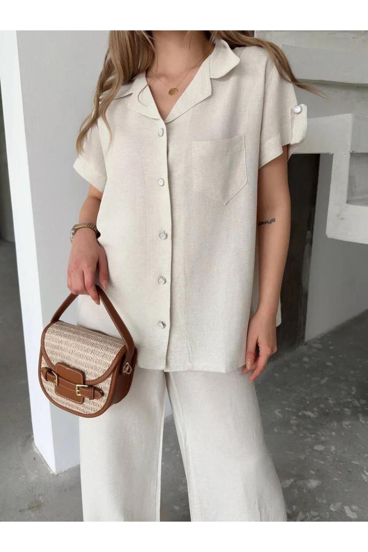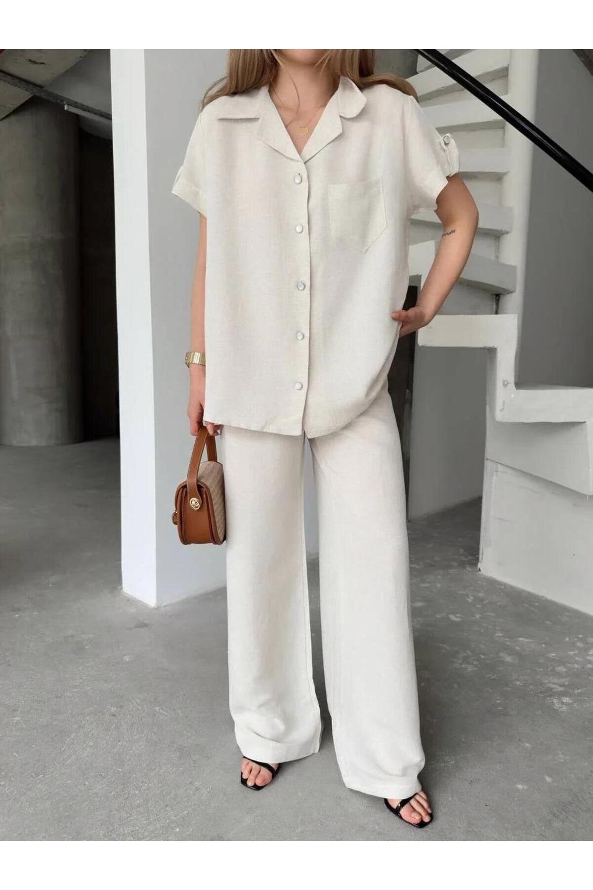 Short Sleeve Linen Pocketed Shirt and Pants Set - White