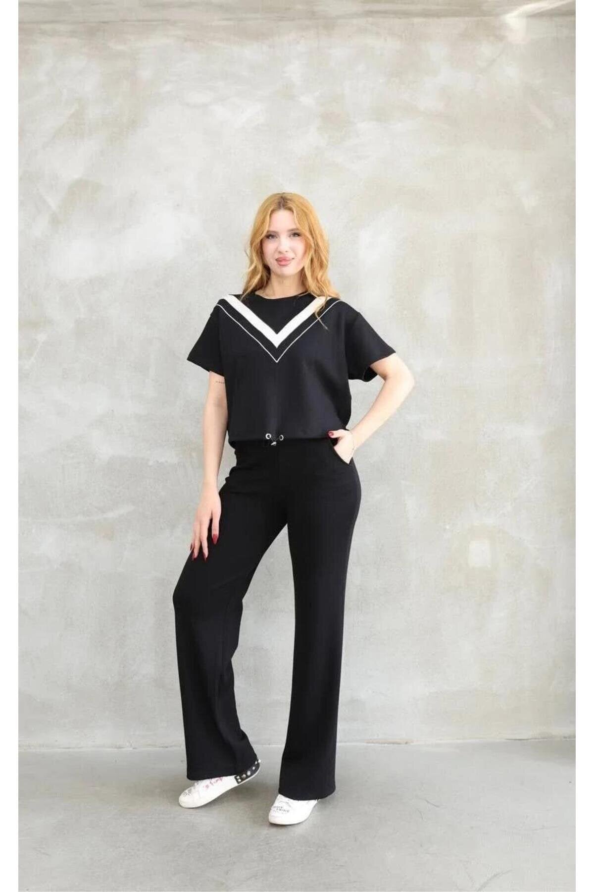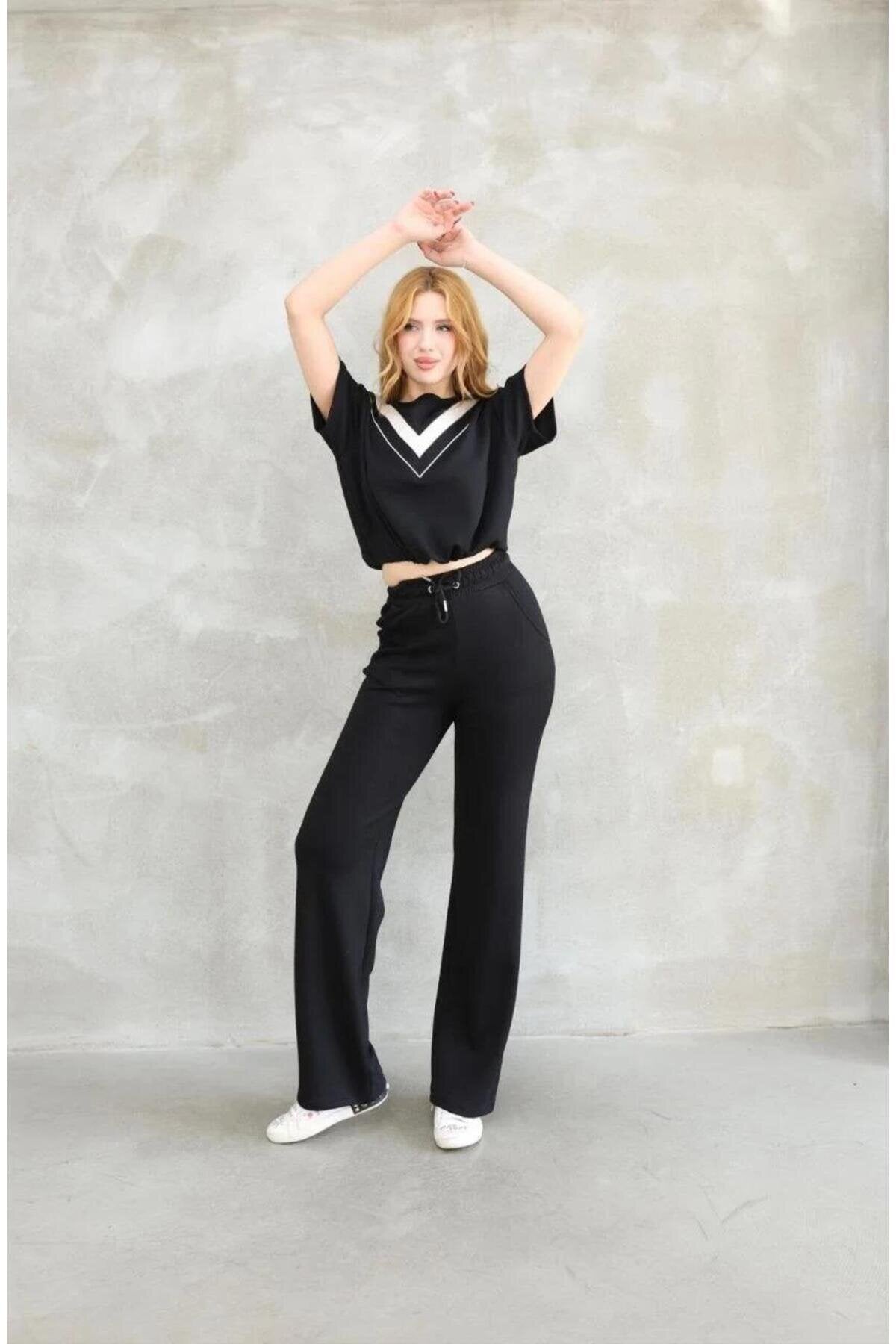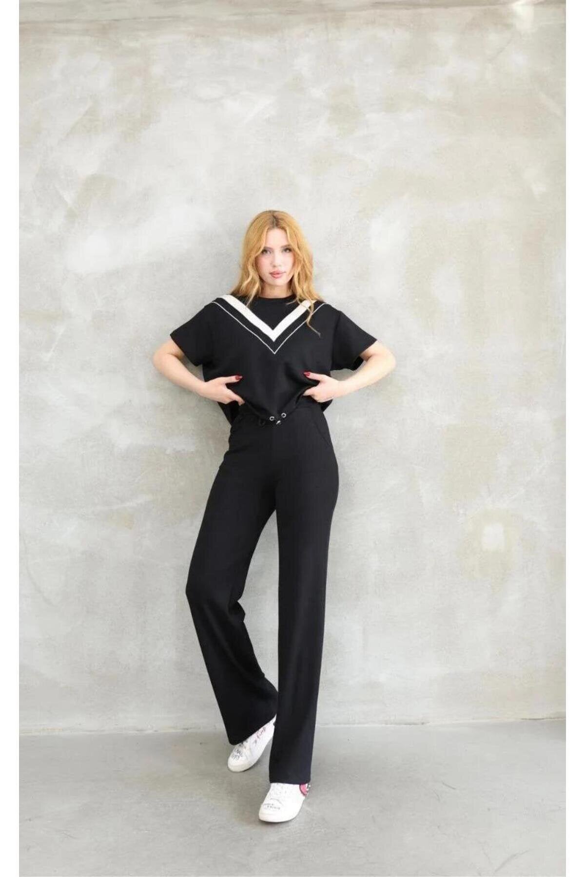 Short Sleeved Crew Neck Osy Modal Paneled Set - Black