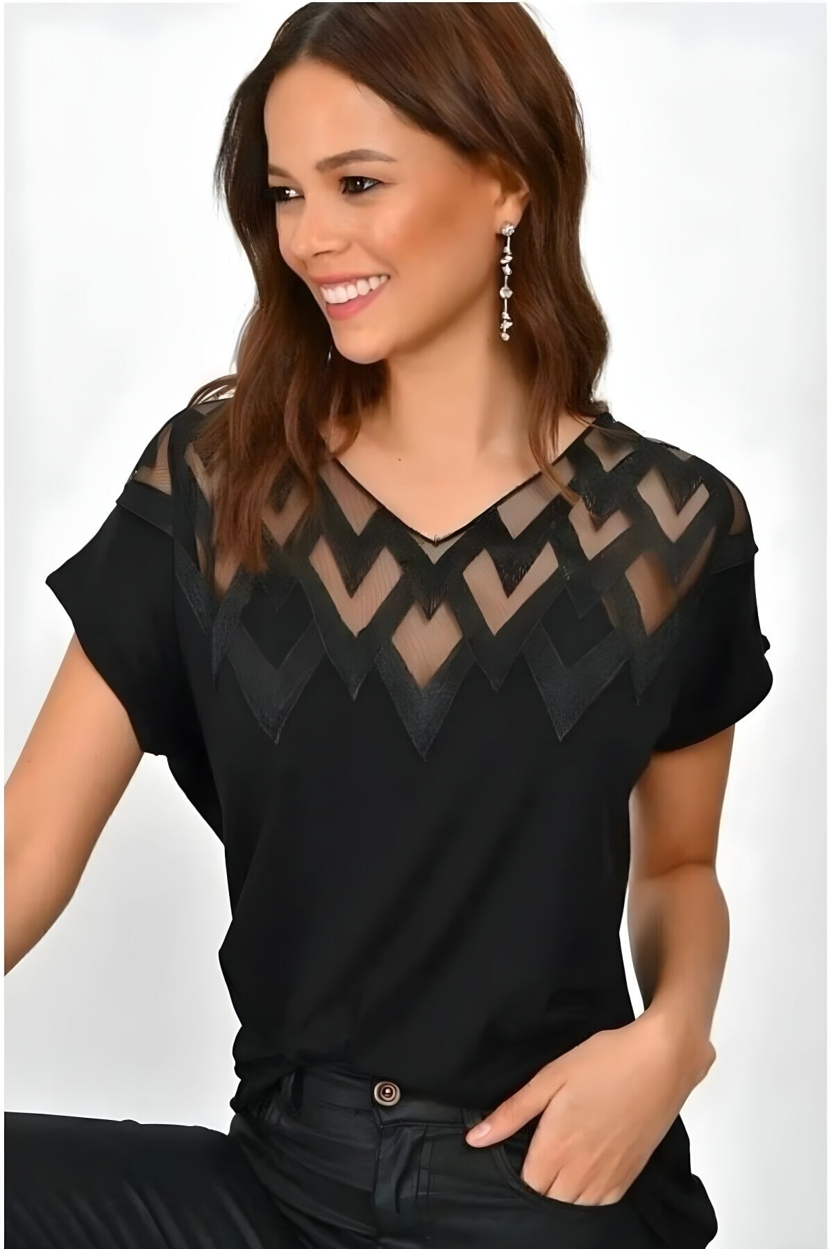 Short-Sleeved Embroidered Breathable Decollete Blouse - Black