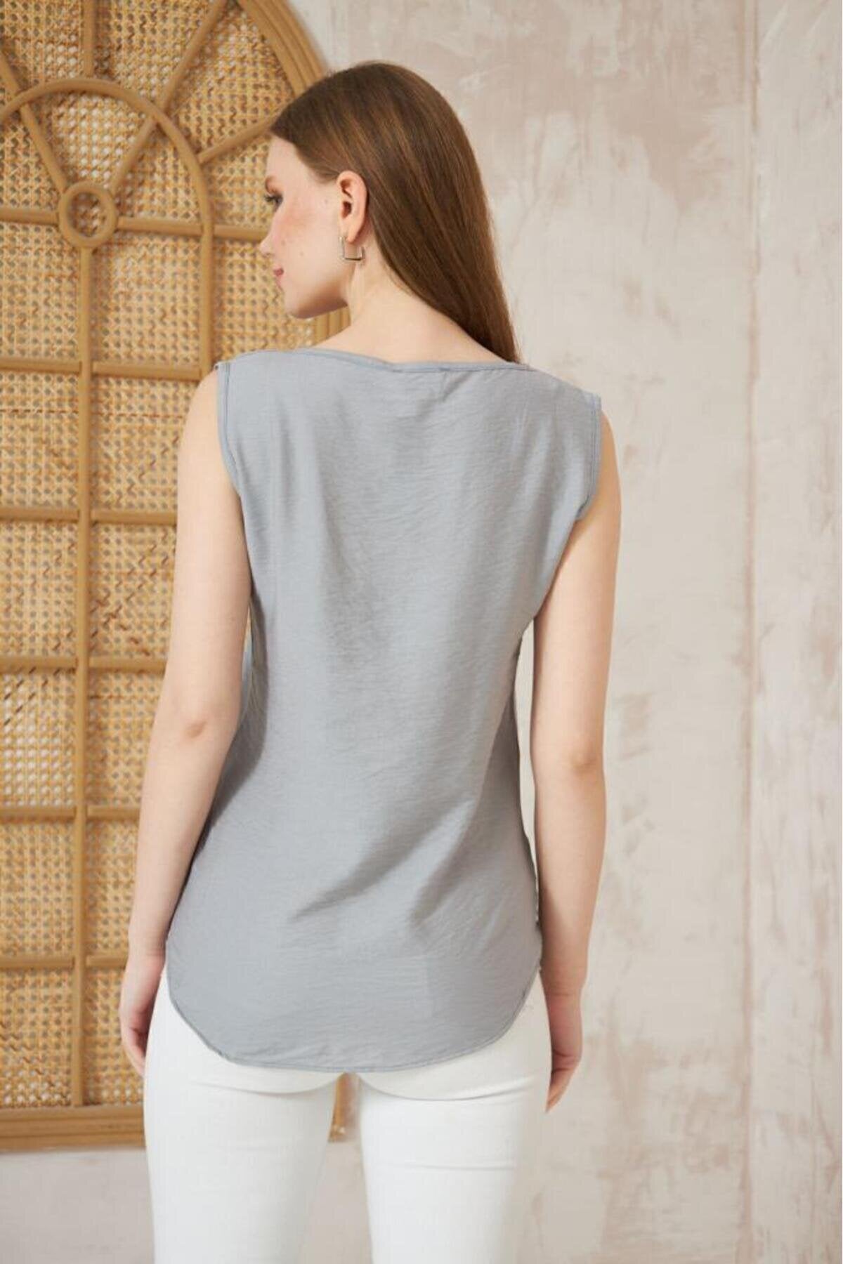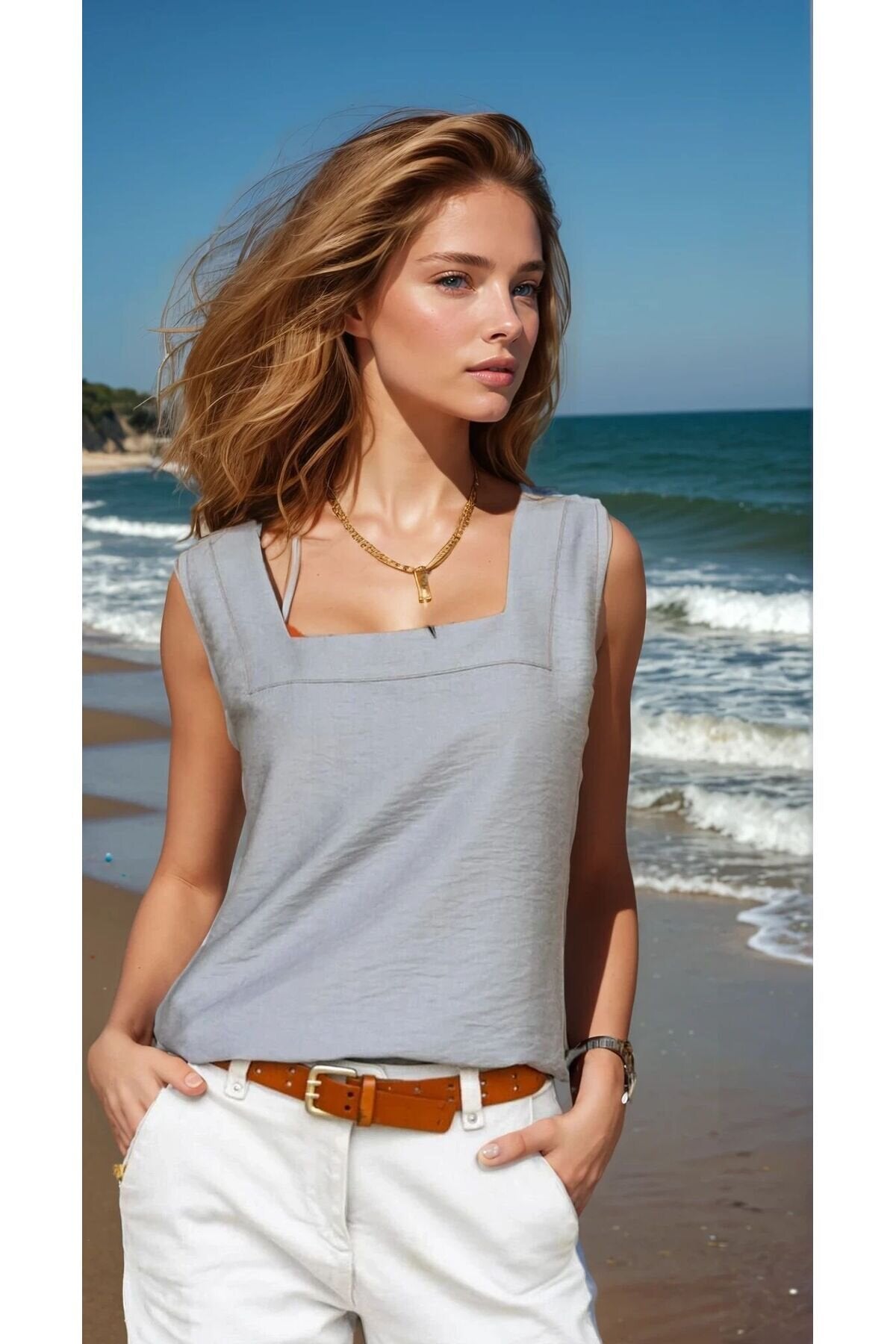 Summer Linen Square Neck Thick Strap Blouse - Gray