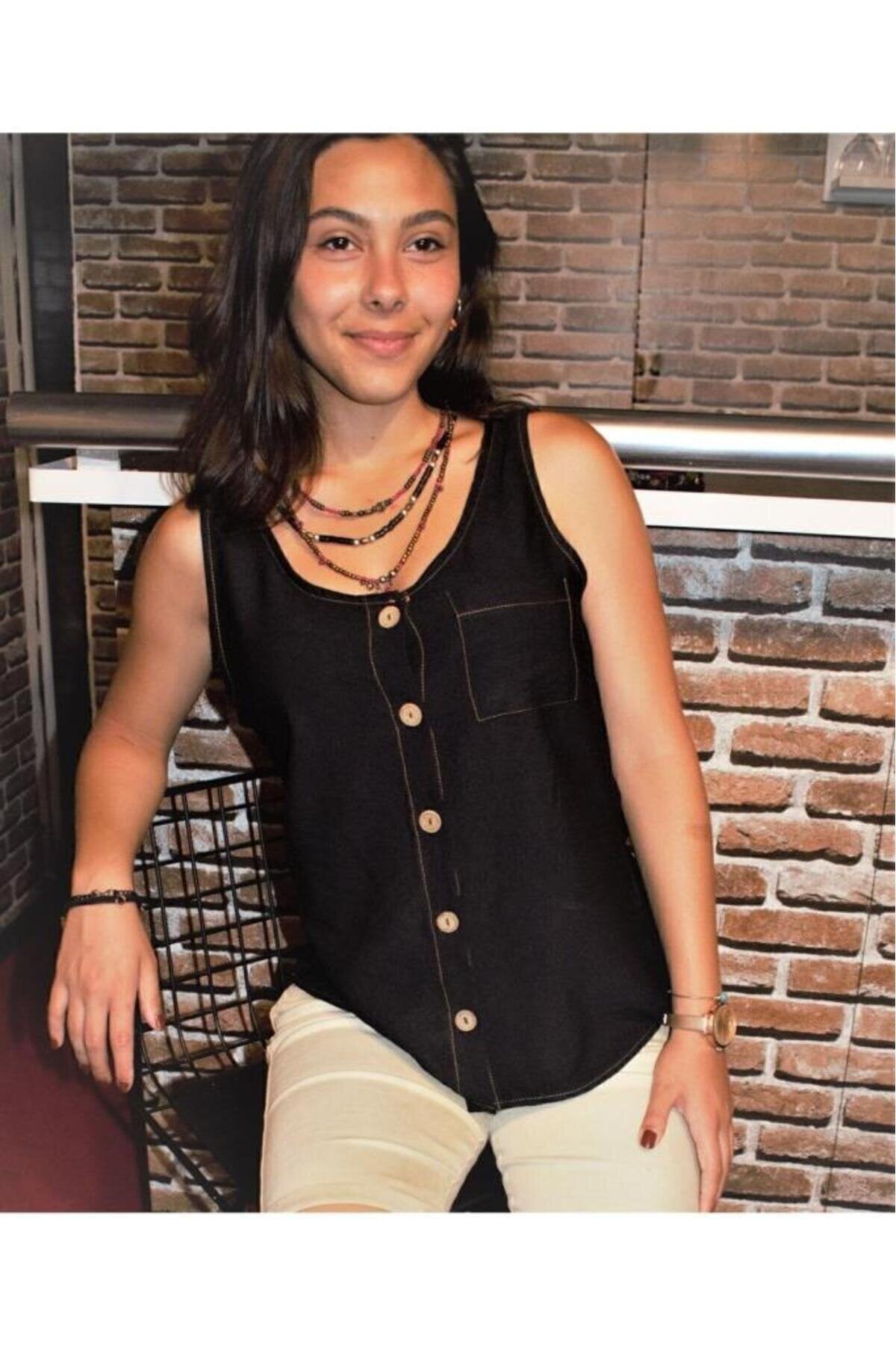 Thick Strap Linen Buttoned Blouse - Black