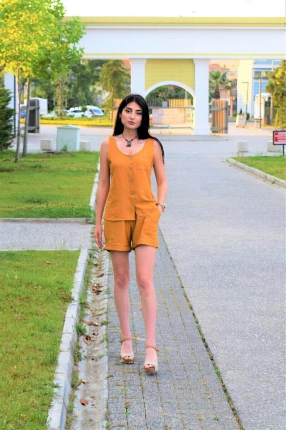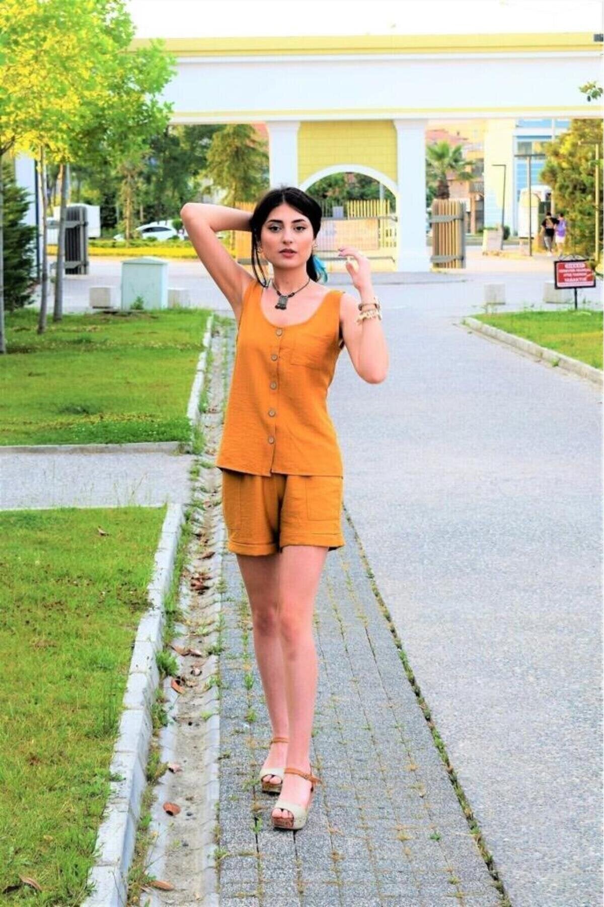 Thick Strapped Linen Round Neck Buttoned Blouse - Mustard