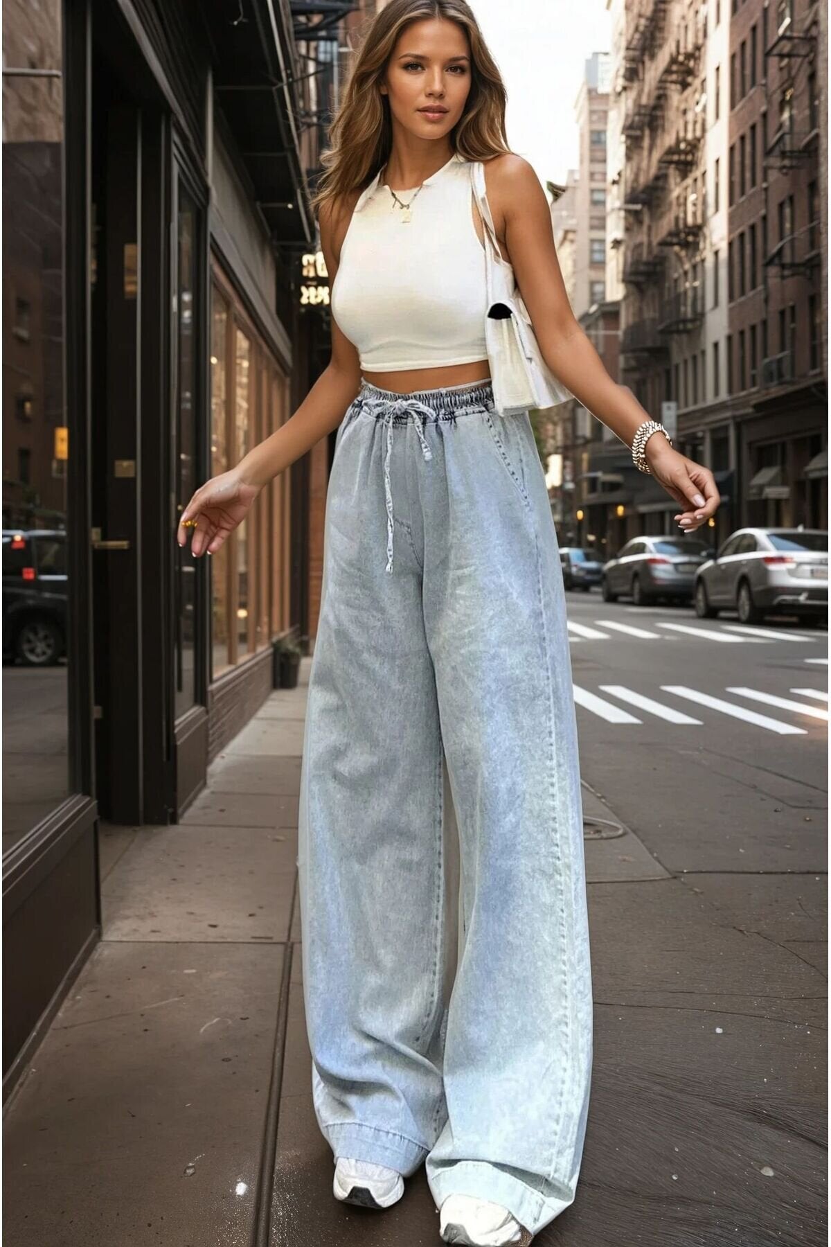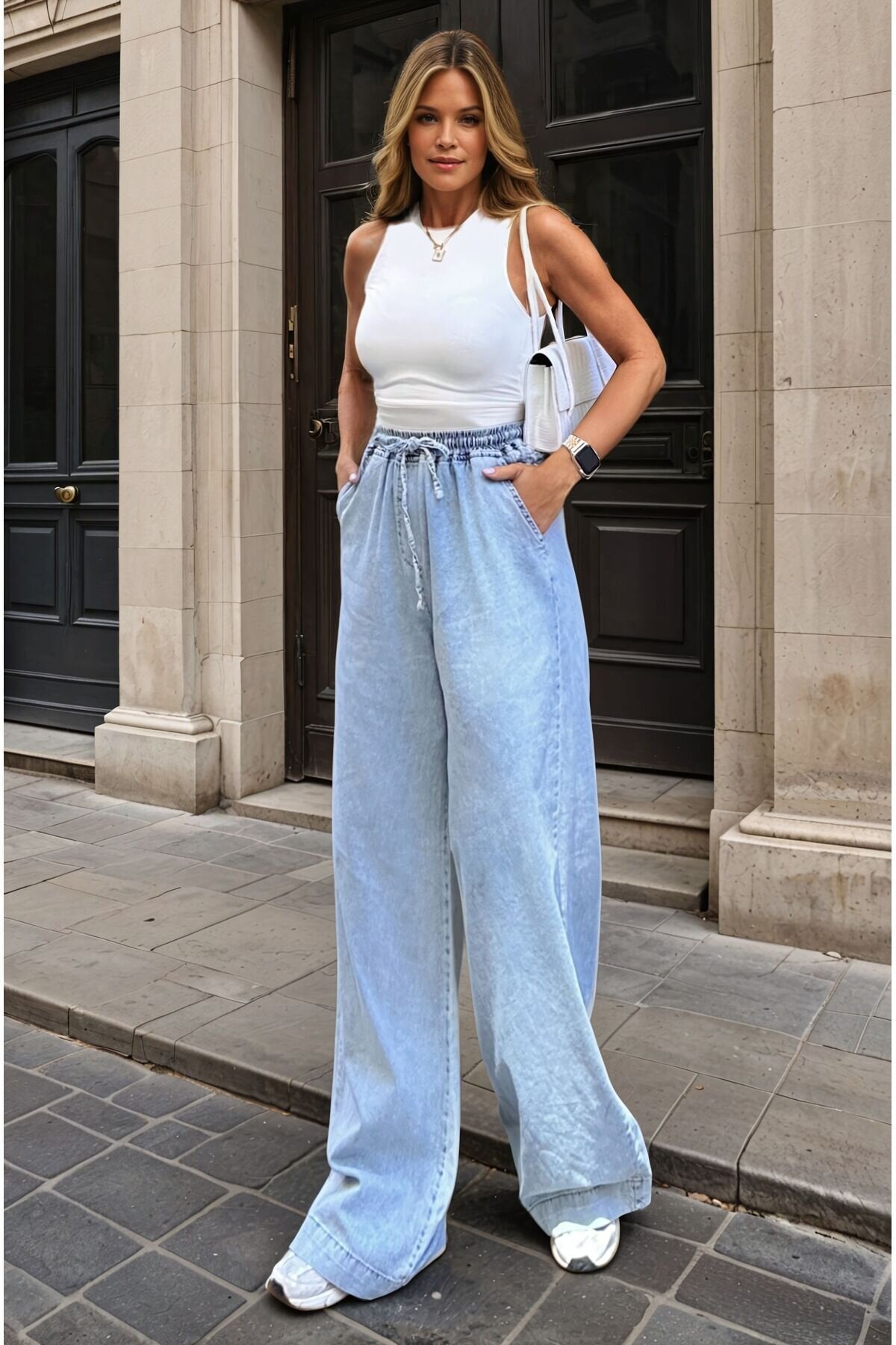 Thin Denim Wide Leg Lace-up Elastic Waist Pants - Blue