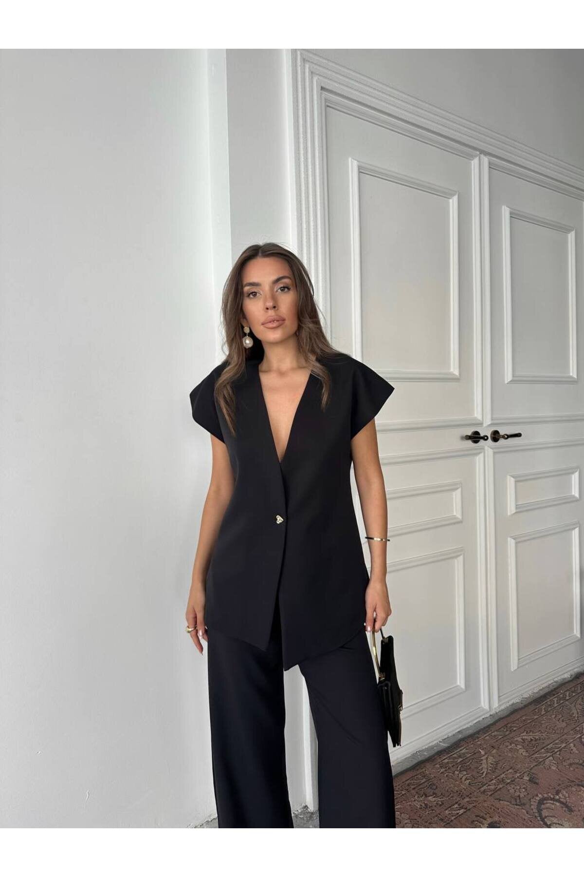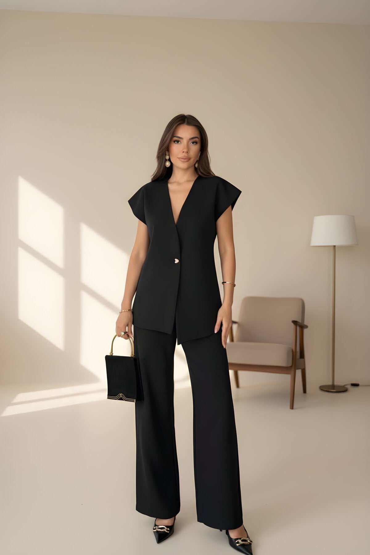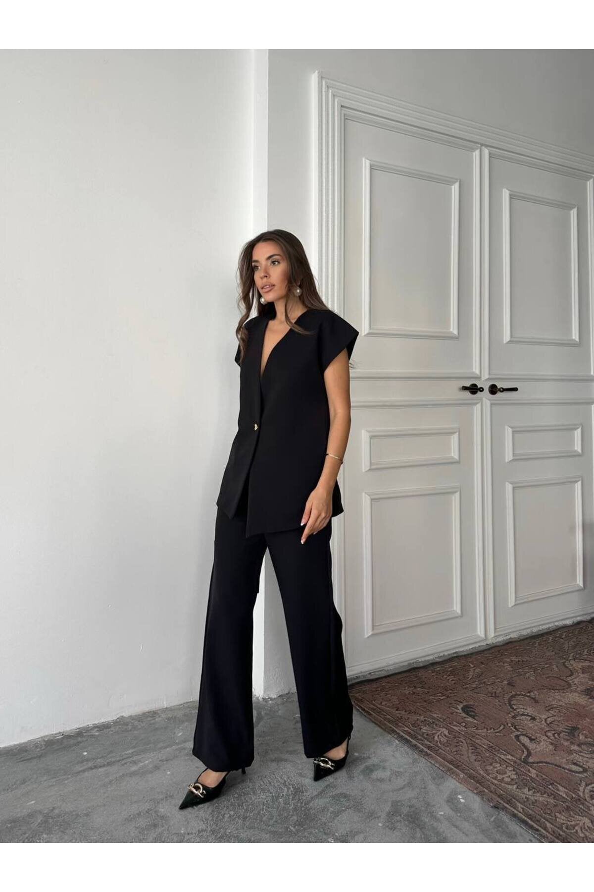 This vest-pant set features a half-placket button closure detail, offering a chic and modern look. Its unprinted design creates a simple and elegant style, while its double-pocketed structure provides practical use. Thanks to its lined design, this set can be comfortably chosen, enhancing your comfort in daily wear. With its buttoned design, this set can be easily opened and closed, allowing you to maintain your elegance in any setting. These pants, featuring a wide-leg cut, create a trendy silhouette, offering freedom of movement and a comfortable fit with their oversized cut. When cared for according to washing instructions, it retains its initial quality for a long time; it can be chosen for all seasons. With its 99% cotton content, its breathable texture ensures you feel comfortable all day long. Featuring a V-neck detail and feminine lines, this set is presented to women with a young and dynamic style. While the high-waist design complements the modern cut, the sleeveless top piece provides a cool feeling during summer months. It allows you to look stylish even in trendy settings; it is ideal for daily use. The woven fabric type increases durability, helping the product maintain its shape. Specially designed for women / girls, it fits every size with standard length options.